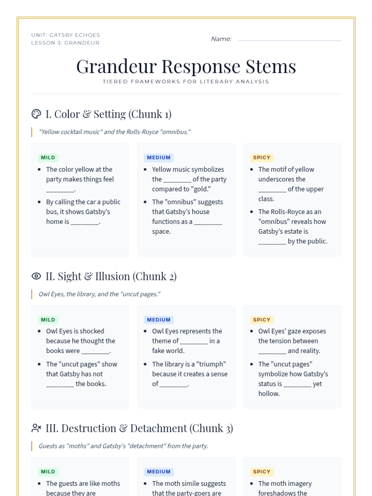An investigation into the rich symbolism present in Chapter 3 during one of Gatsby's lavish parties. Students decode the meaning behind objects like the library books and the yellow car to understand the era's superficiality.