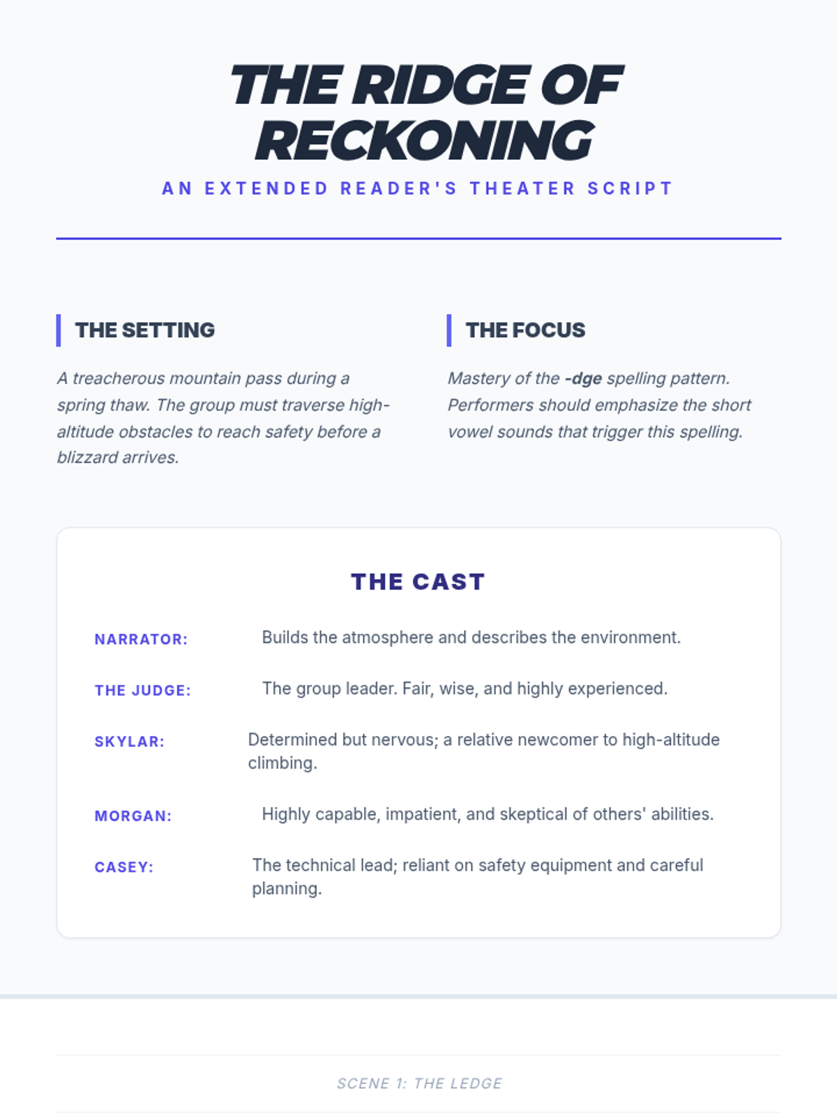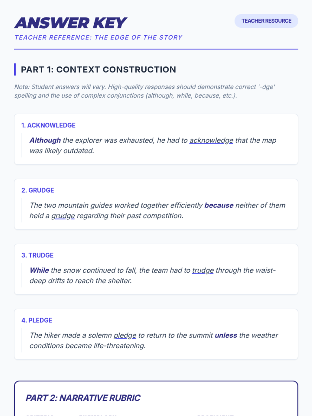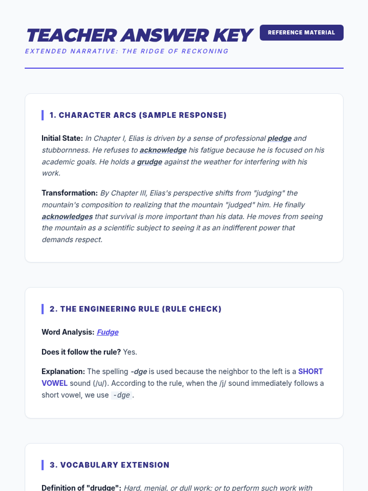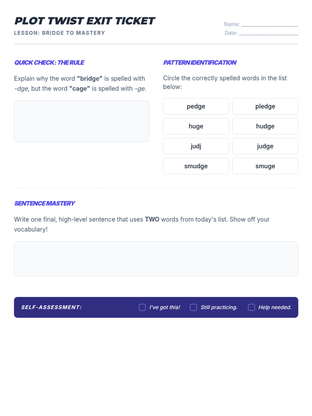 A focused lesson on the '-dge' spelling pattern, exploring vocabulary through sentence construction and narrative writing for middle school students.