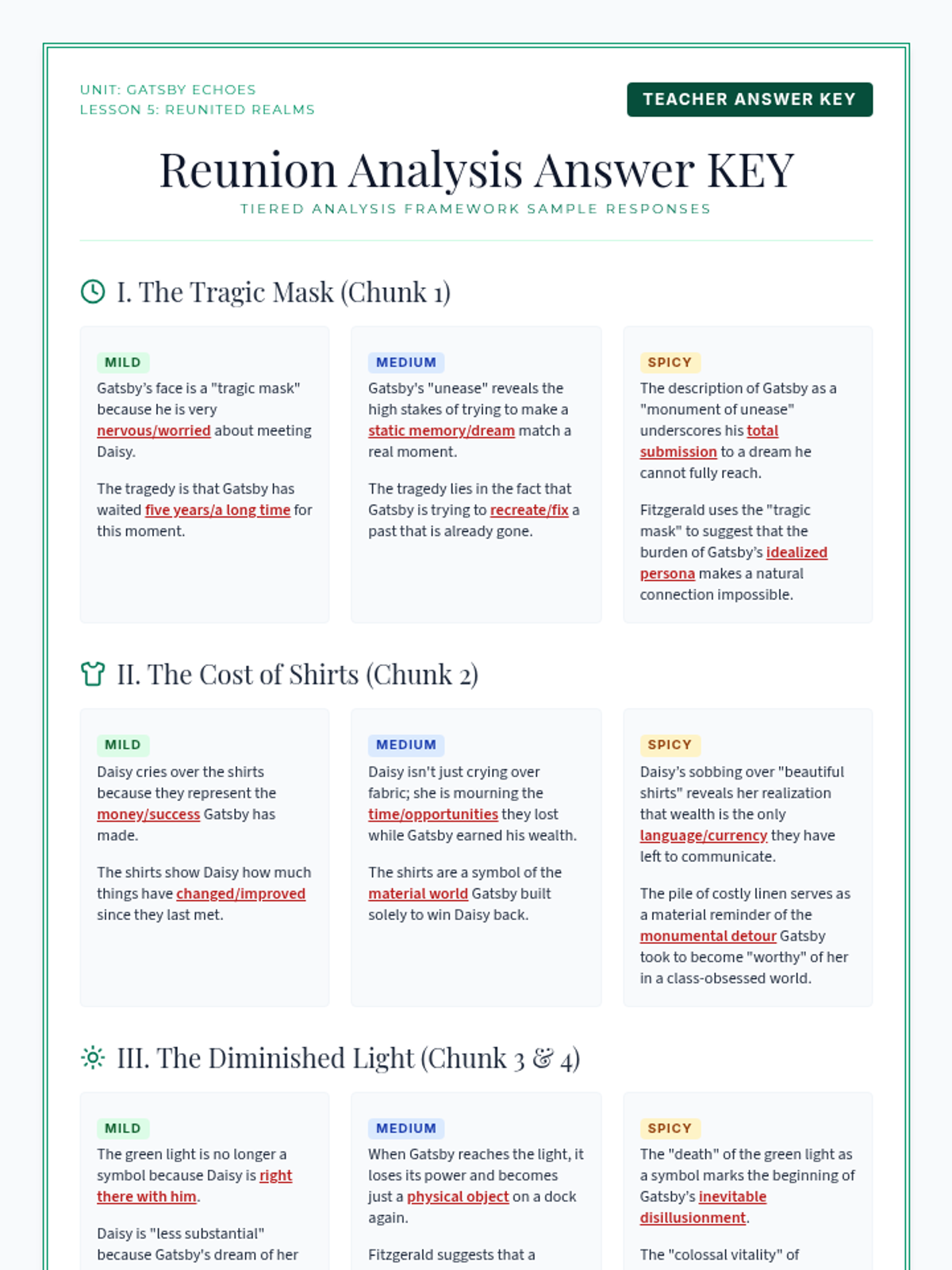 A thematic analysis of Chapter 5, centered on the reunion of Gatsby and Daisy. Students explore themes of the past, hope, and the fine line between dreams and illusions.