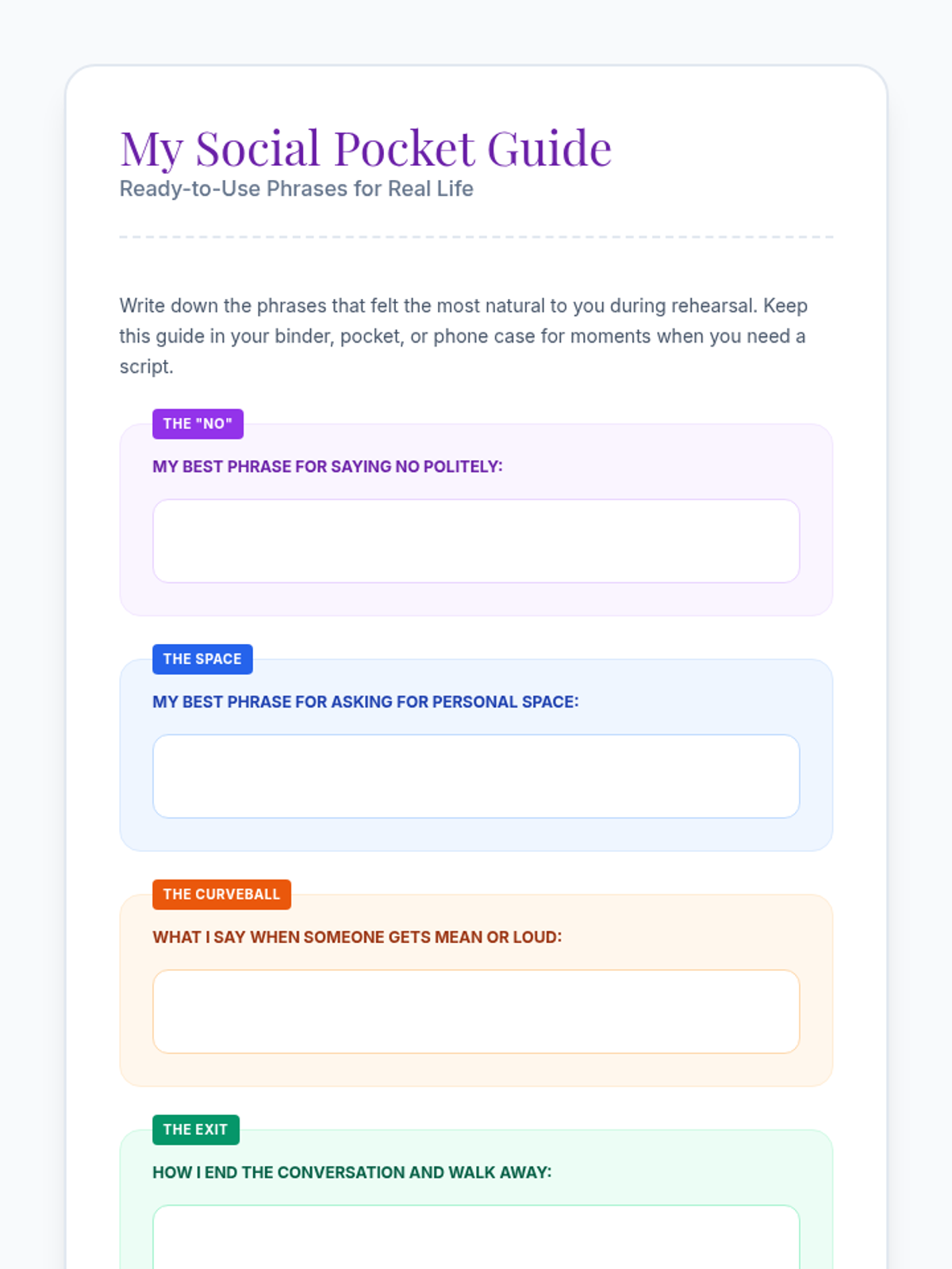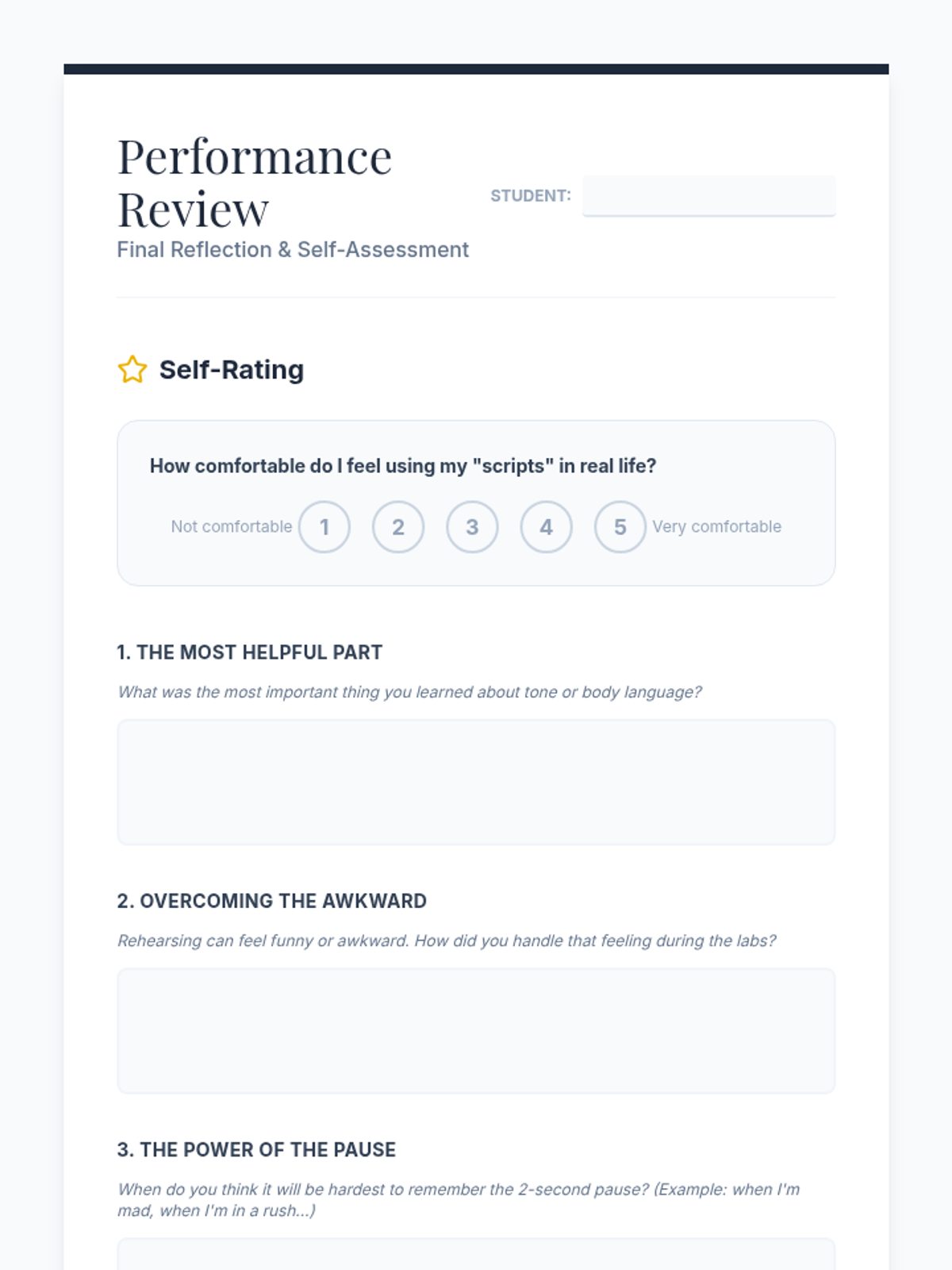 Students reflect on their rehearsals, revise their scripts for better flow, and create a portable 'cheat sheet' of social phrases.