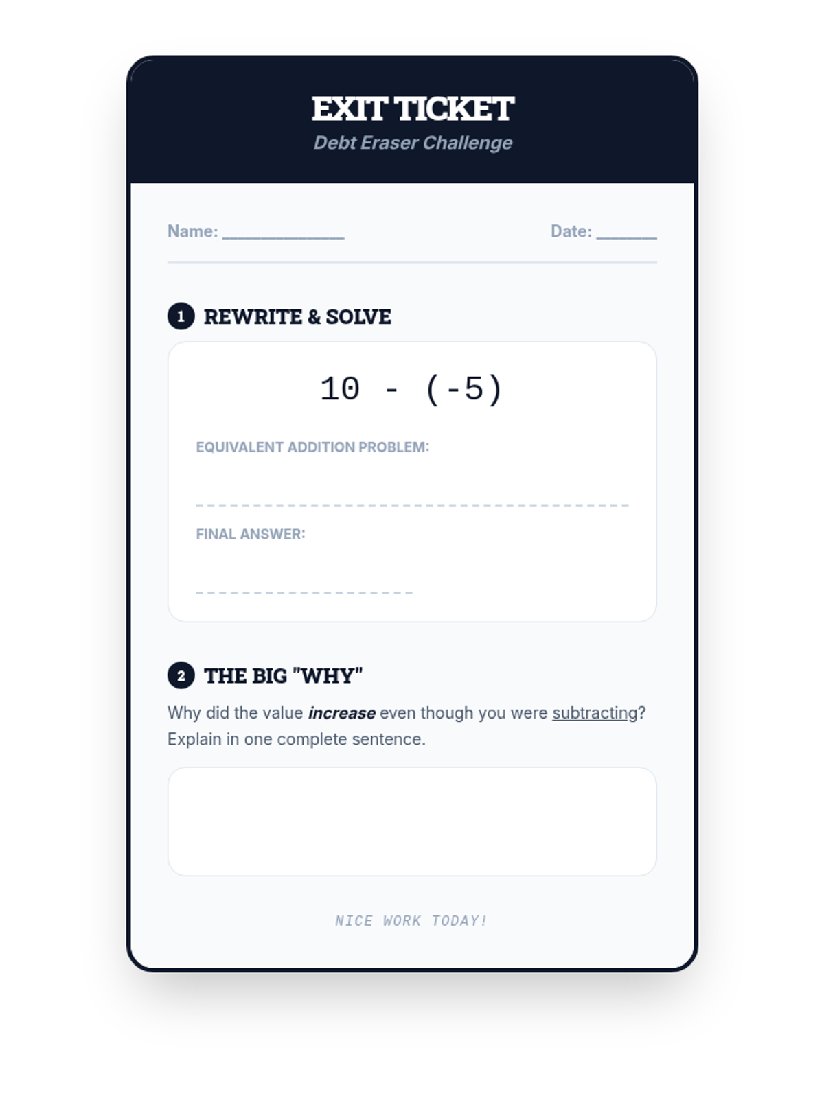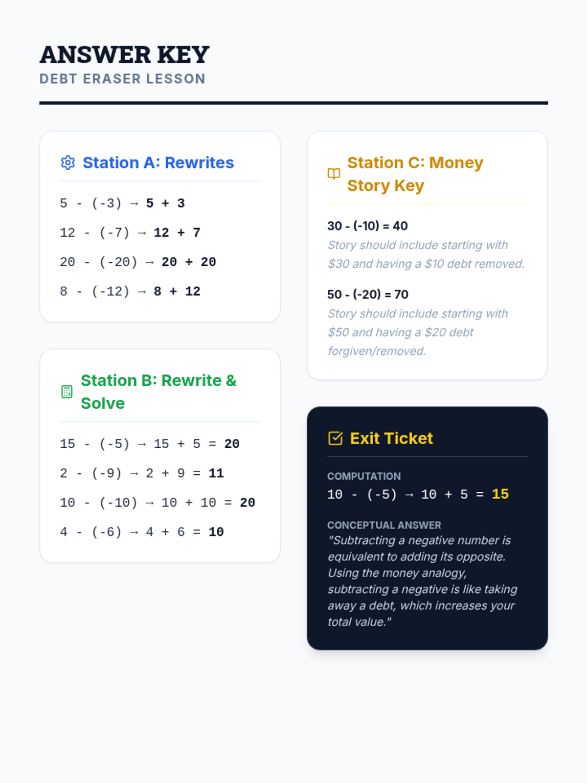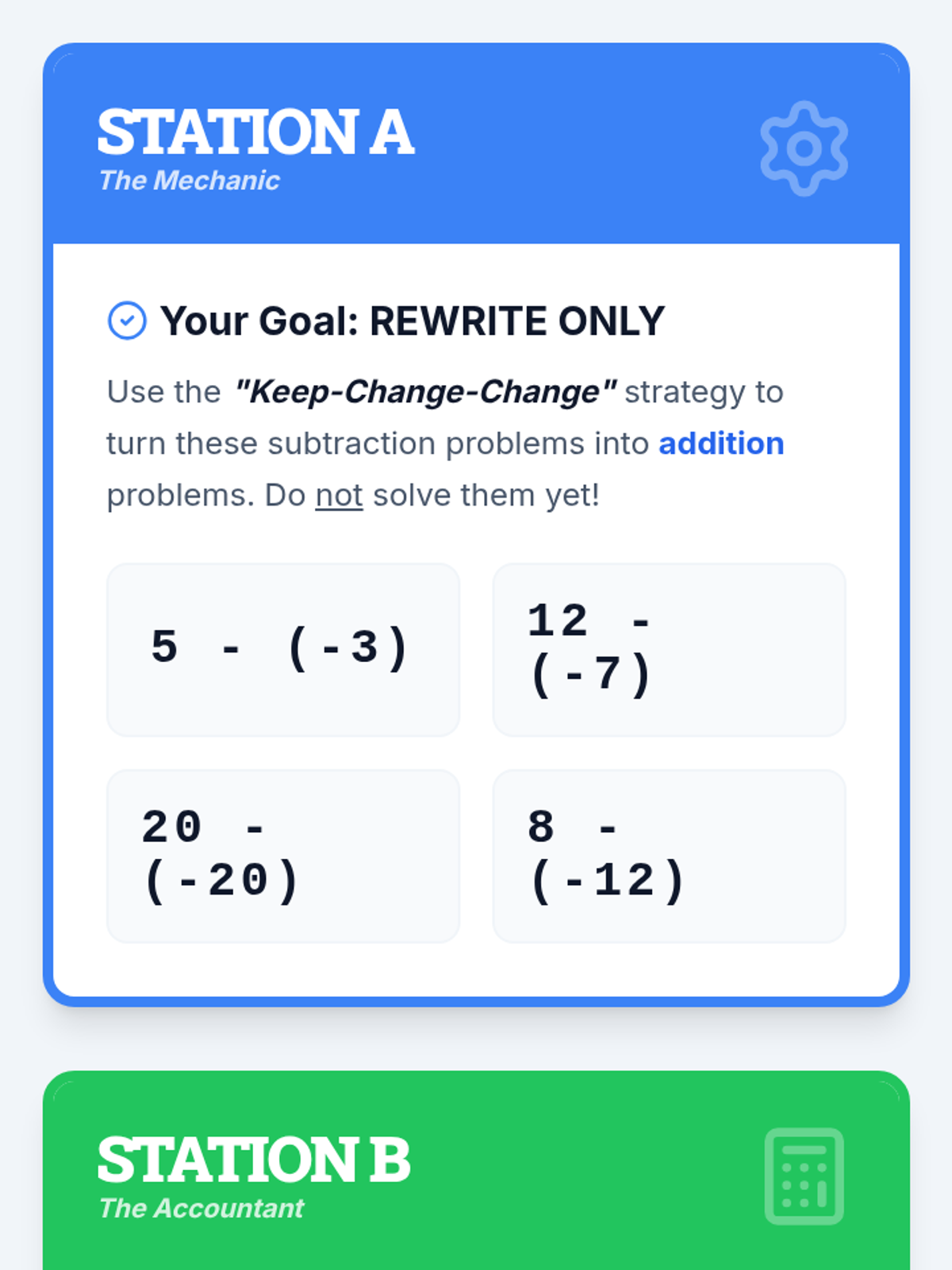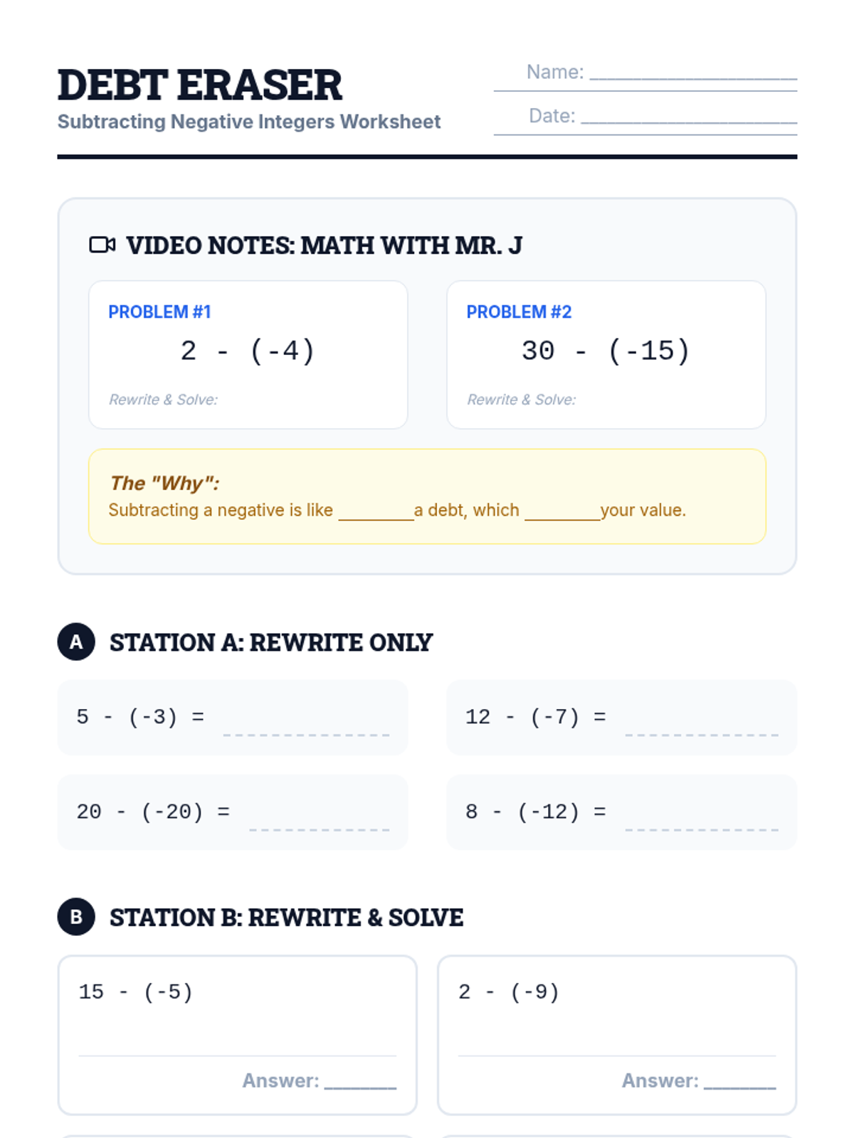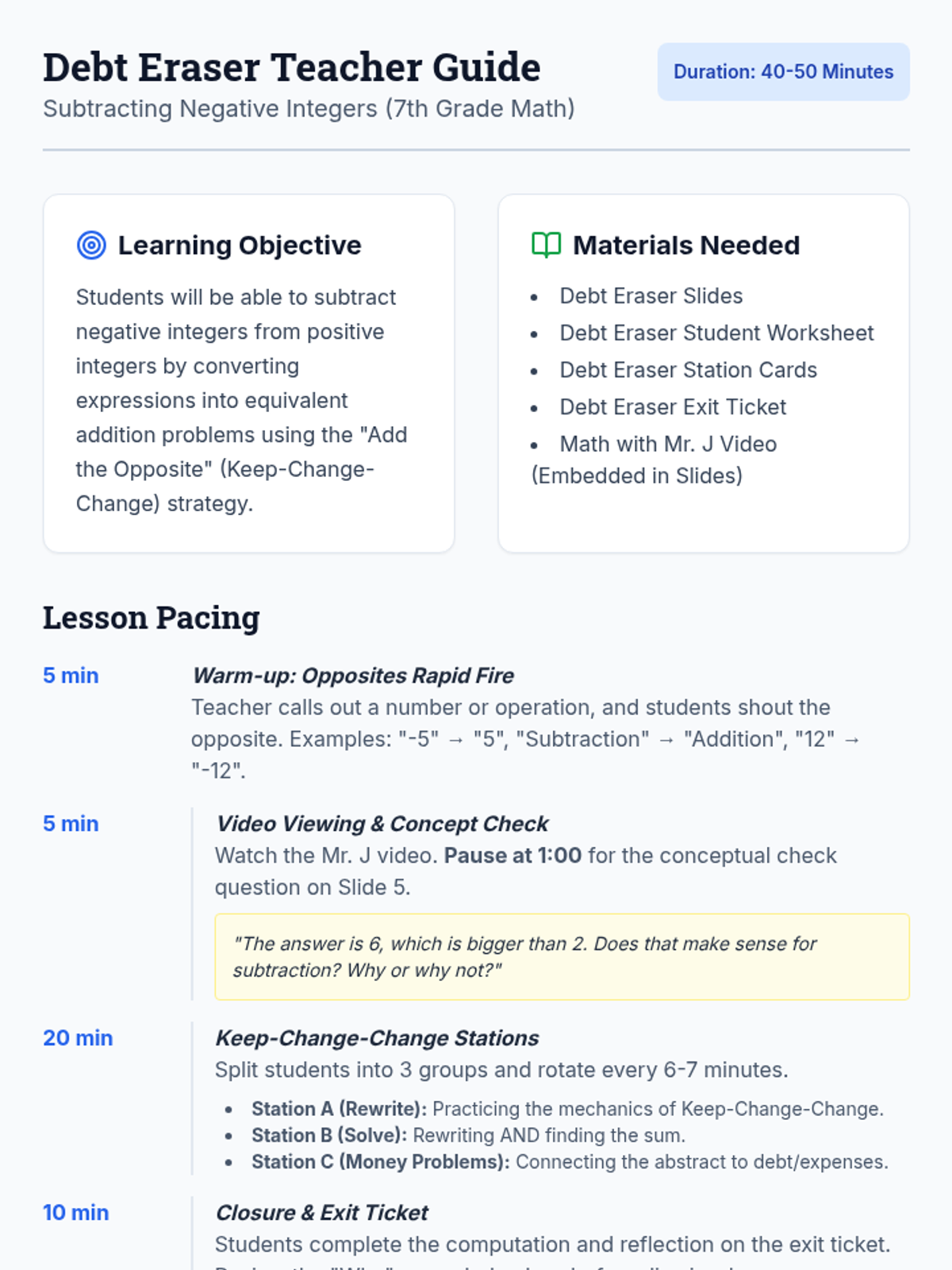 A 7th grade math lesson on subtracting negative integers from positive integers using the 'Add the Opposite' strategy, featuring a video by Mr. J and a three-station rotation activity.