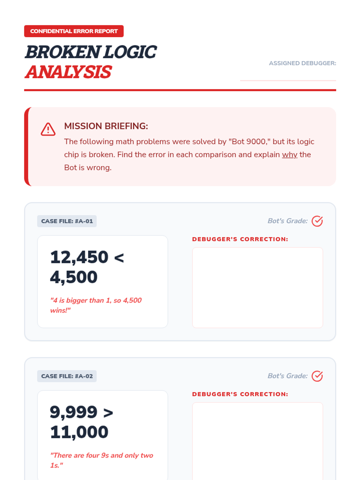 Students act as math detectives to identify, analyze, and correct common misconceptions in number comparison, such as 'comparing digits' rather than 'comparing values.'