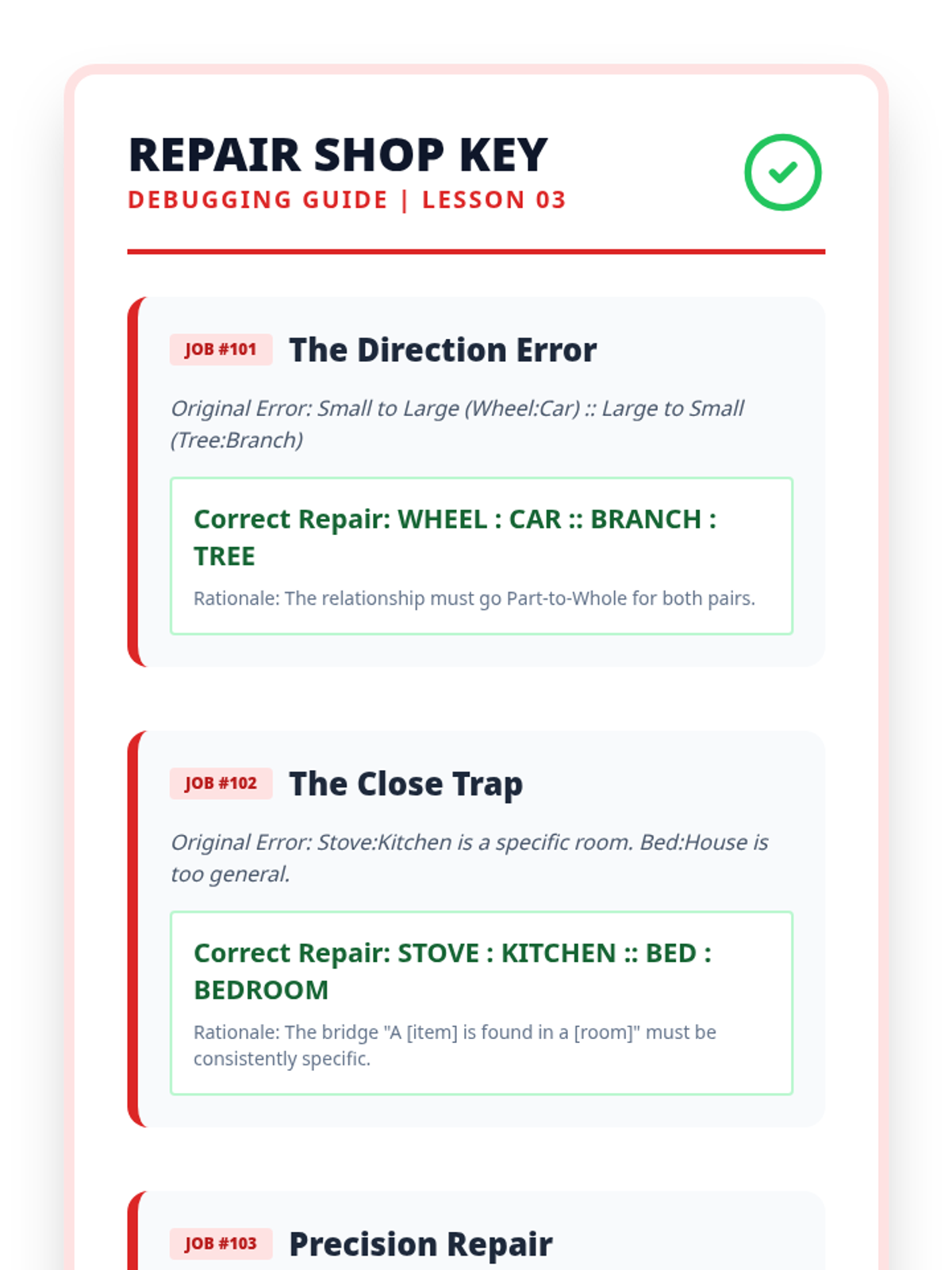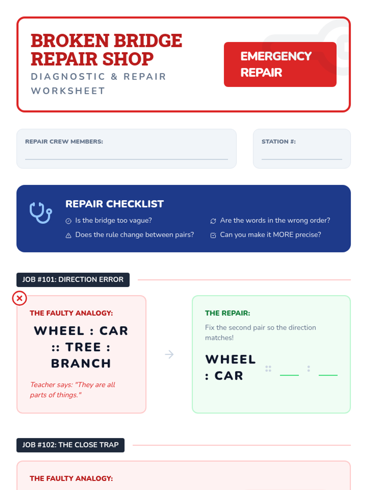 Students analyze common errors and 'tricky' questions where relationships seem close but aren't exact. They work in groups to fix broken analogies by adjusting the bridge sentences.