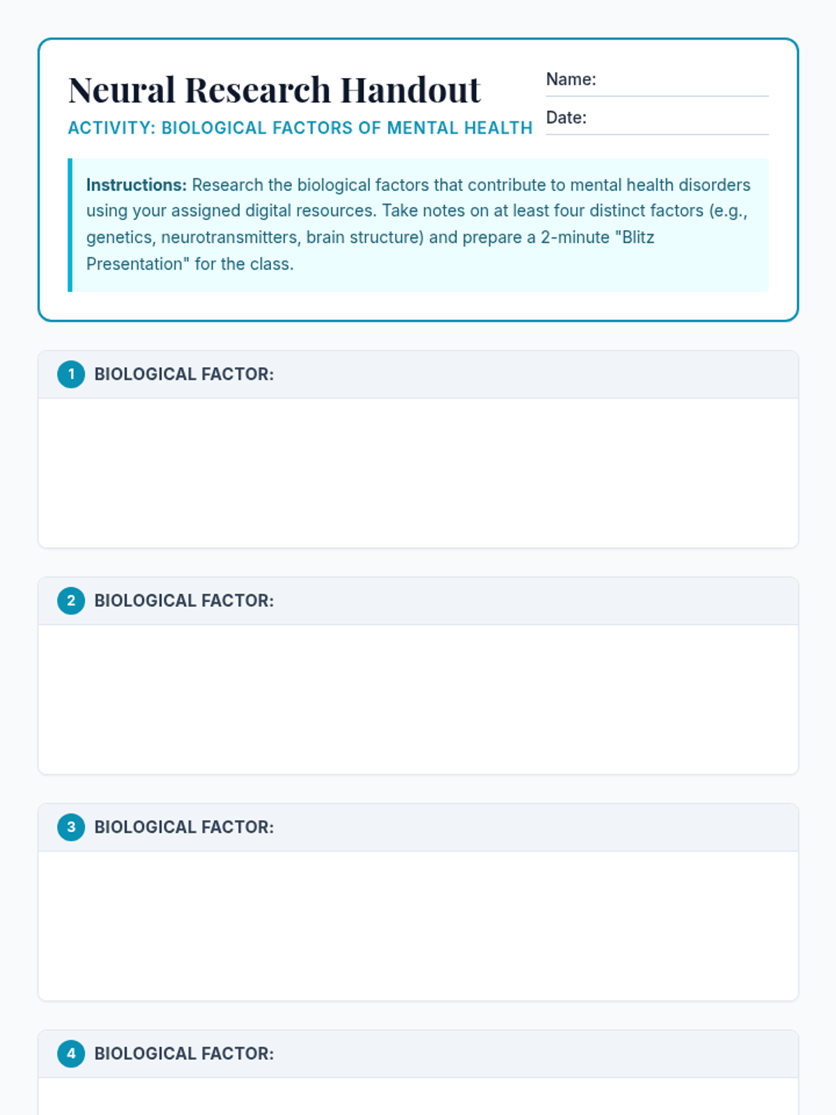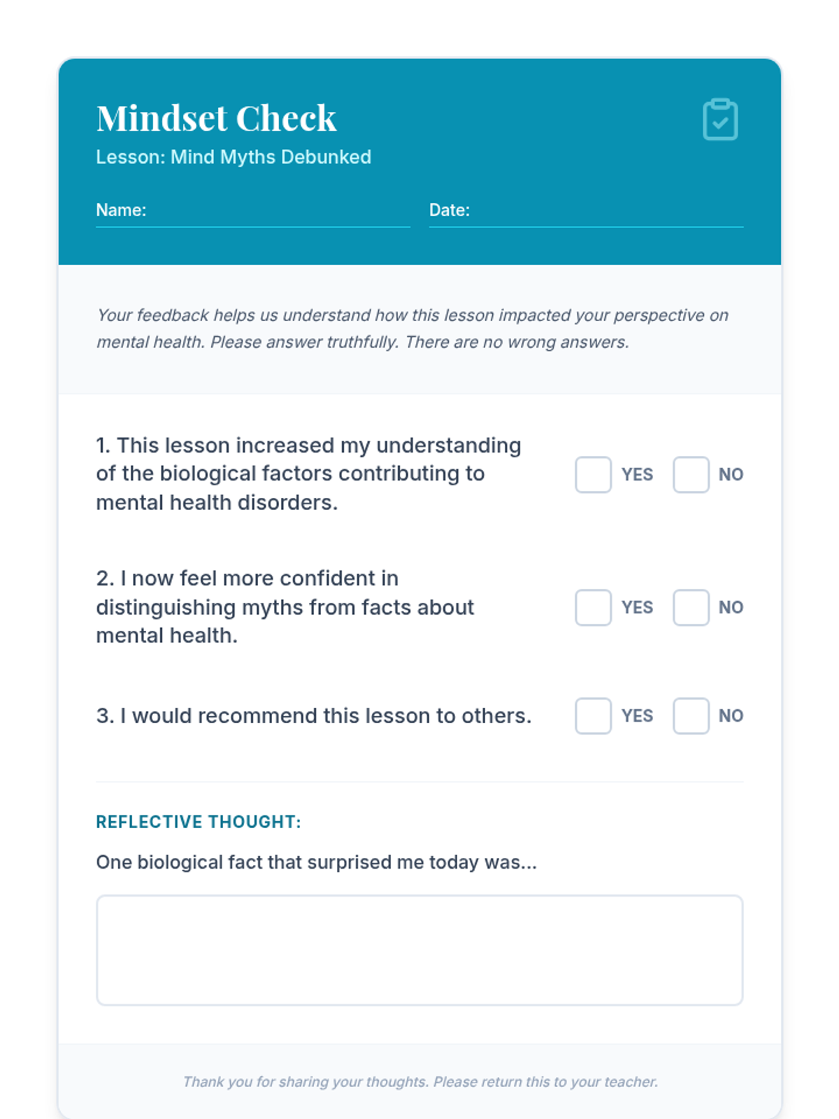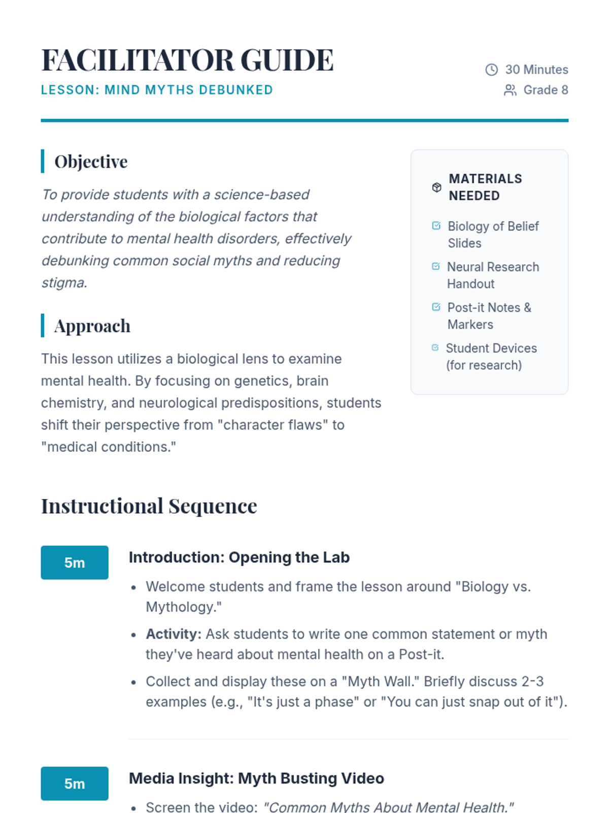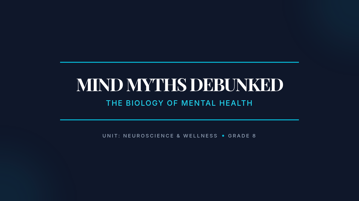 An 8th-grade lesson focused on debunking mental health myths and exploring the biological factors—such as genetics and brain chemistry—that influence mental health. Students engage with video content, class discussions, and collaborative research to build a science-based understanding of mental wellness.