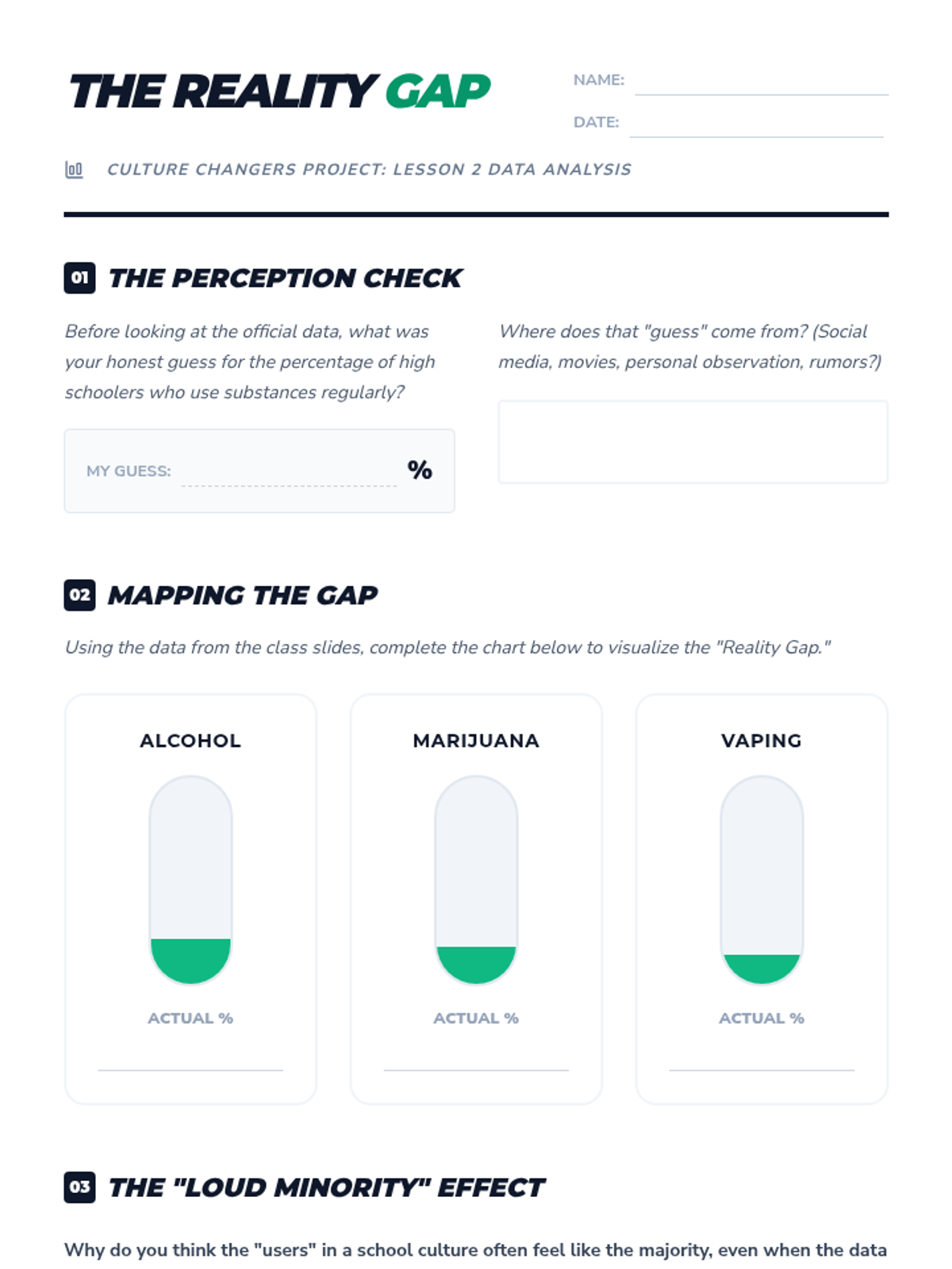 Students compare perceived norms of teen substance use with actual data to correct the 'everyone is doing it' fallacy.