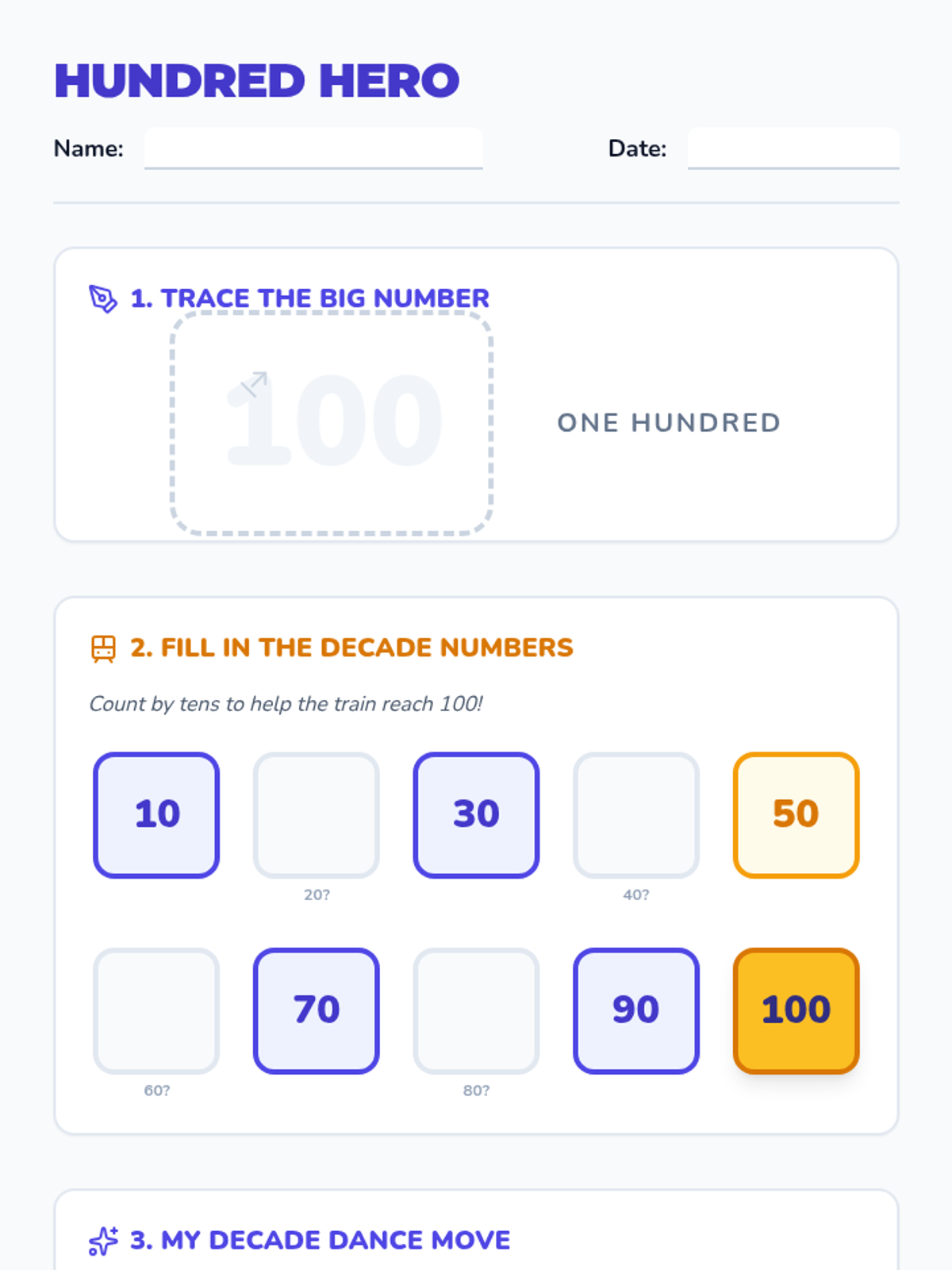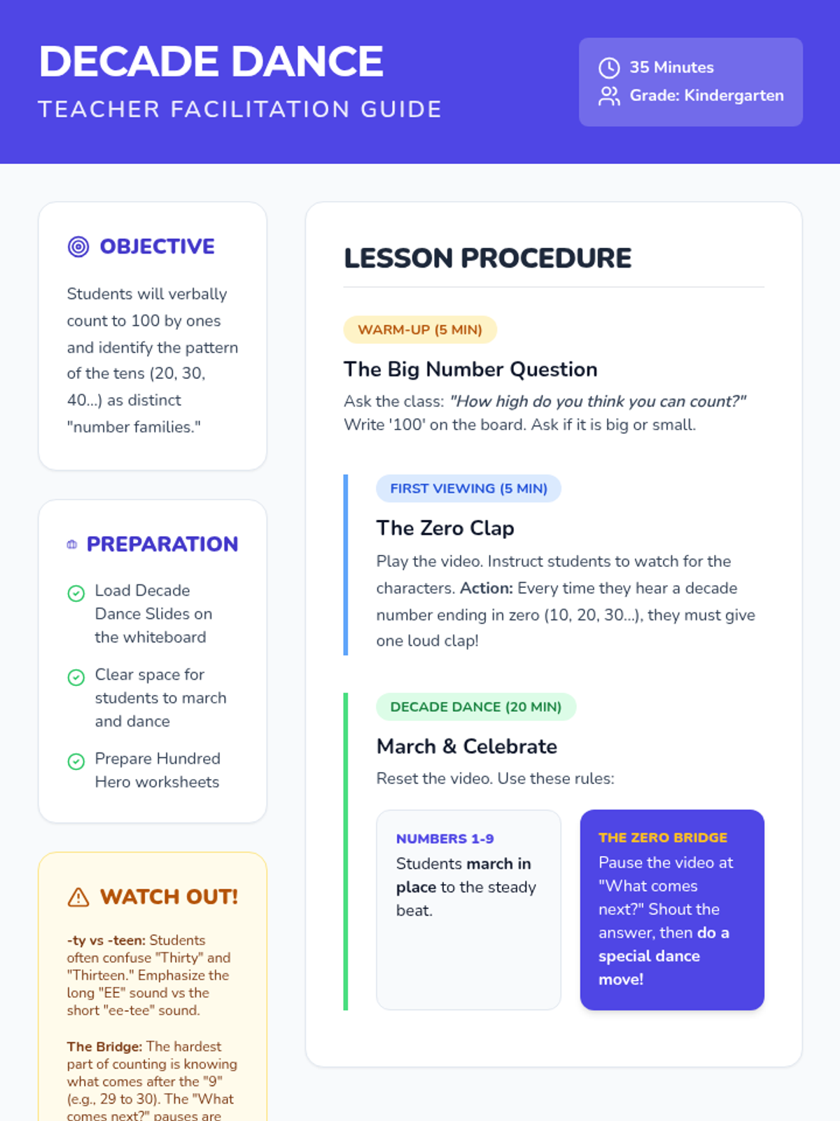 A high-energy Kindergarten lesson focused on counting to 100 and recognizing the decade transitions through movement and music. Students will march and dance their way to 100 while identifying patterns in number families.