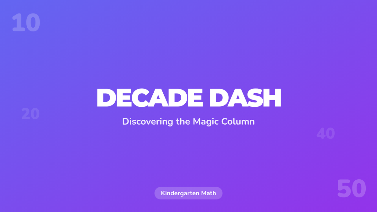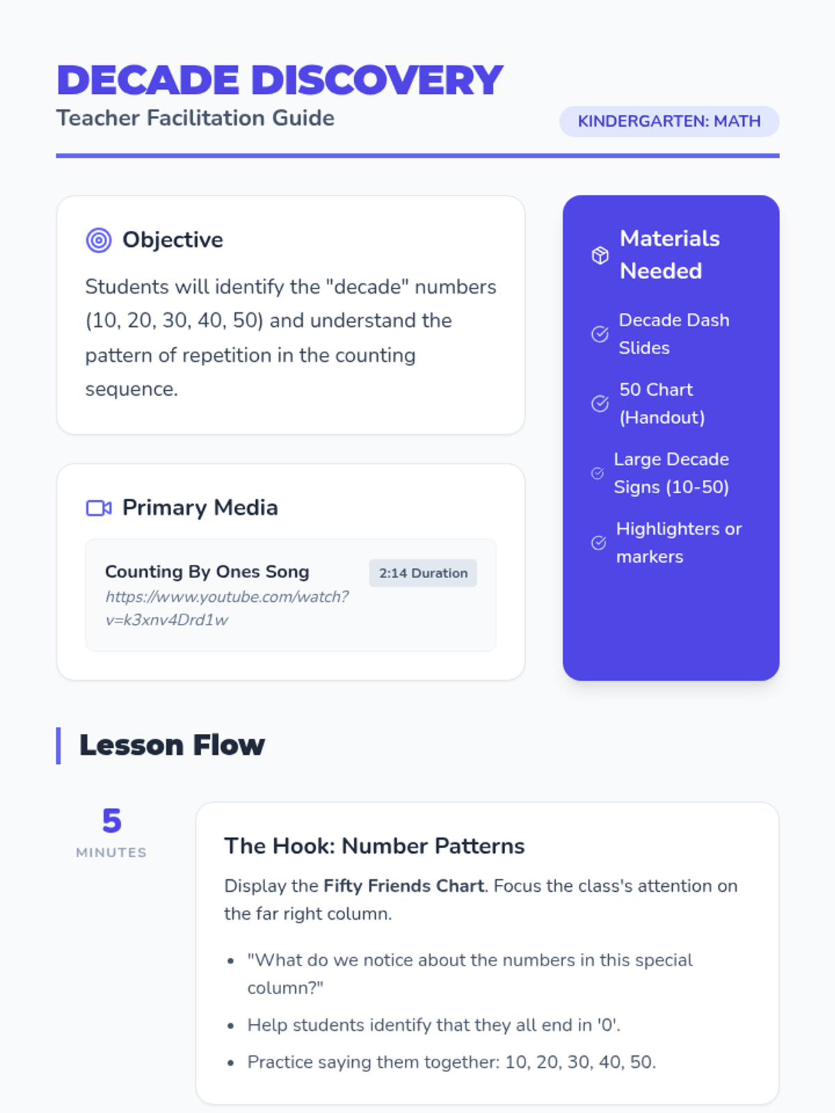 A Kindergarten lesson focused on identifying the decade numbers (10, 20, 30, 40, 50) through a 50s chart, interactive video movement, and pattern recognition.