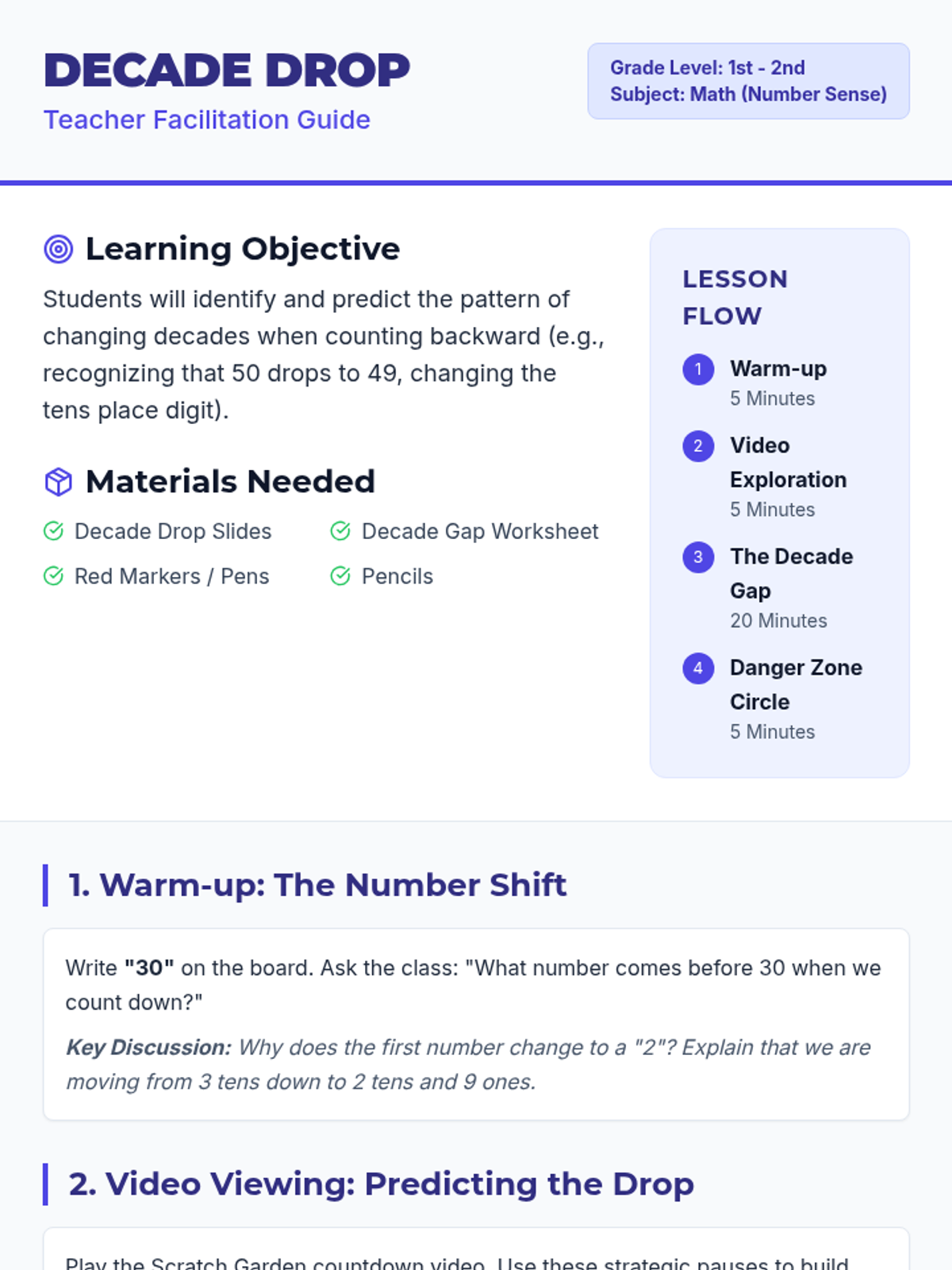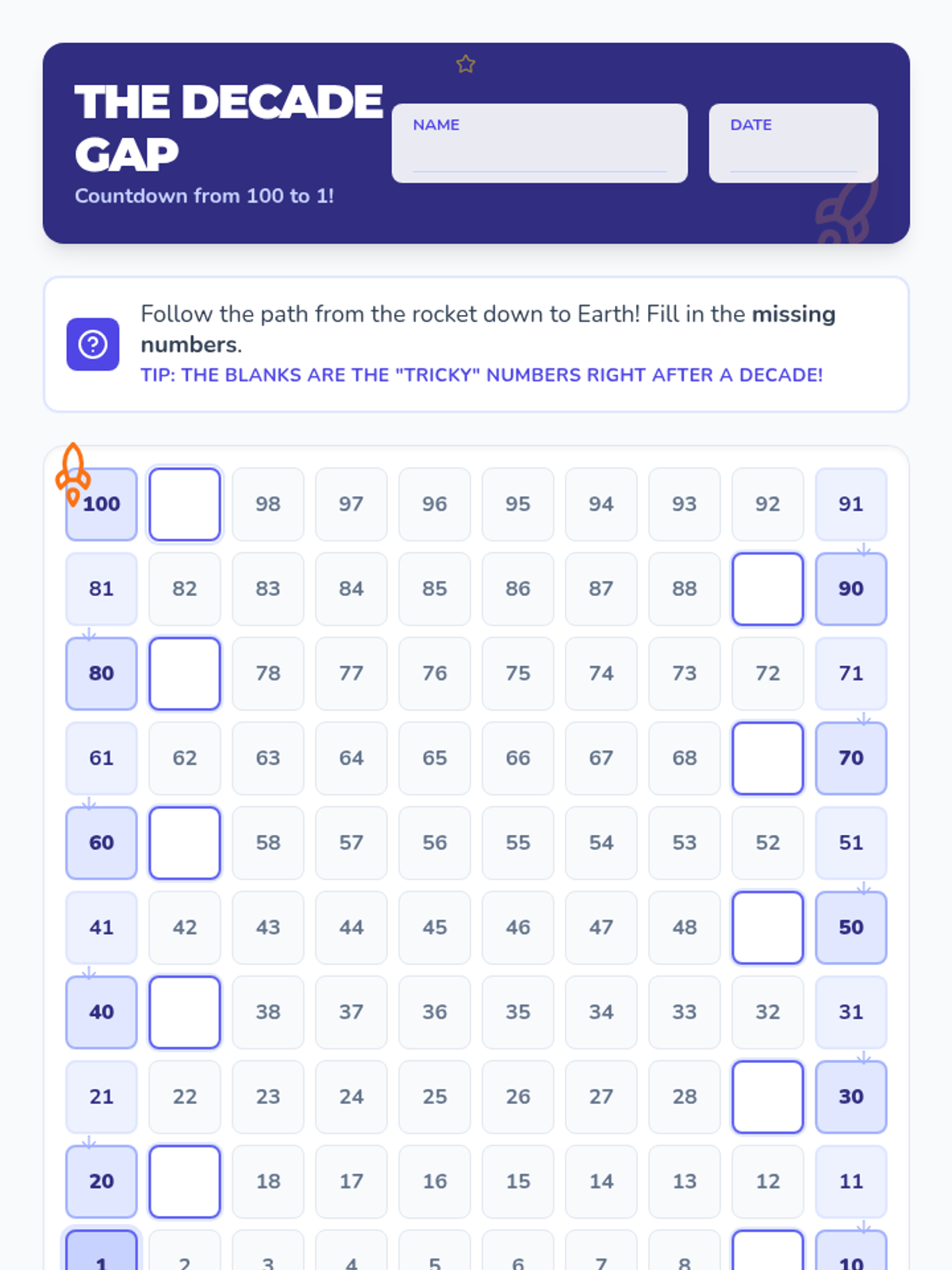 A math lesson for 1st and 2nd graders focusing on the tricky transitions between decades when counting backward from 100 down to 1.