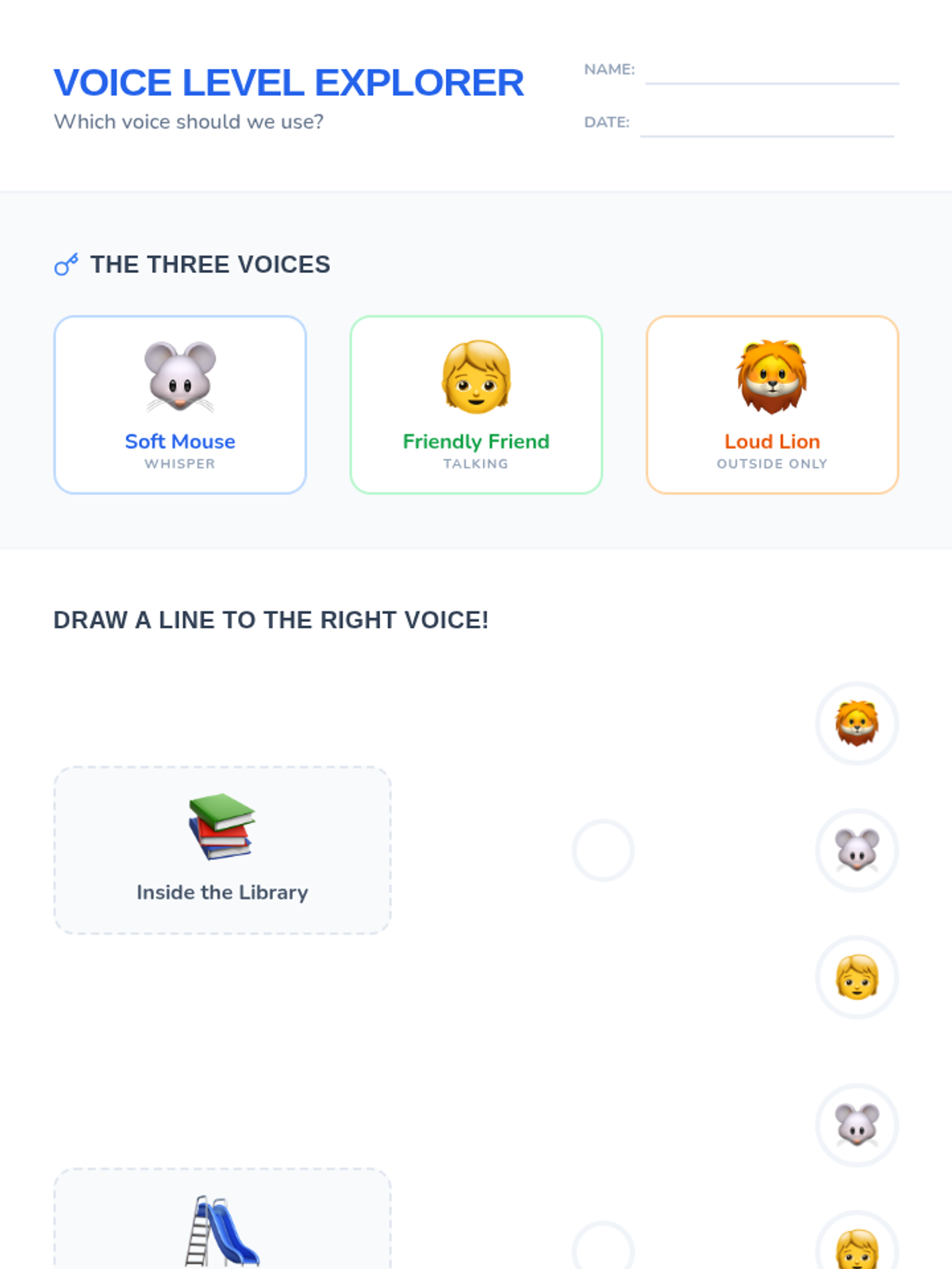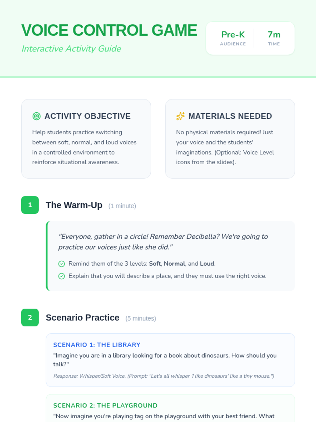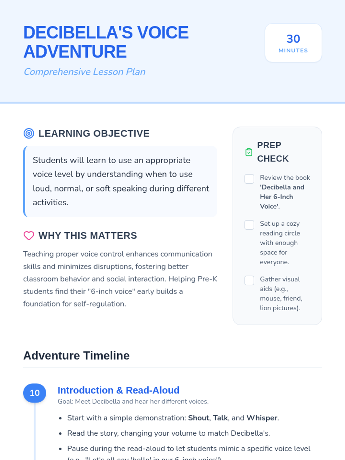 A 30-minute lesson for Pre-K students based on 'Decibella and Her 6-Inch Voice,' teaching appropriate voice levels through interactive storytelling and games.