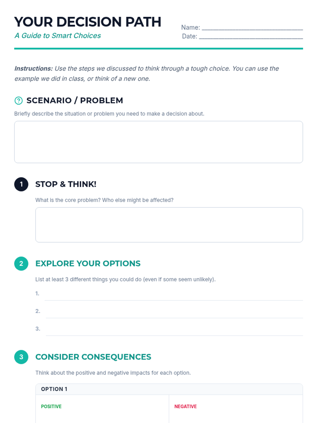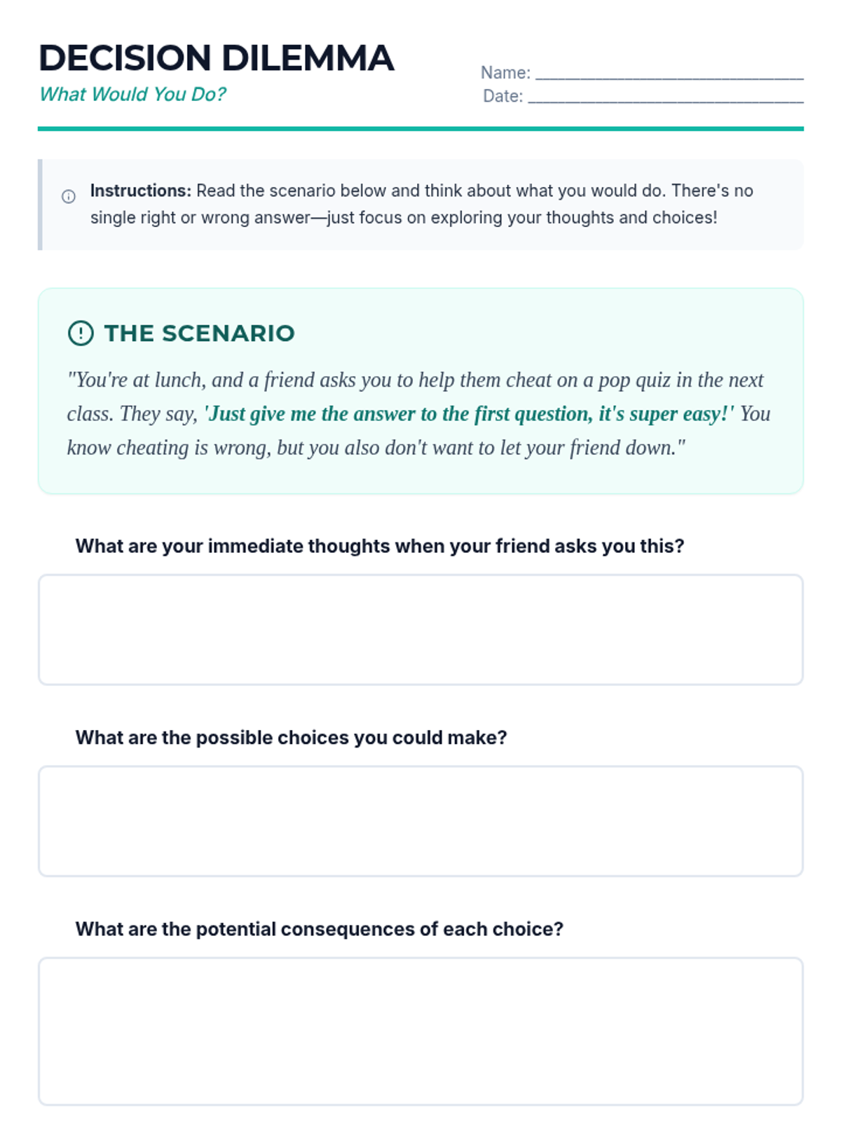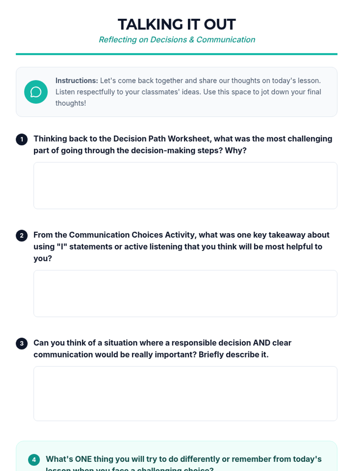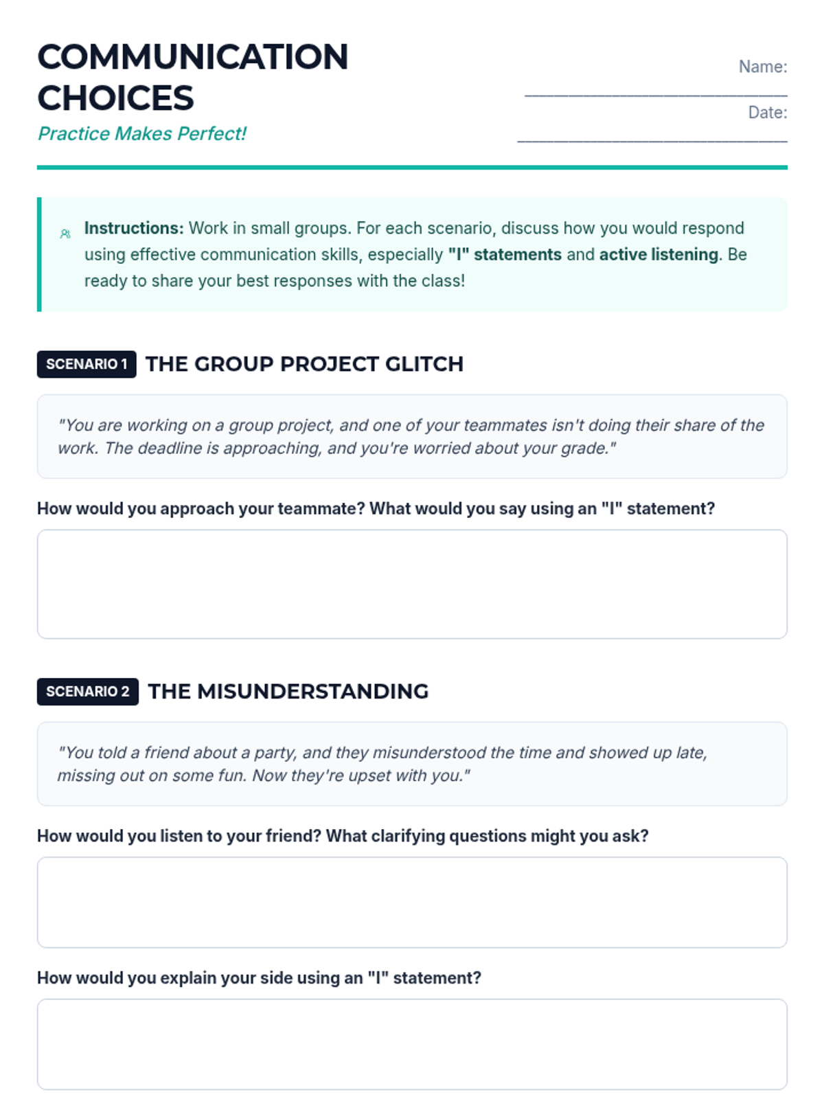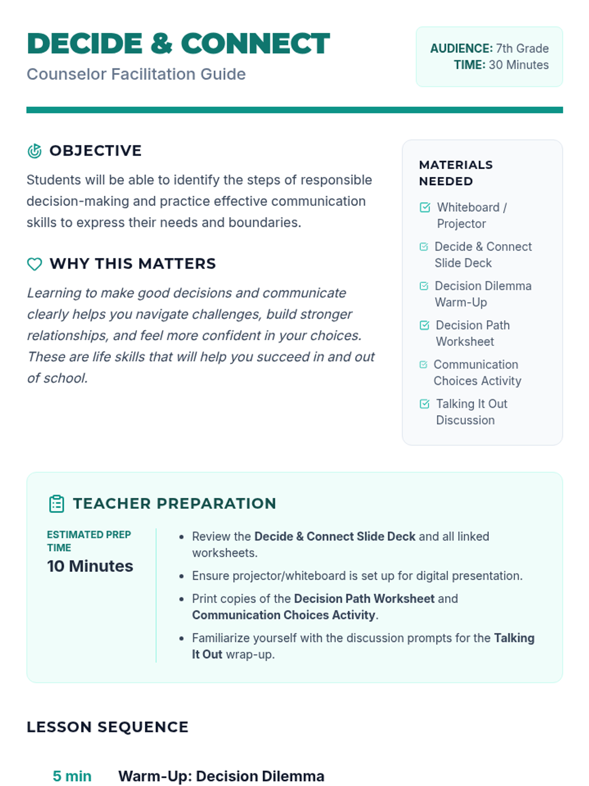 This 30-minute school counselor-led lesson empowers 7th-grade students with essential skills for responsible decision-making and effective communication through interactive scenarios and guided reflection.