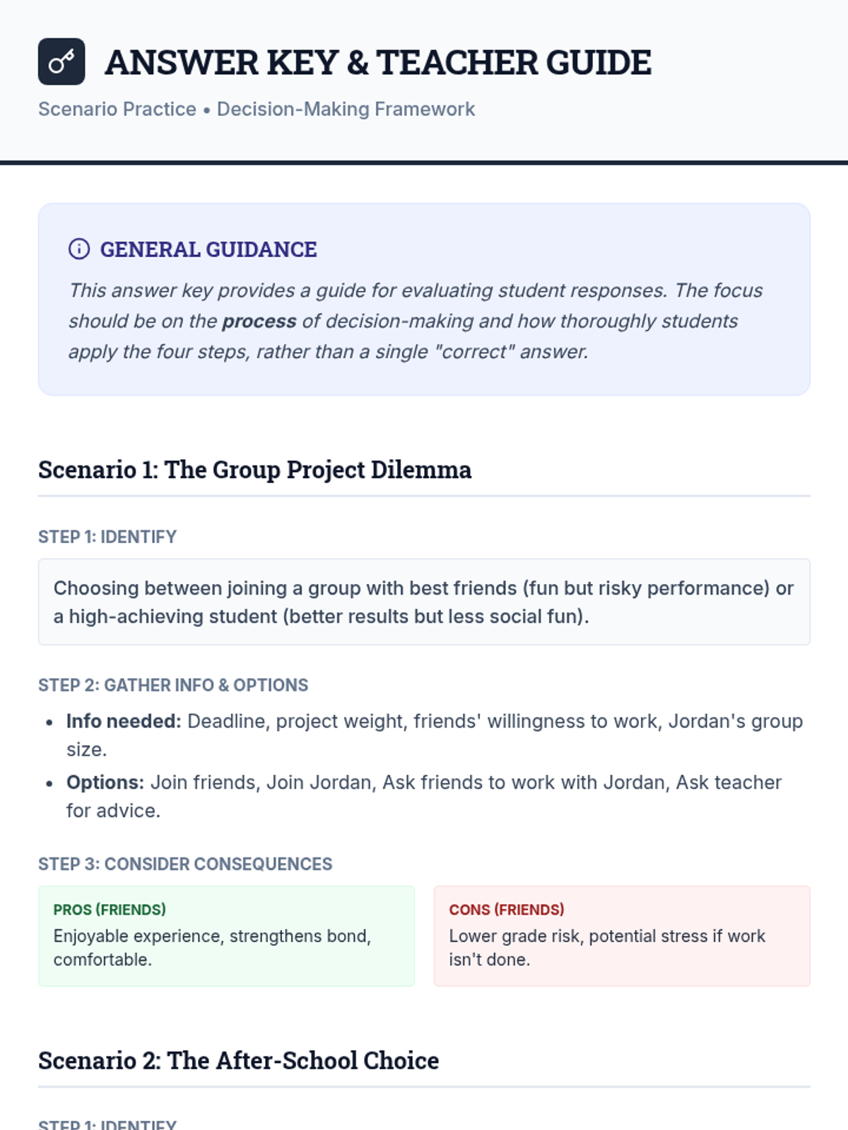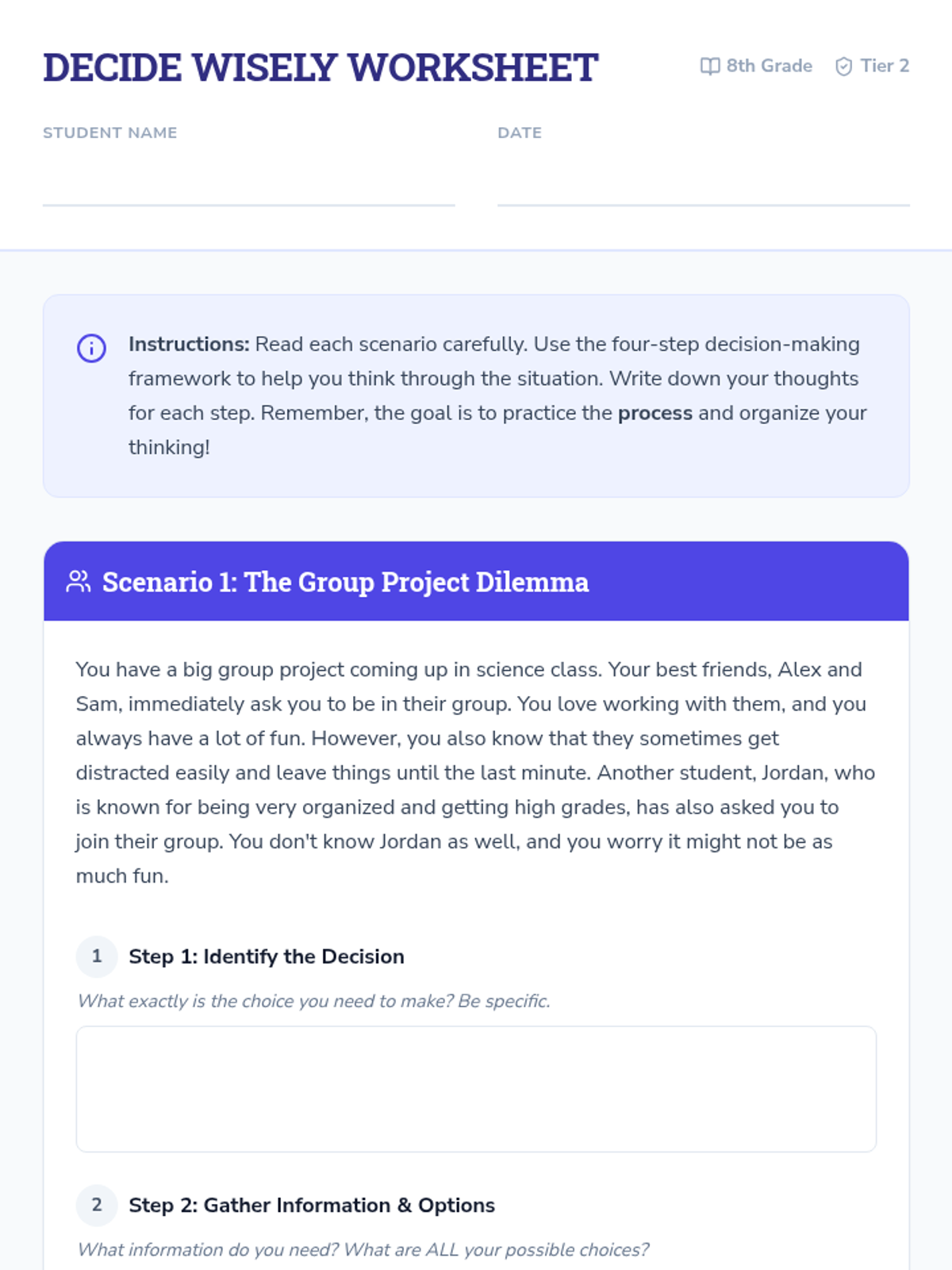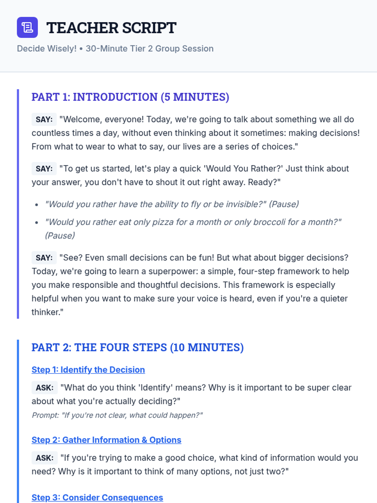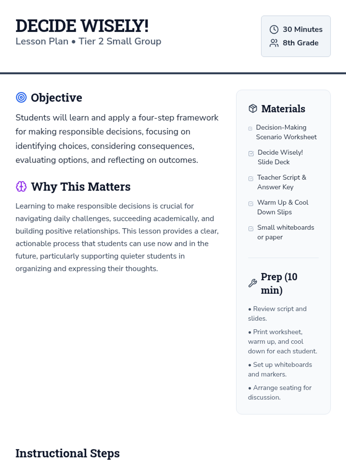 A 30-minute Tier 2 group lesson for 8th graders to master a four-step framework for making responsible decisions. Students will practice identifying choices, weighing consequences, and reflecting on outcomes through interactive scenarios.