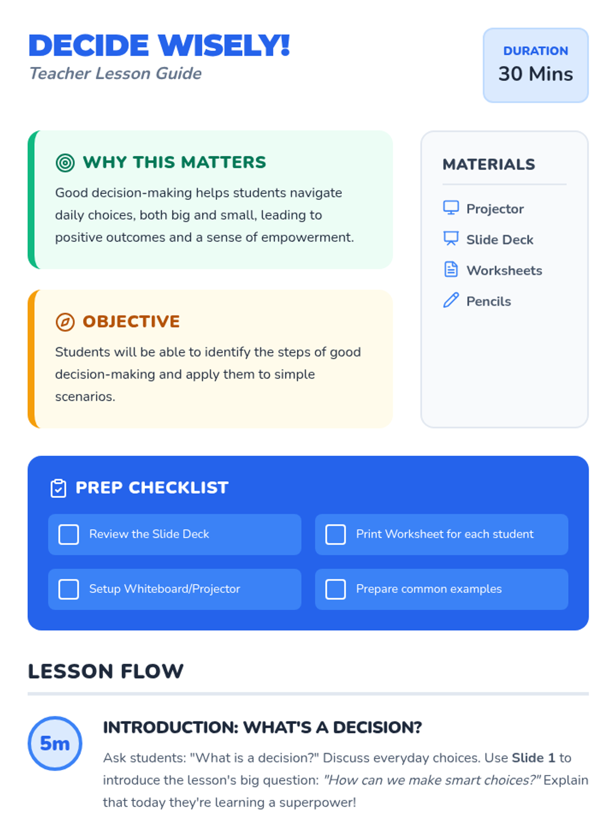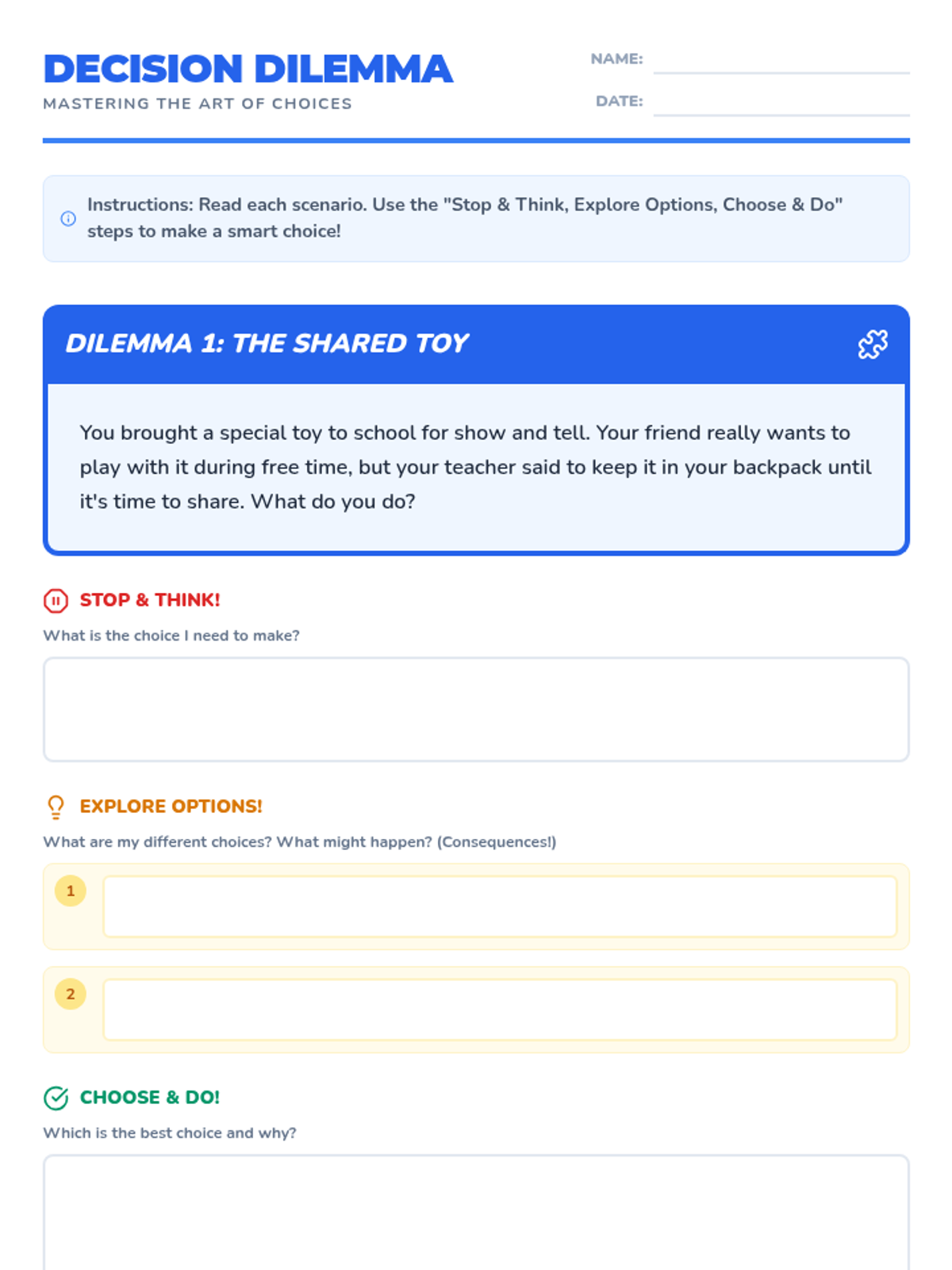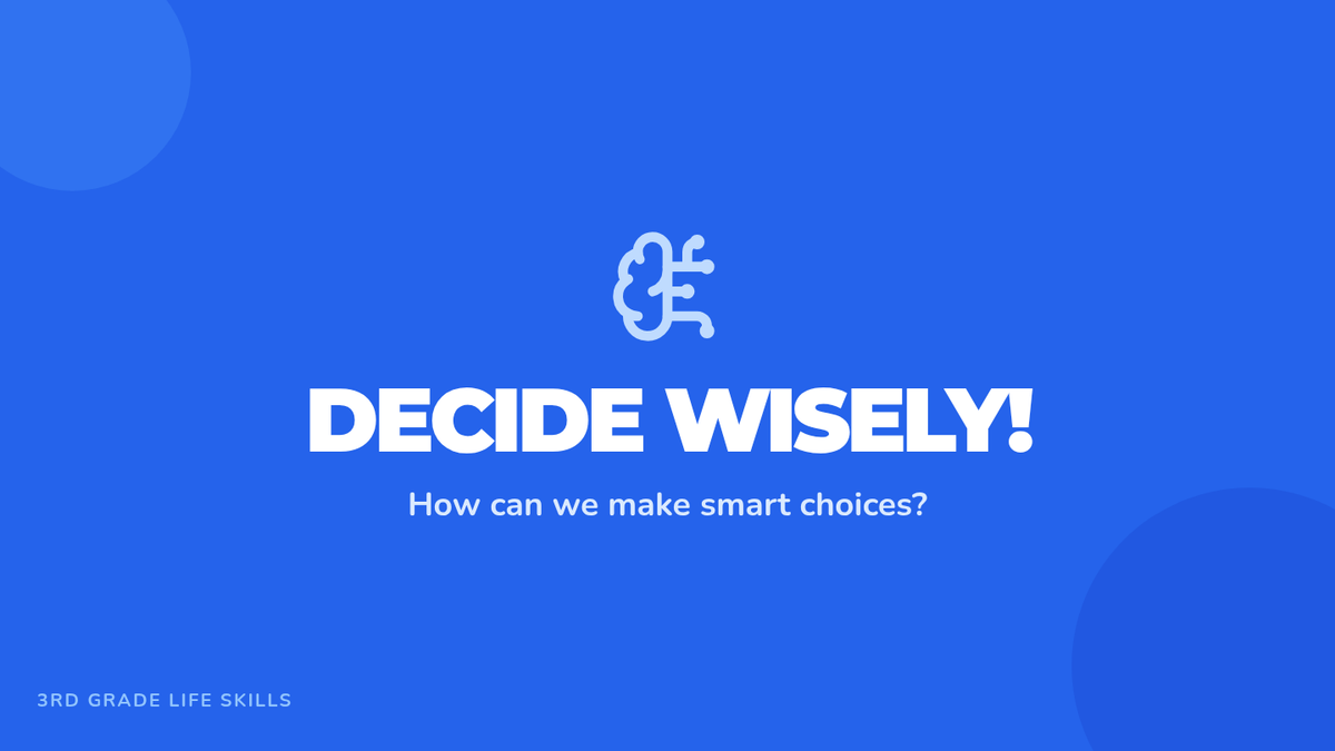 An interactive 30-minute lesson for 3rd graders focused on a simple three-step process for making smart decisions: Stop & Think, Explore Options, and Choose & Do.