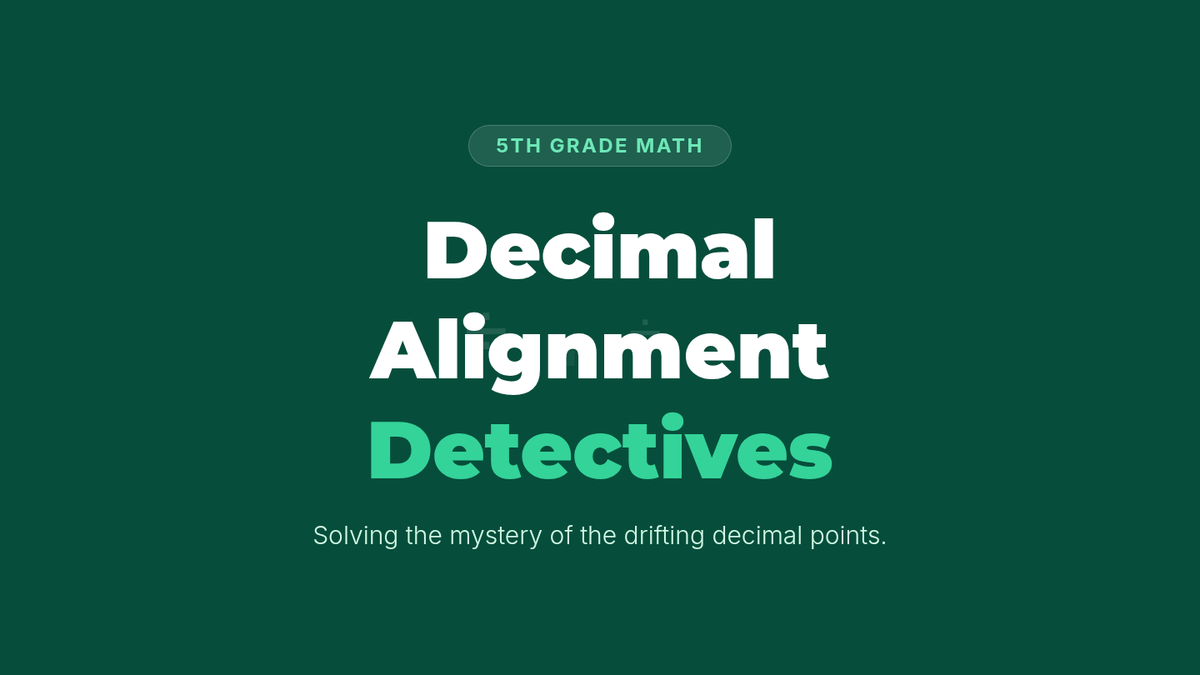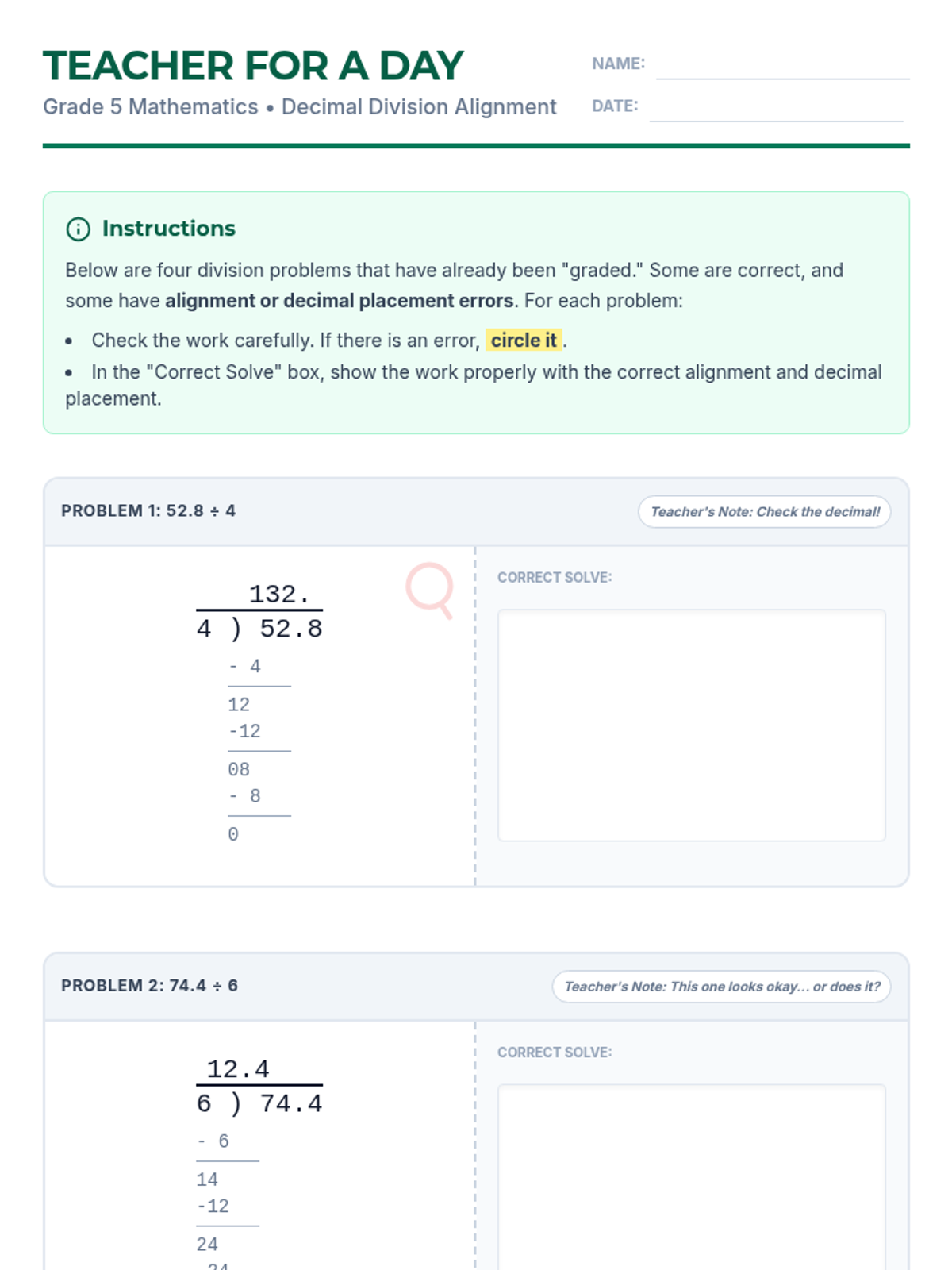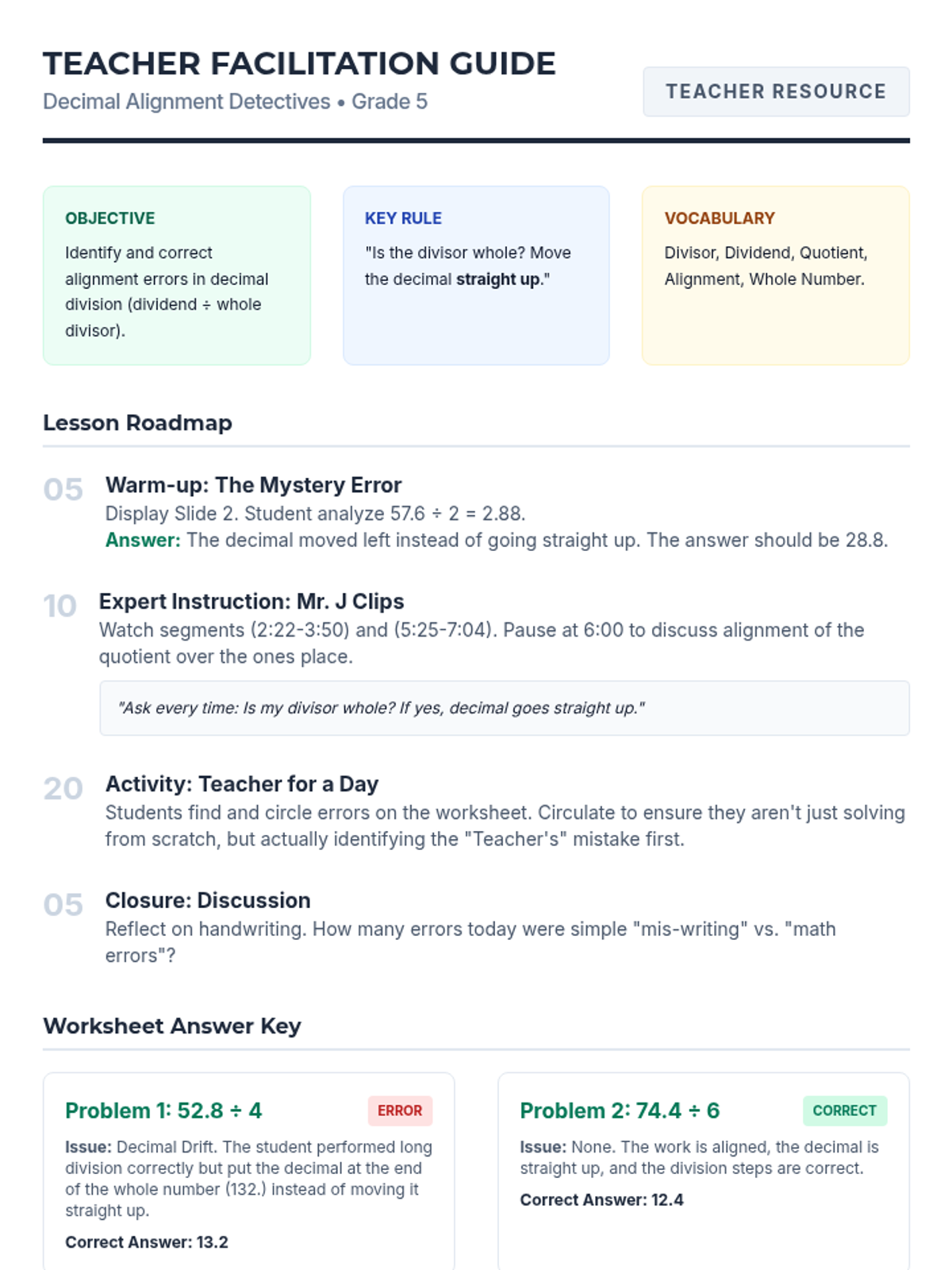 A 5th-grade math lesson focused on the precision of decimal placement and digit alignment when dividing decimals by whole numbers. Students watch targeted video segments to learn the 'straight up' rule and then act as 'teachers' to find and fix alignment errors in pre-solved problems.