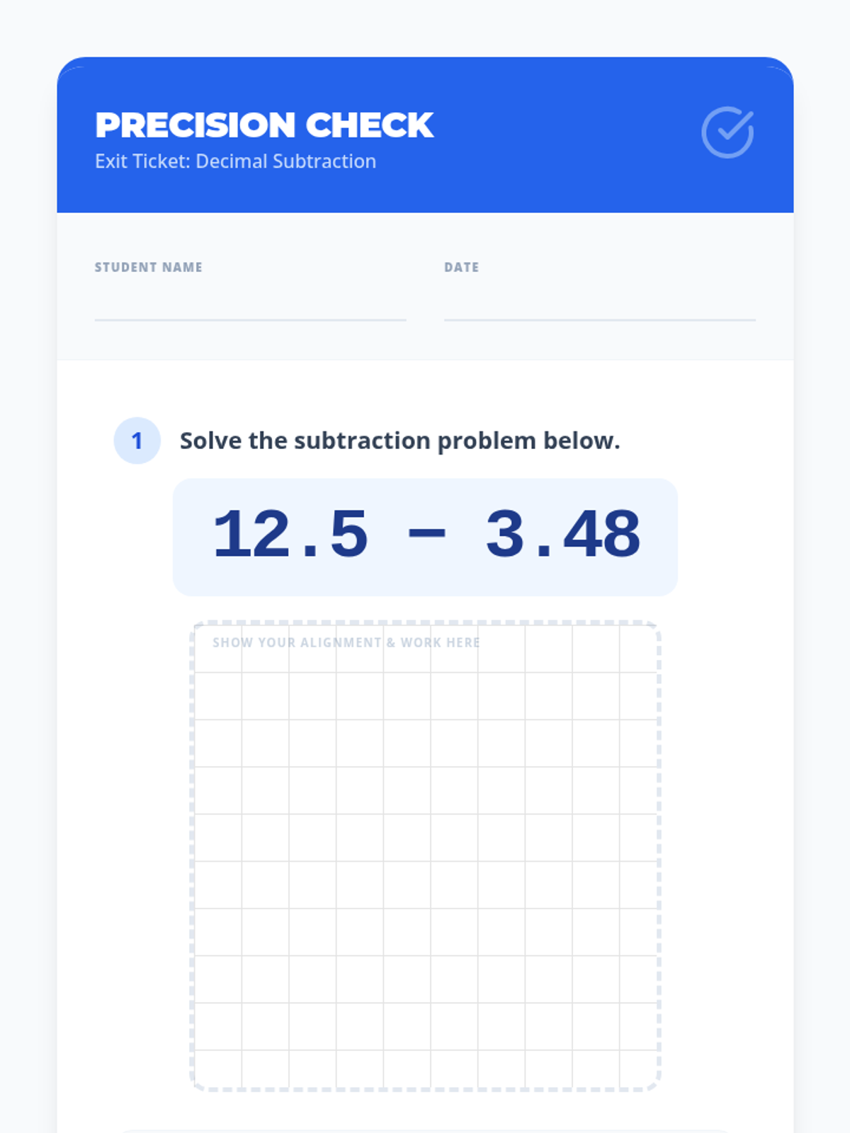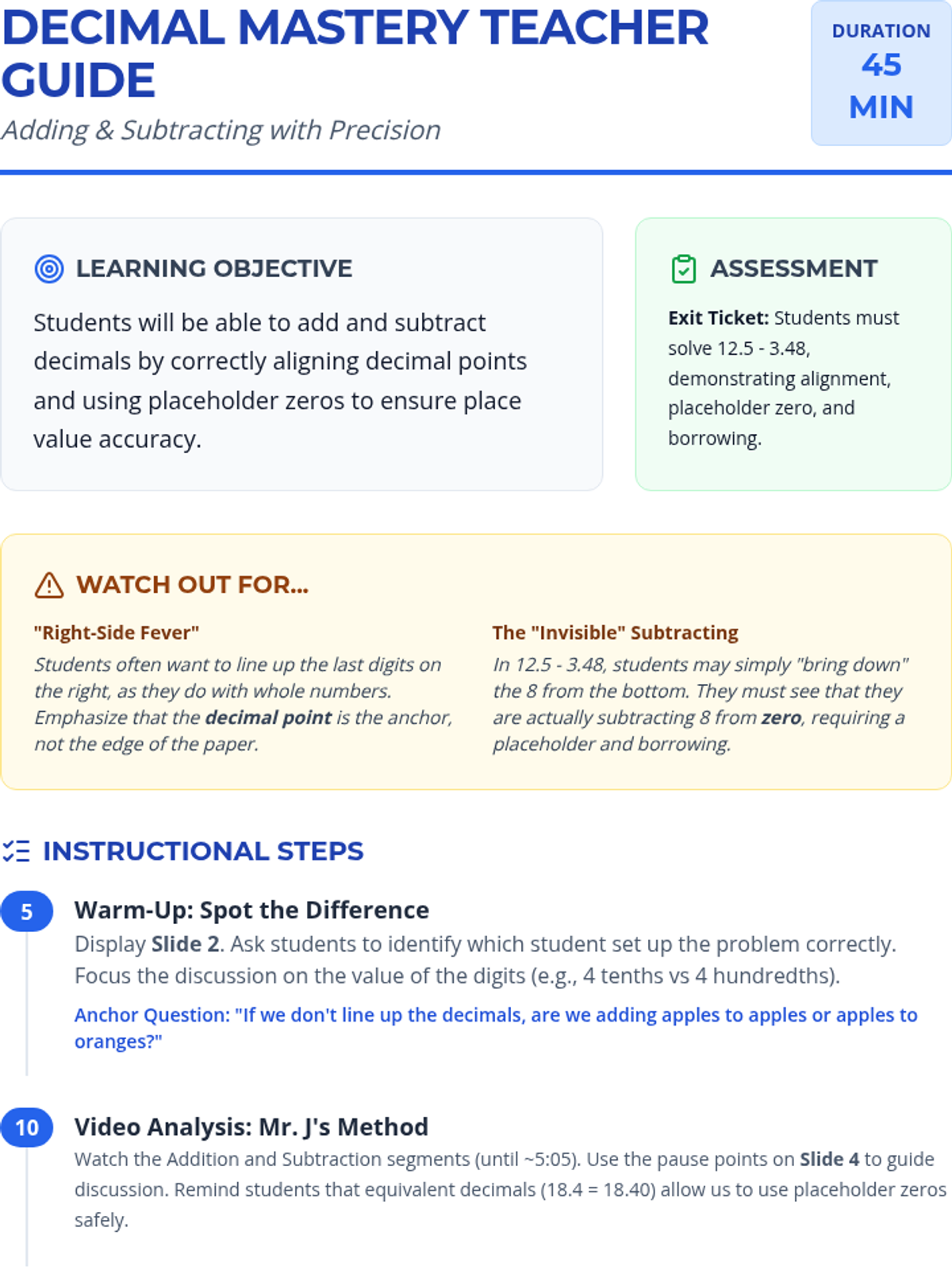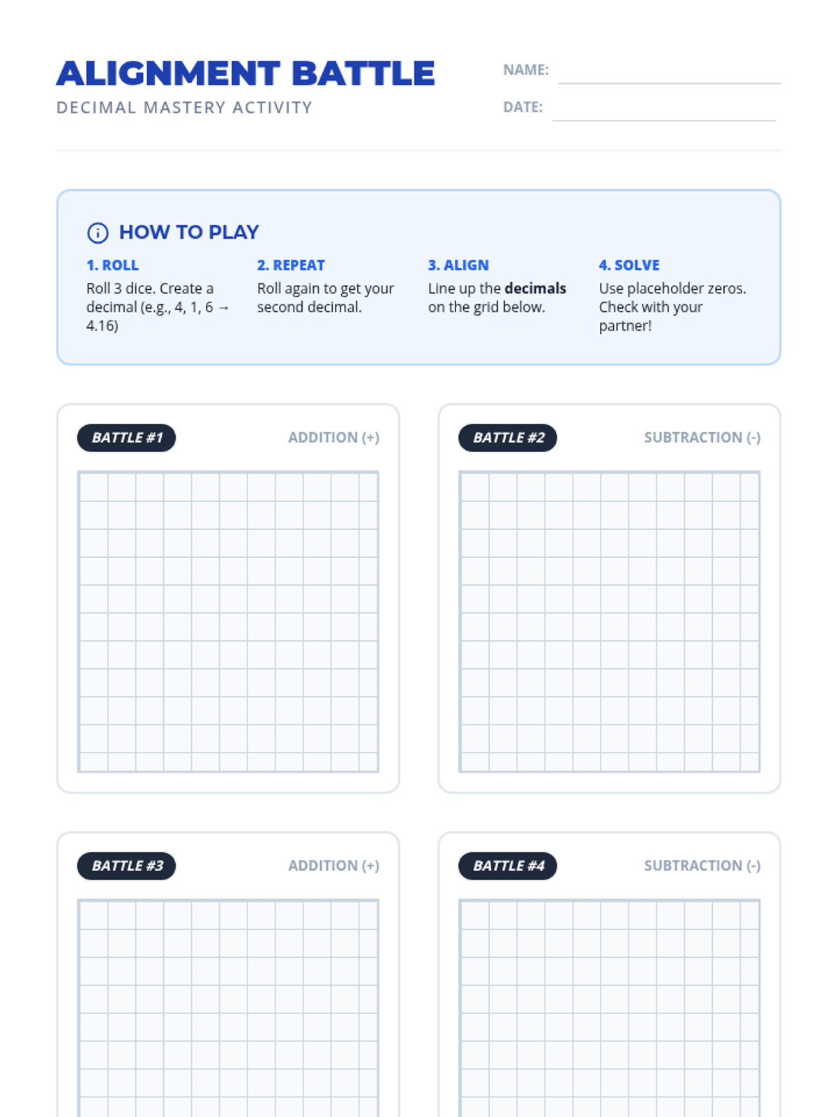 A 5th-grade math lesson focused on the precision of aligning decimal points and using placeholder zeros for addition and subtraction. Students will use video analysis, a dice-based game on graph paper, and a targeted exit ticket to master these foundational skills.