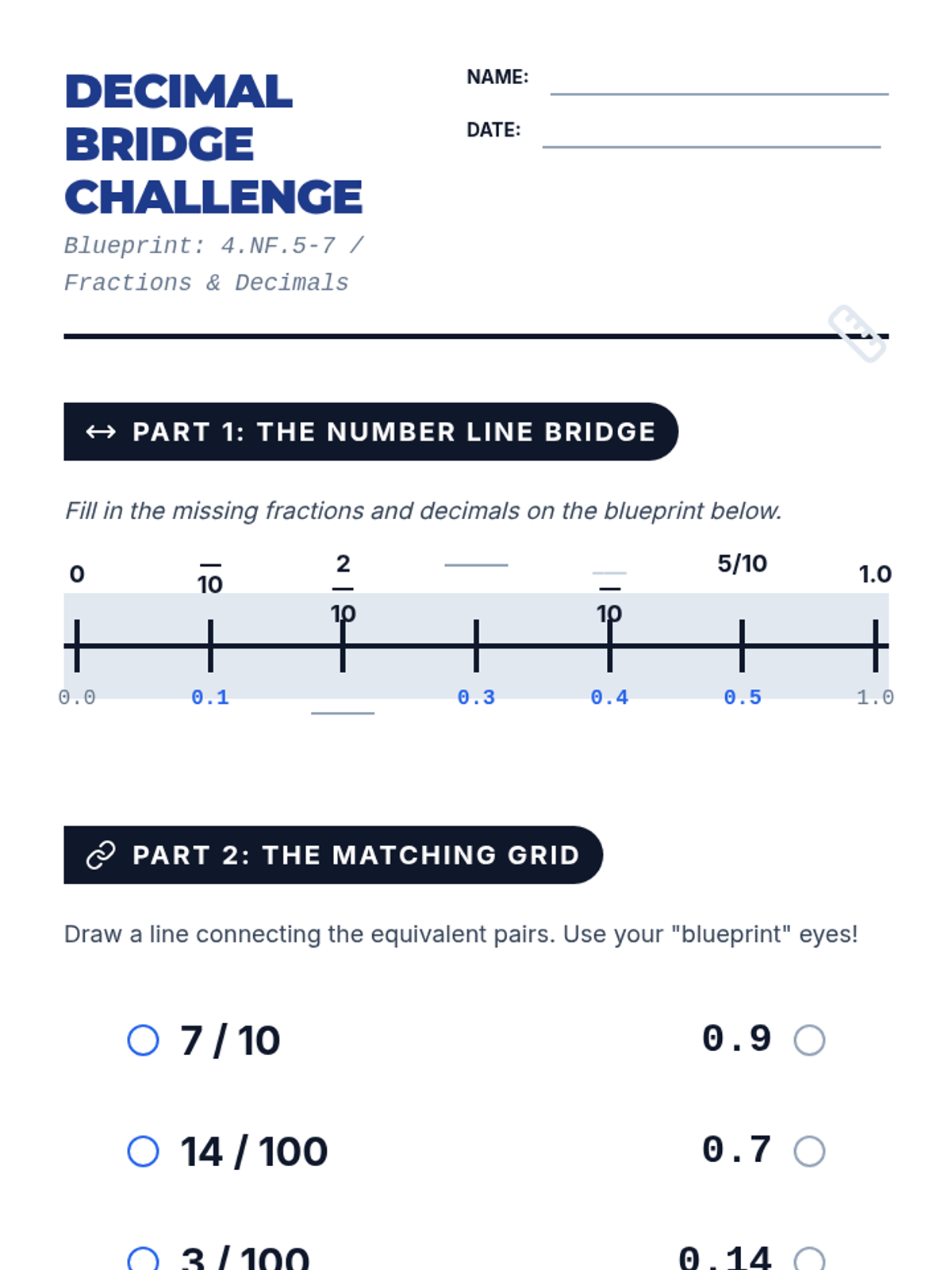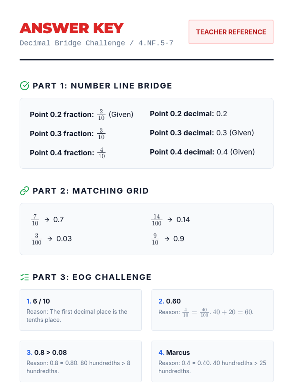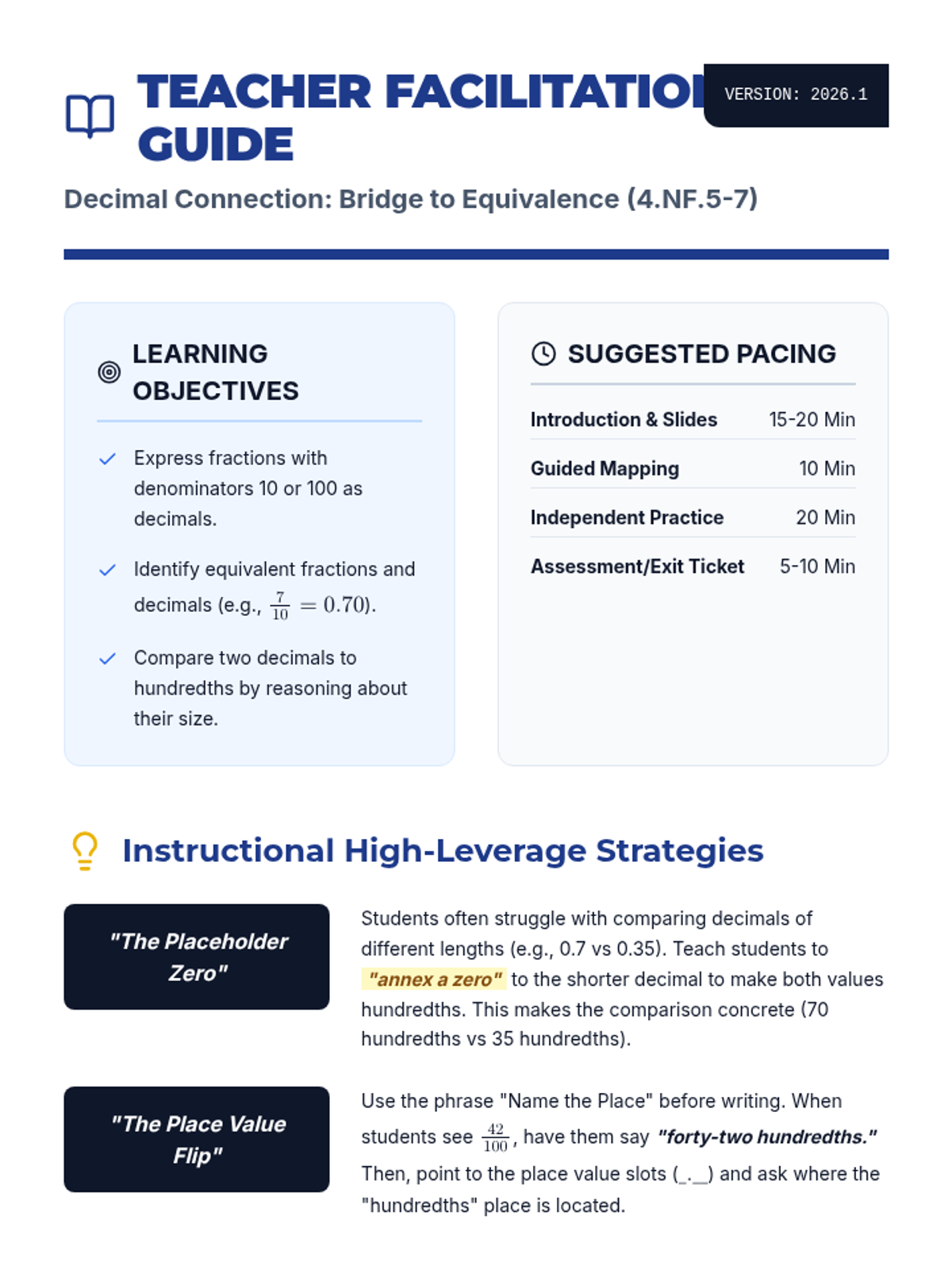 A comprehensive lesson for 4th grade students to bridge the gap between fractions with denominators of 10 and 100 and their decimal equivalents, featuring visual models and EOG-style practice.