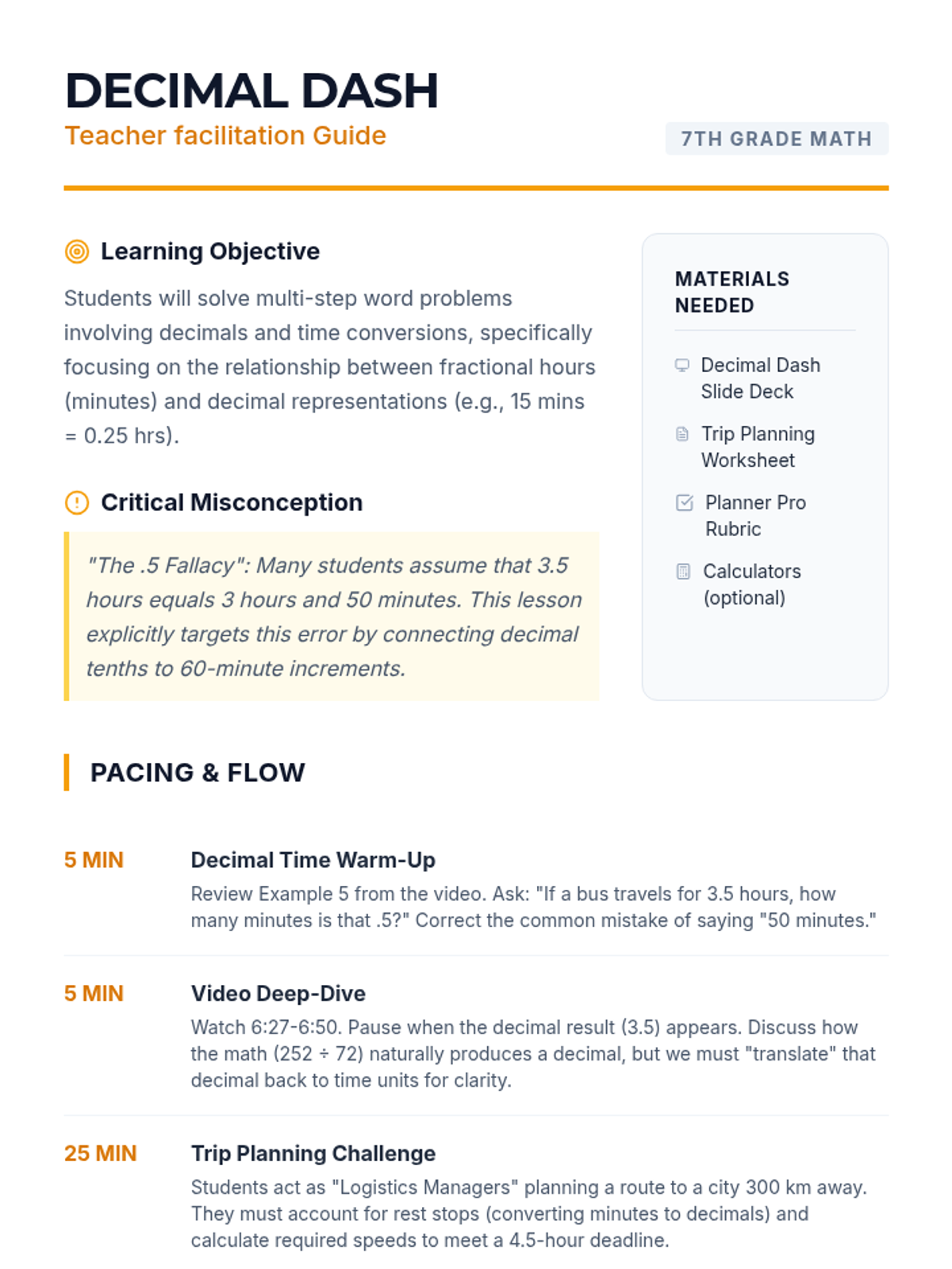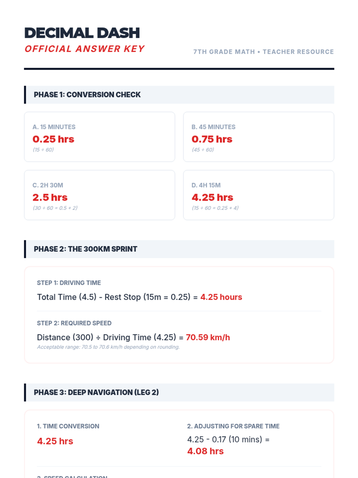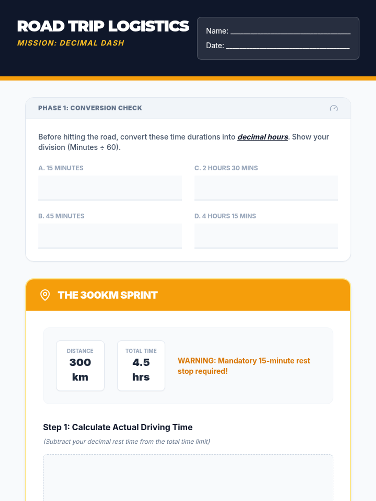 Students will master speed, distance, and time calculations through a road trip simulation, focusing on converting minutes to decimal hours and solving multi-step word problems.