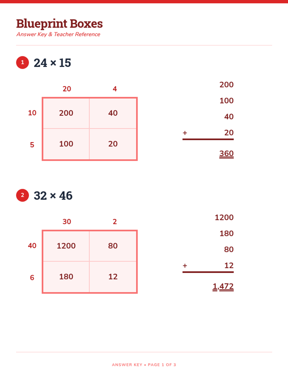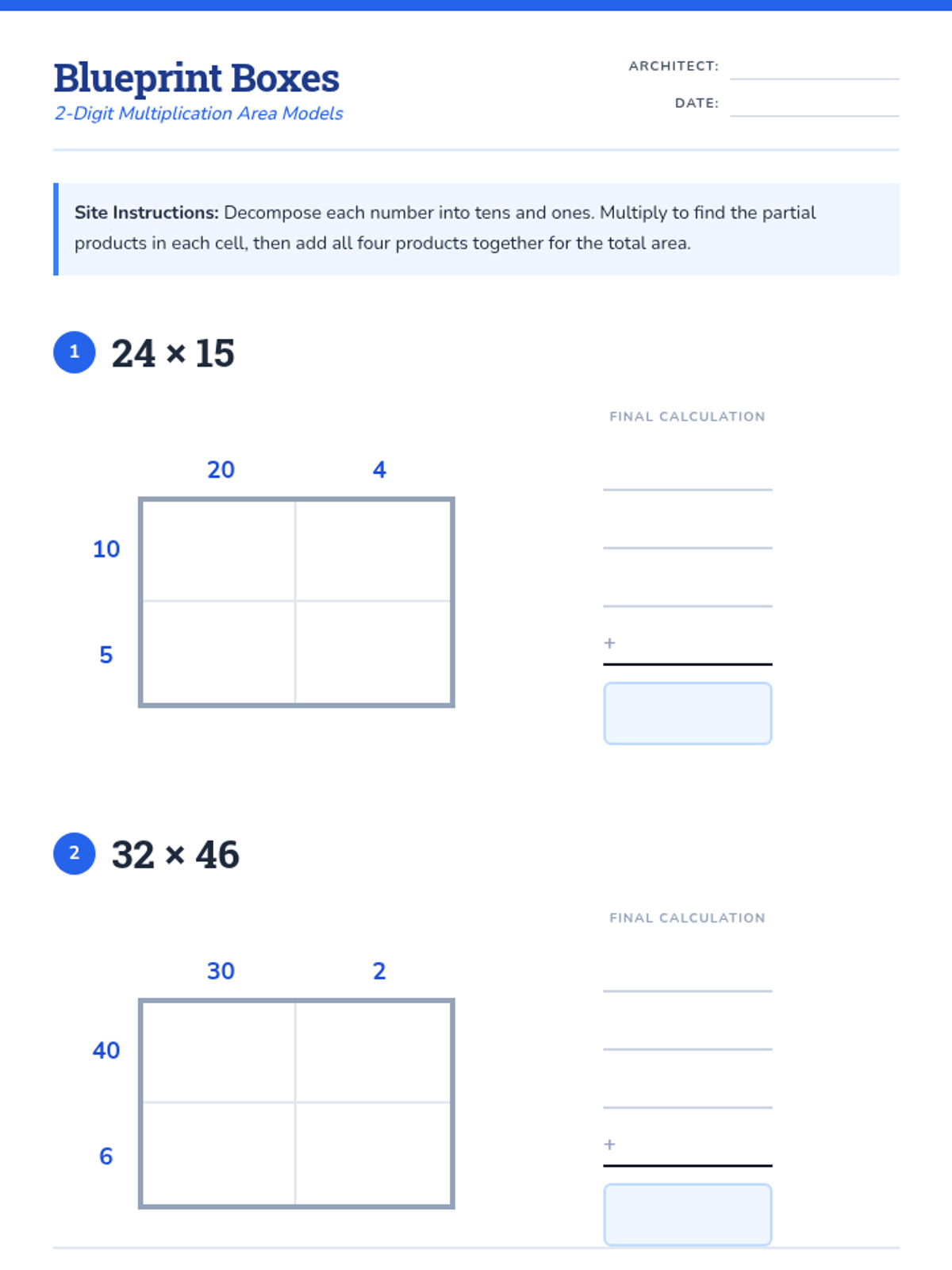 A visual lesson on multiplying 2-digit numbers by 2-digit numbers using the box method (area model). Students use a blueprint-themed layout to decompose numbers and calculate partial products.