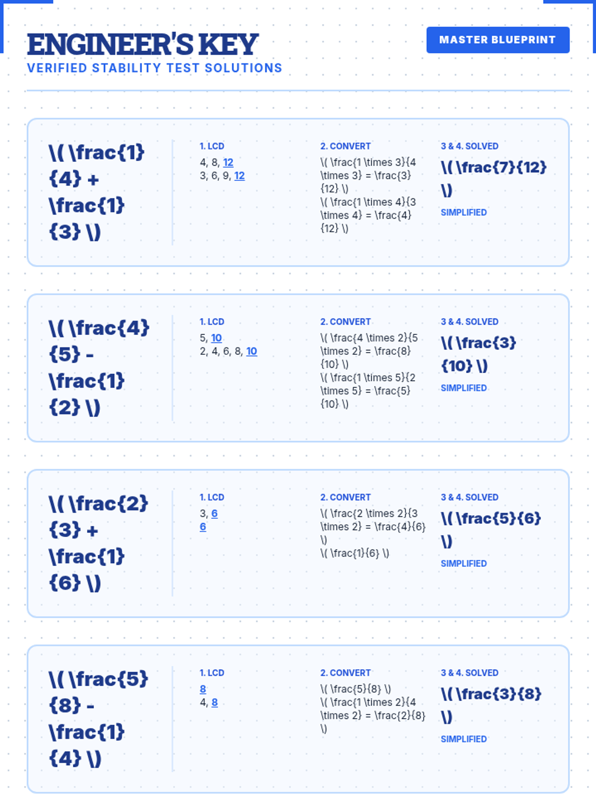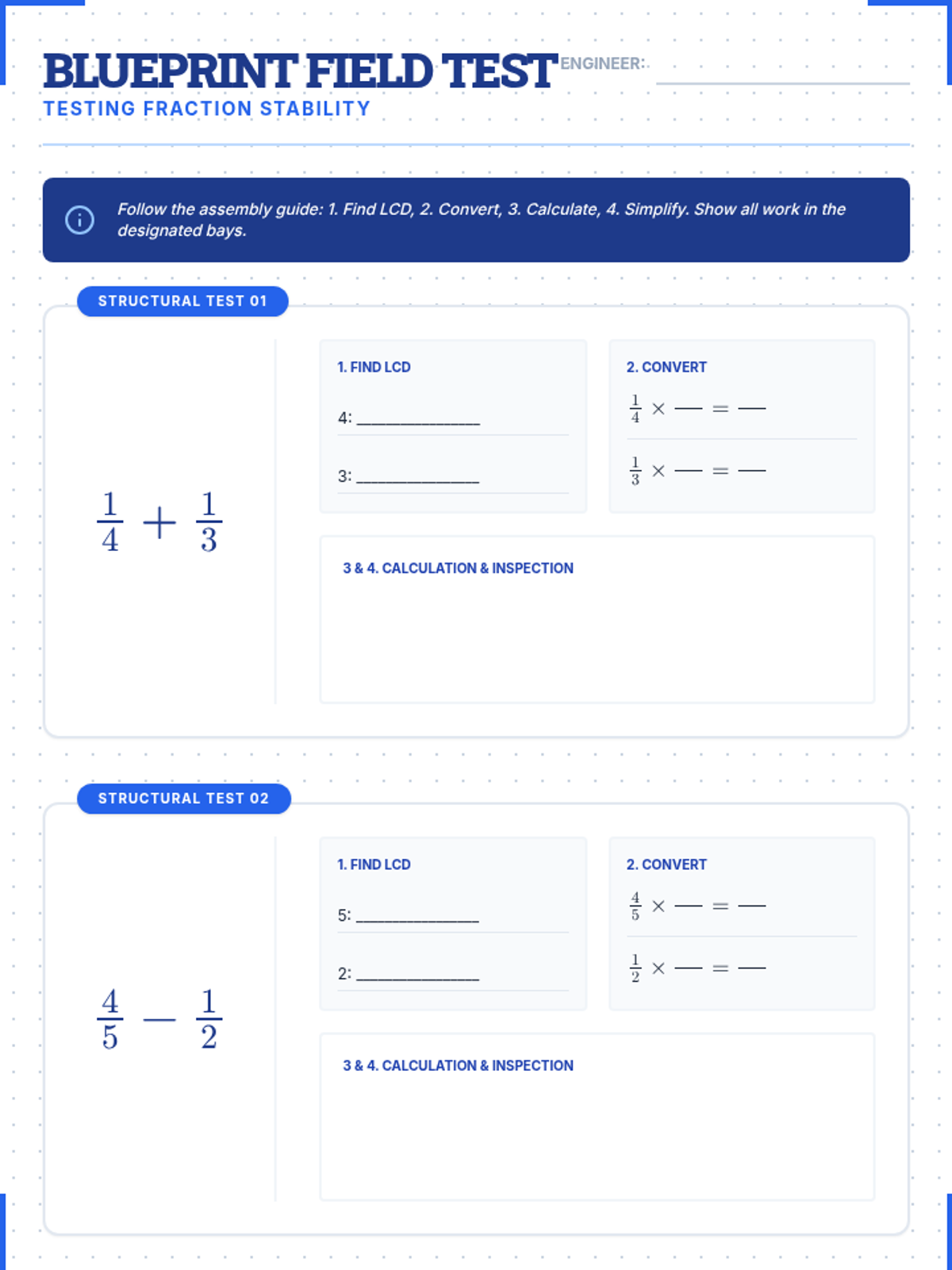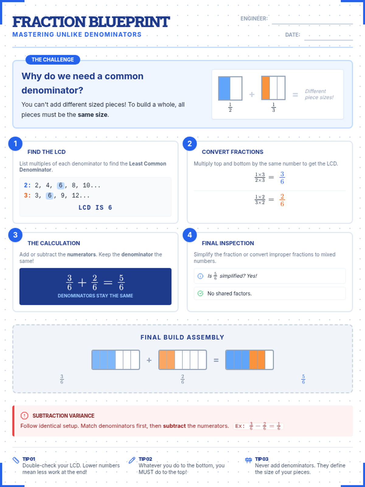 A lesson focused on adding and subtracting fractions with unlike denominators using a structural 'blueprint' approach. Students use step-by-step assembly guides and visual area models to understand common denominators.