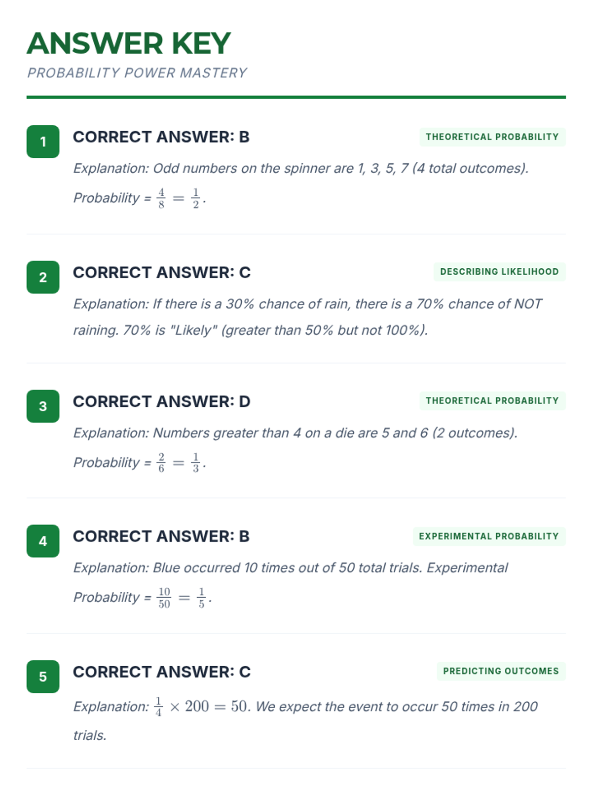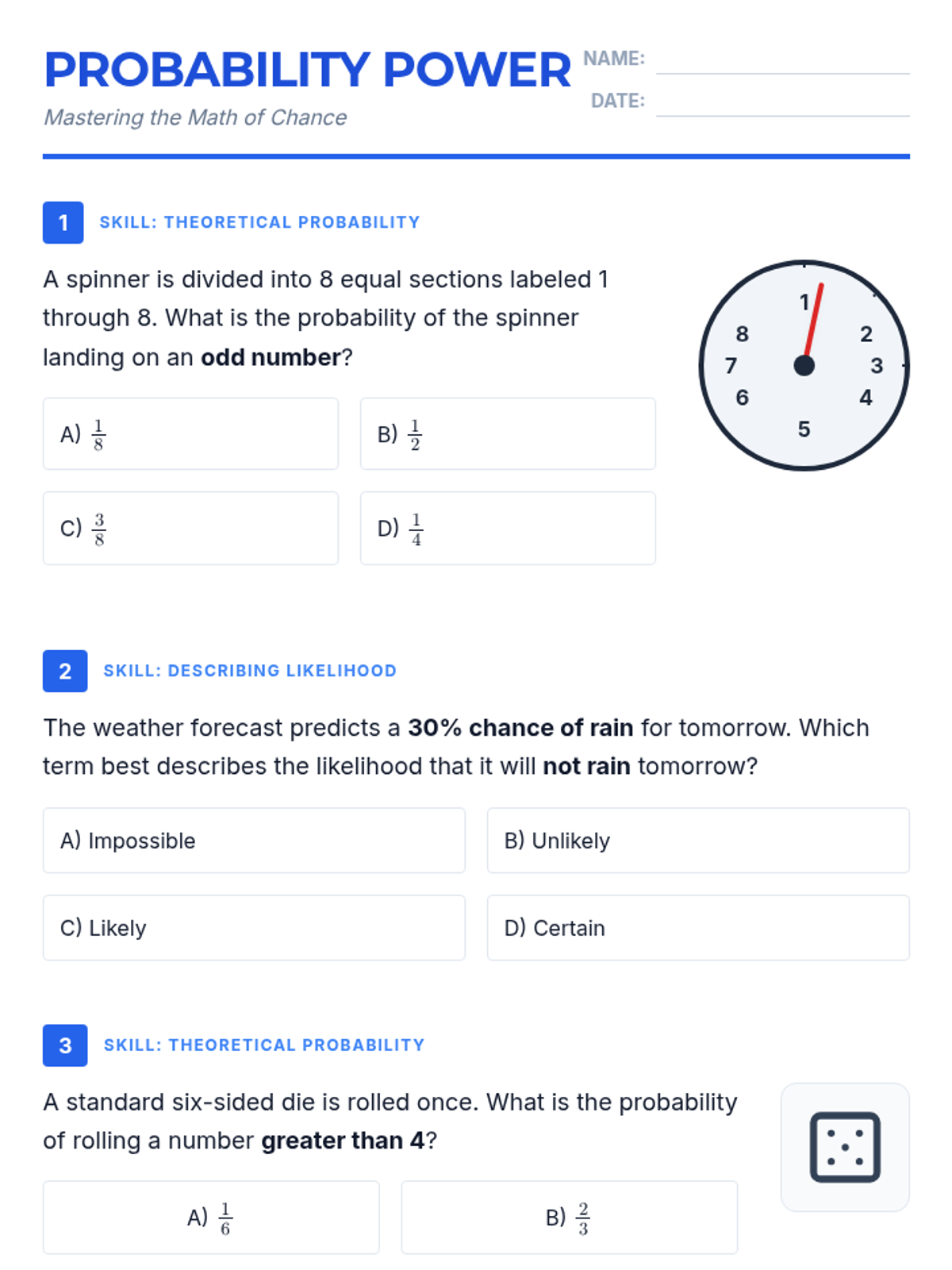 A comprehensive lesson on 7th-grade probability covering likelihood, theoretical and experimental probability, compound events, and making predictions.