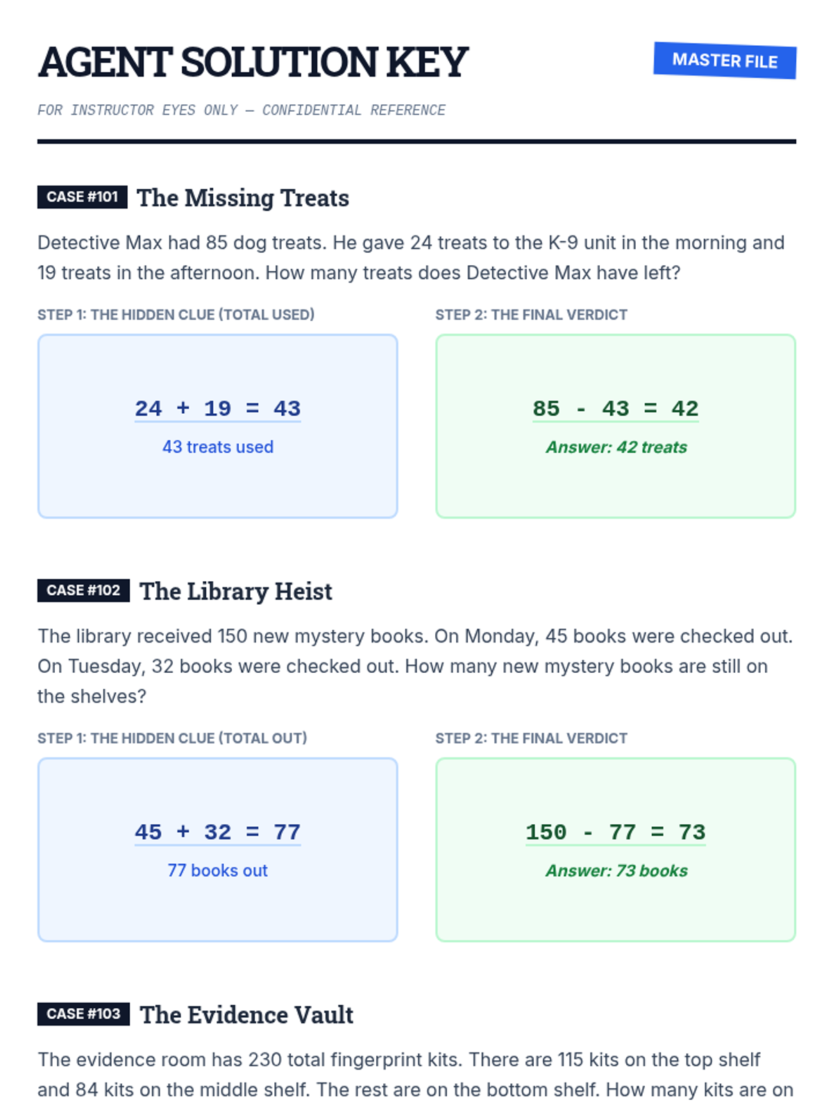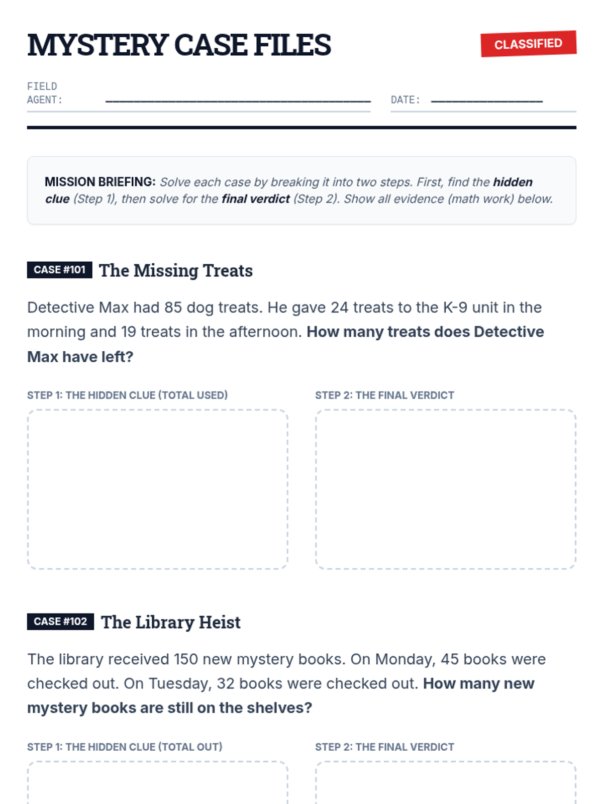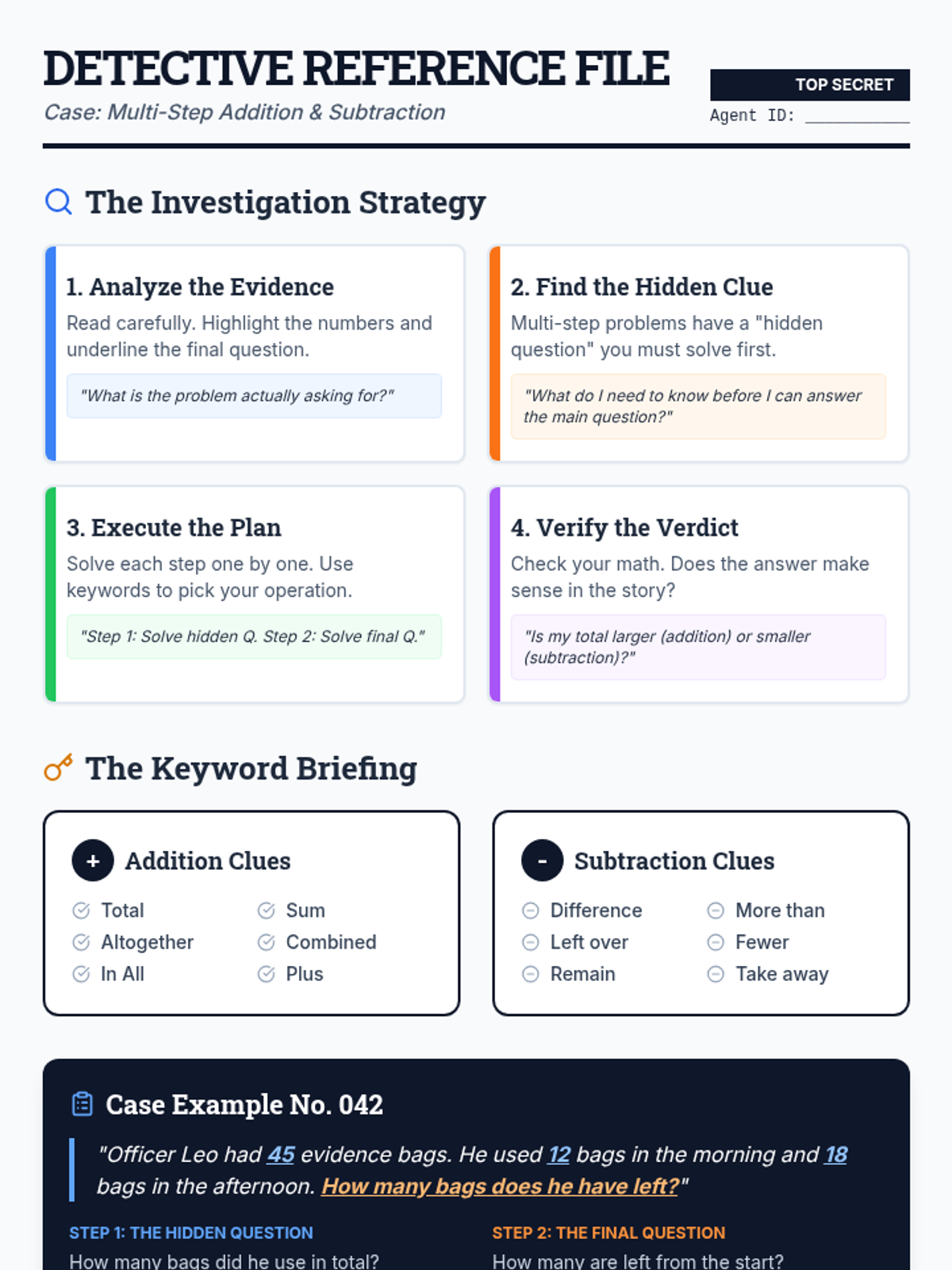 A lesson focused on breaking down and solving multi-step word problems using addition and subtraction through a detective-themed lens.