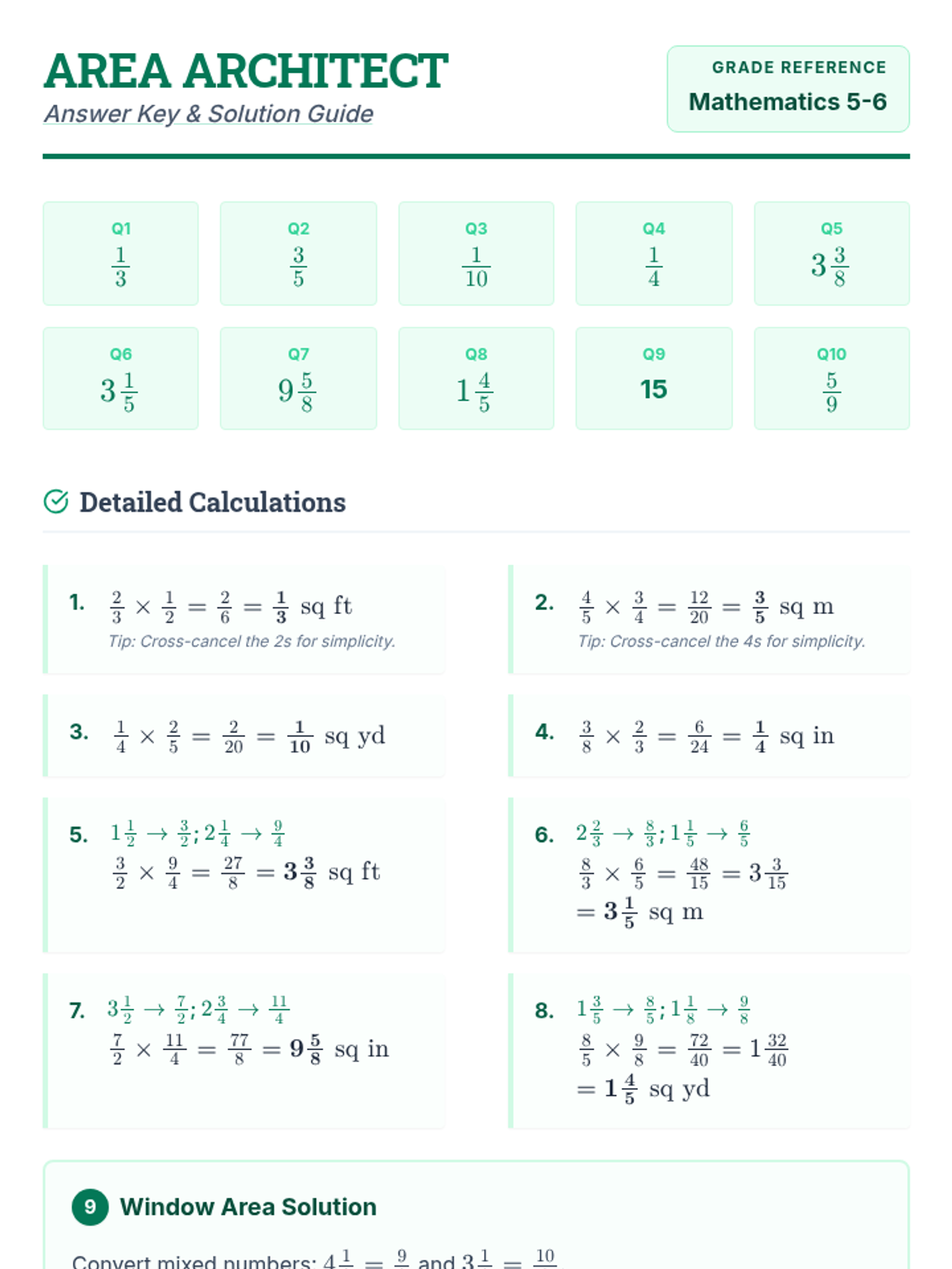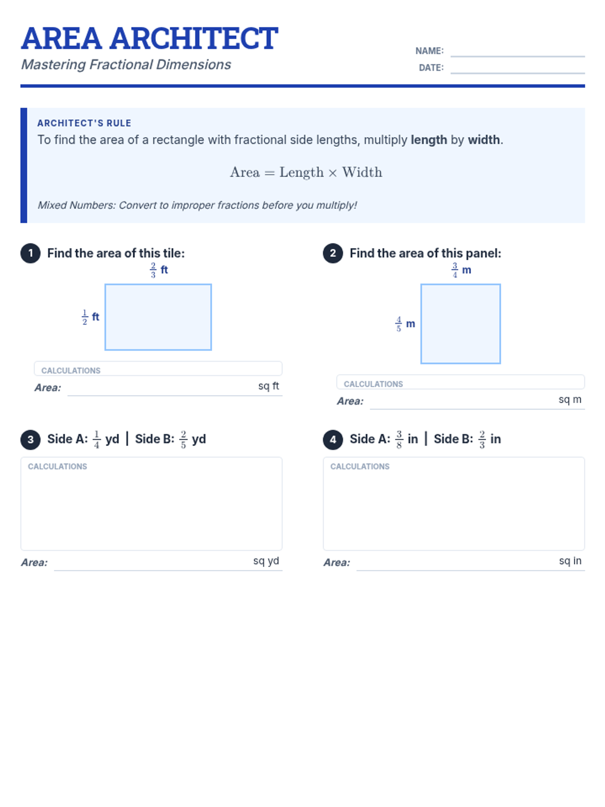 A lesson focused on calculating the area of rectangles with fractional and mixed number side lengths by relating the concept to multiplication. Students will practice converting mixed numbers to improper fractions and applying the area formula.