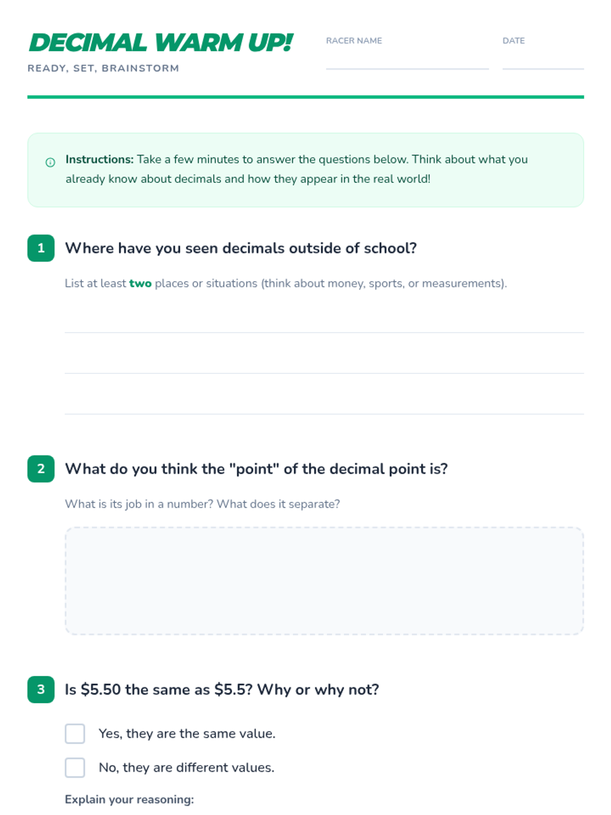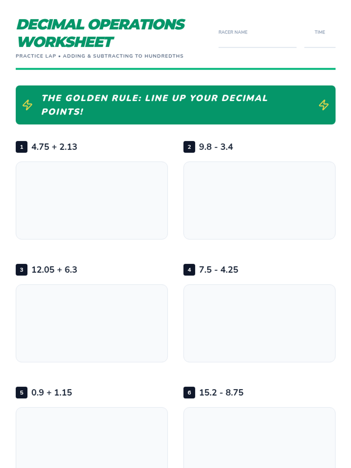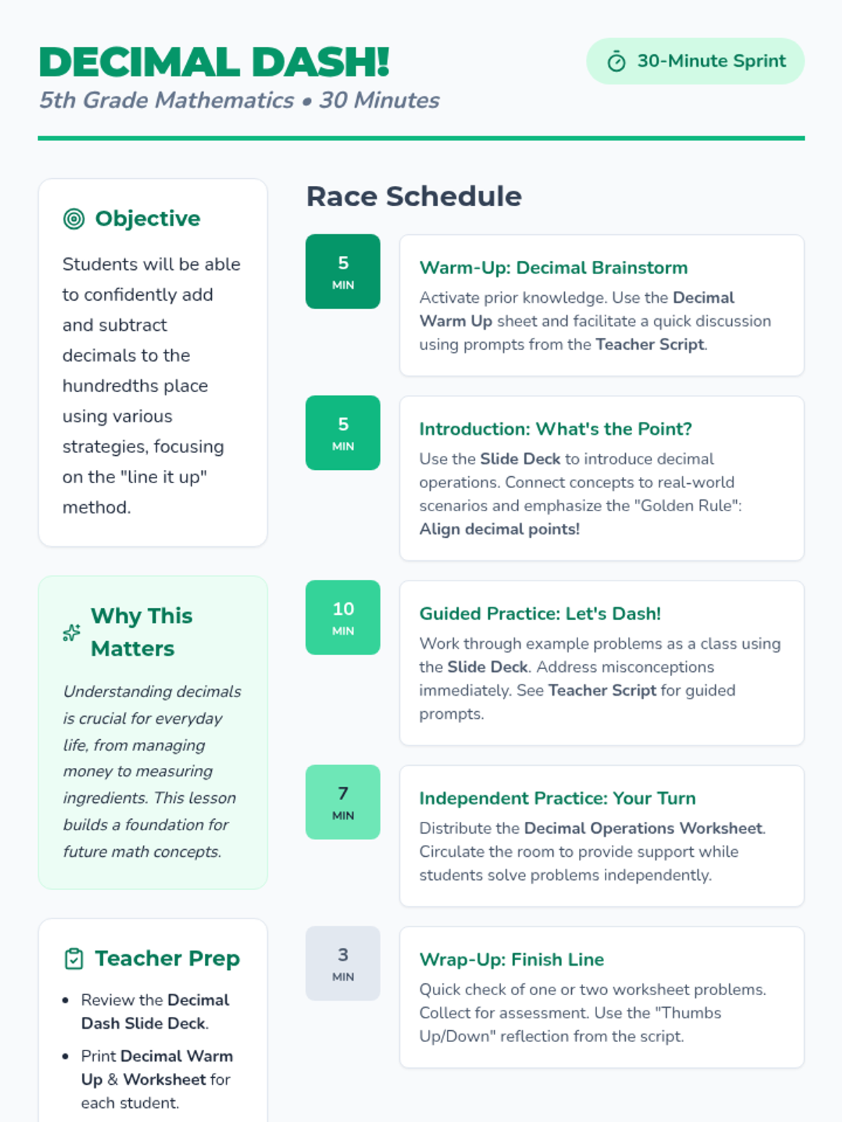 A high-energy, 30-minute lesson for 5th graders focused on adding and subtracting decimals to the hundredths place using a 'racing' theme.
