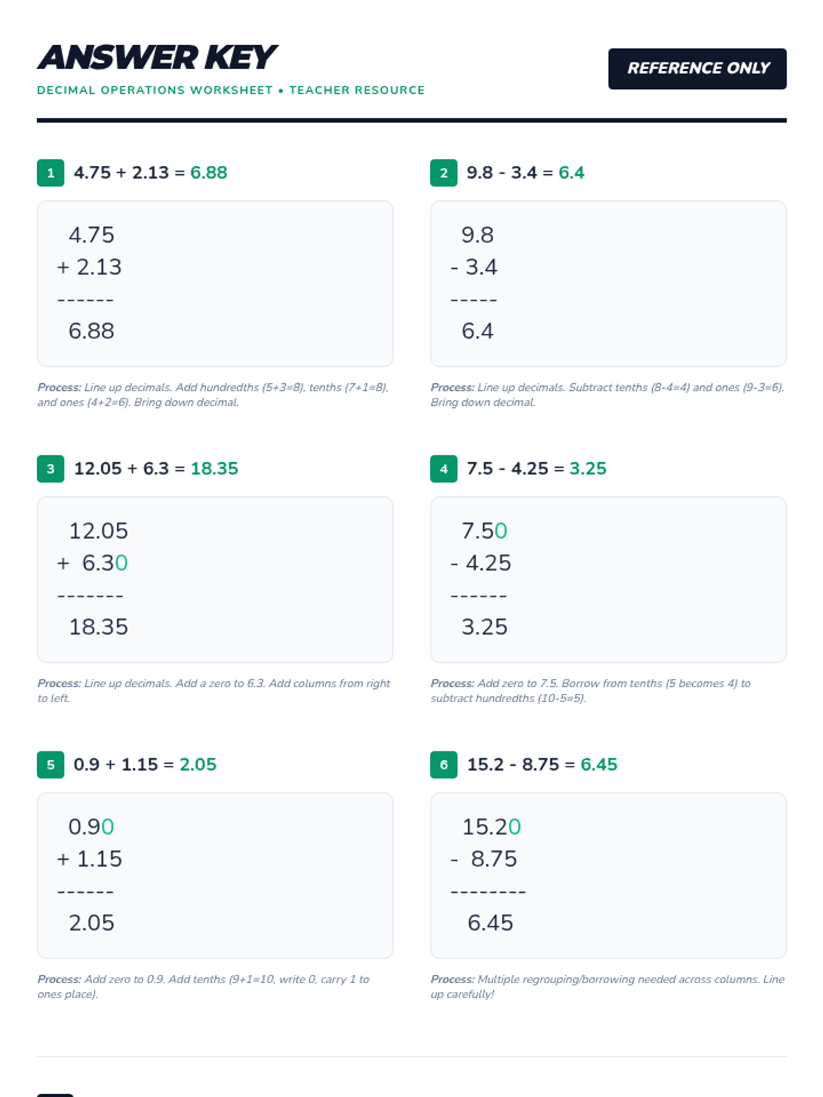 A collection of four diverse decimal practice activities covering addition, subtraction, comparison, rounding, and word problems for 7th-grade math students.