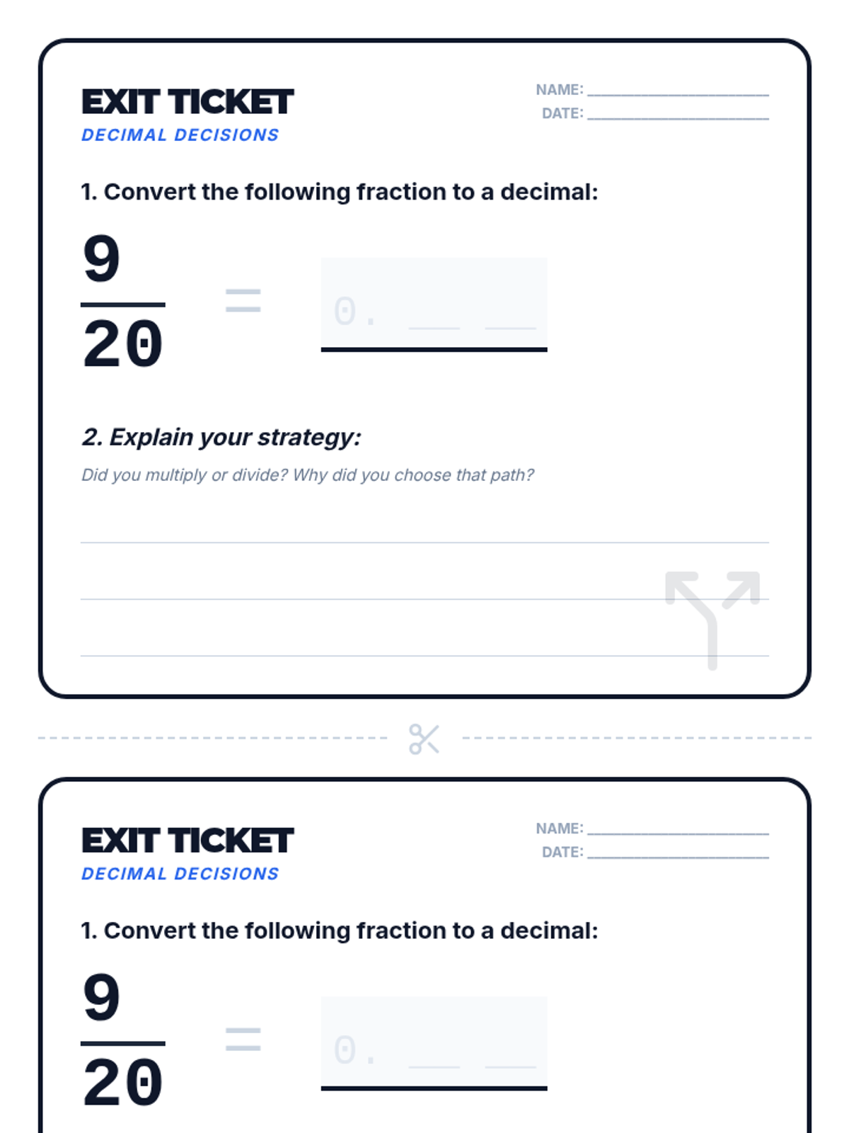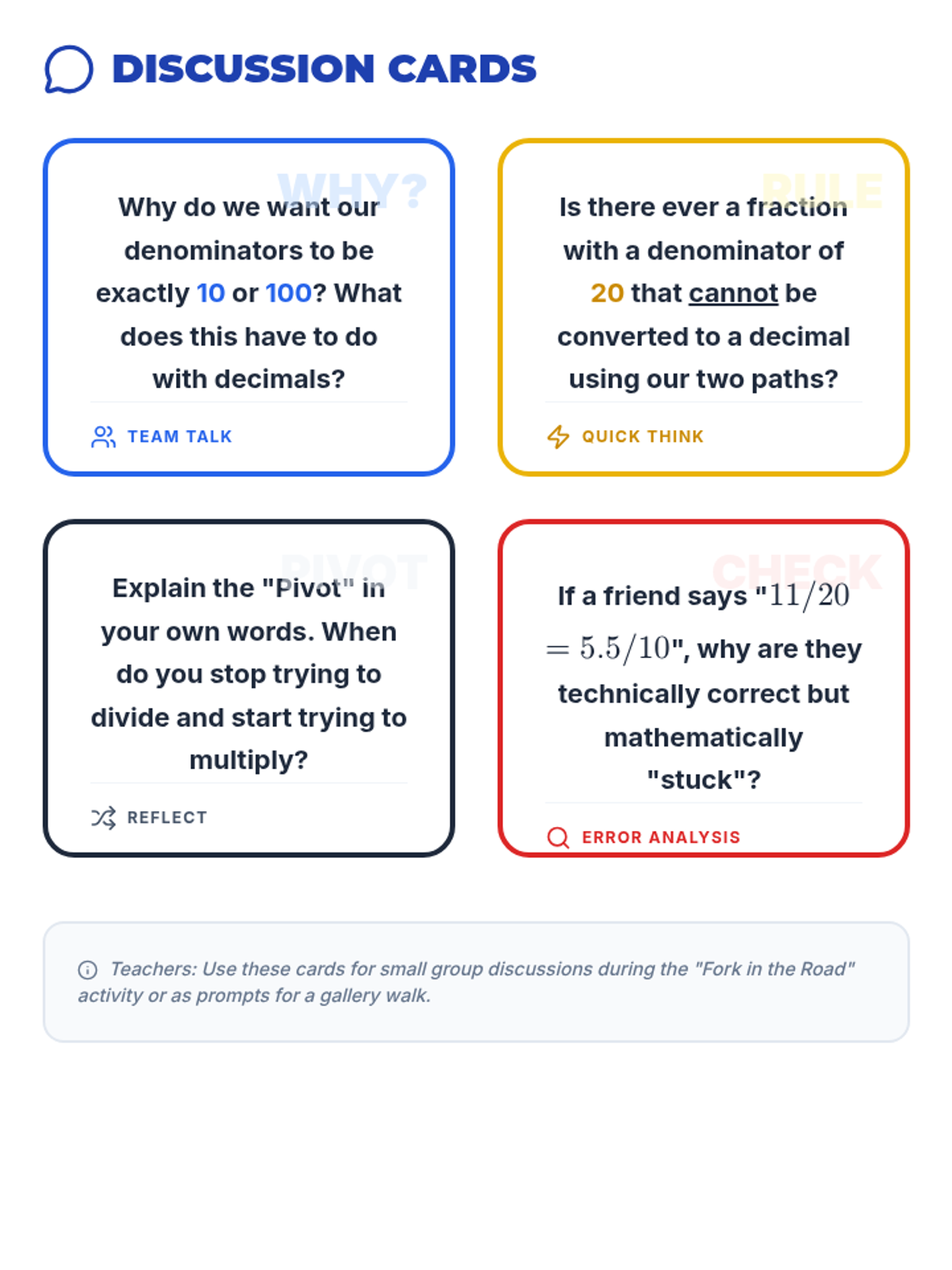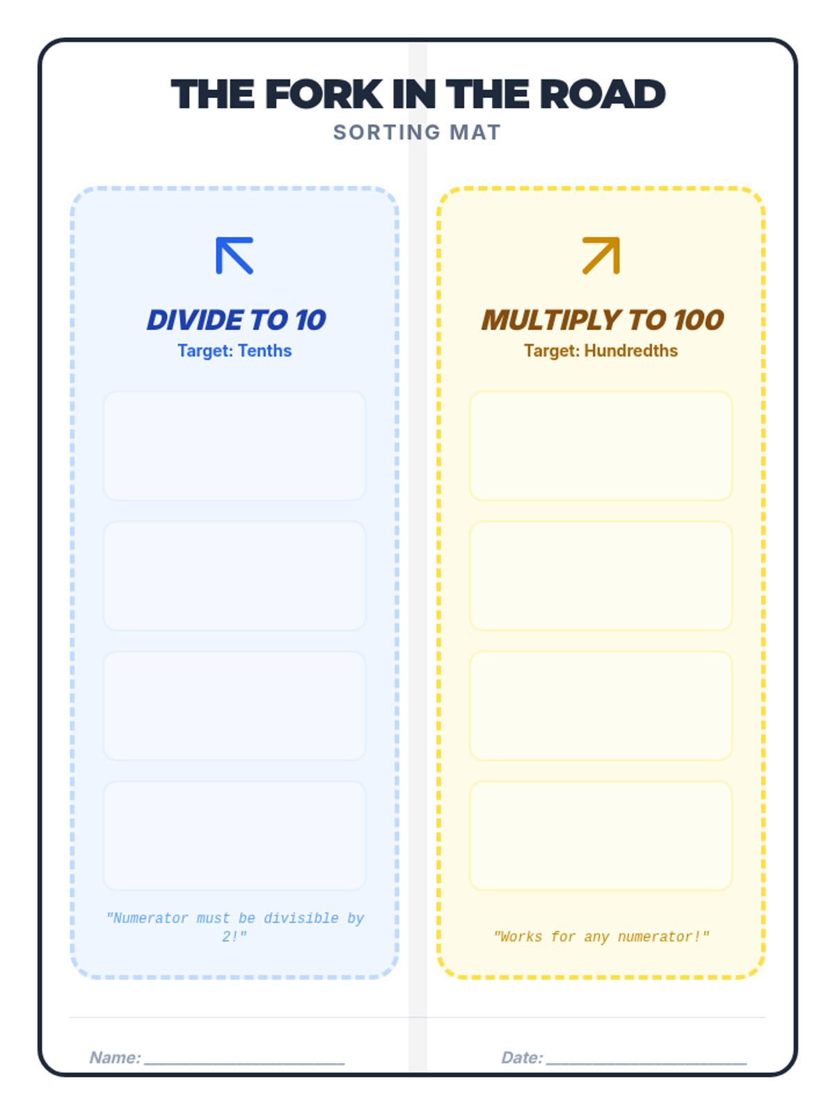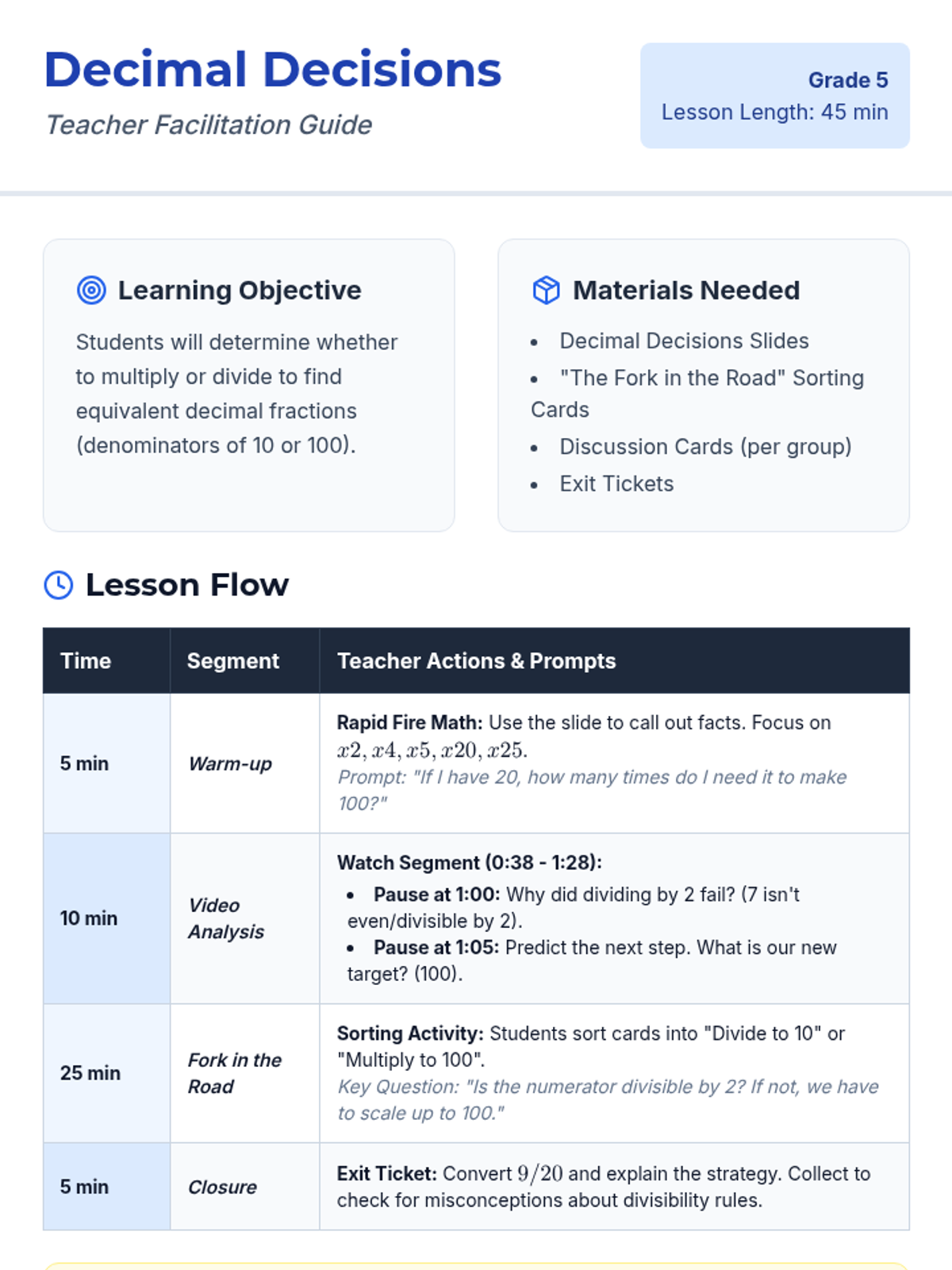 A lesson focused on deciding whether to multiply or divide to find equivalent decimal fractions, featuring a sorting activity and video analysis.