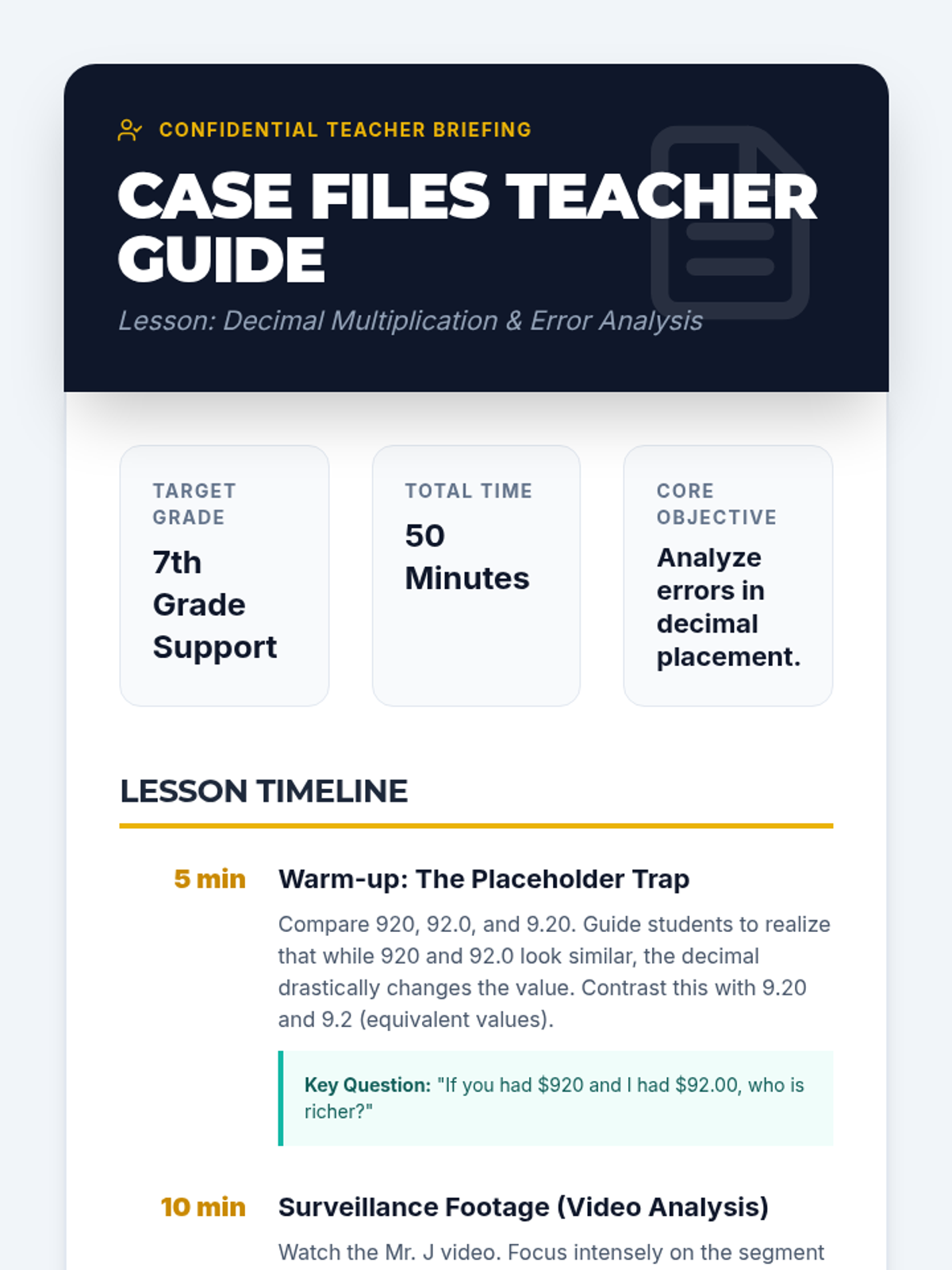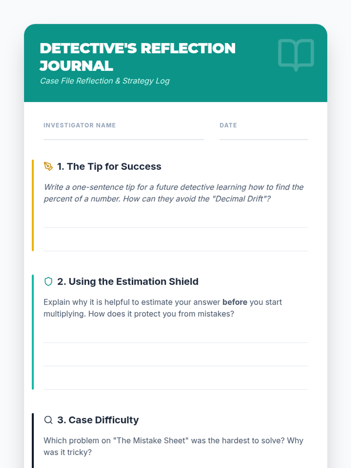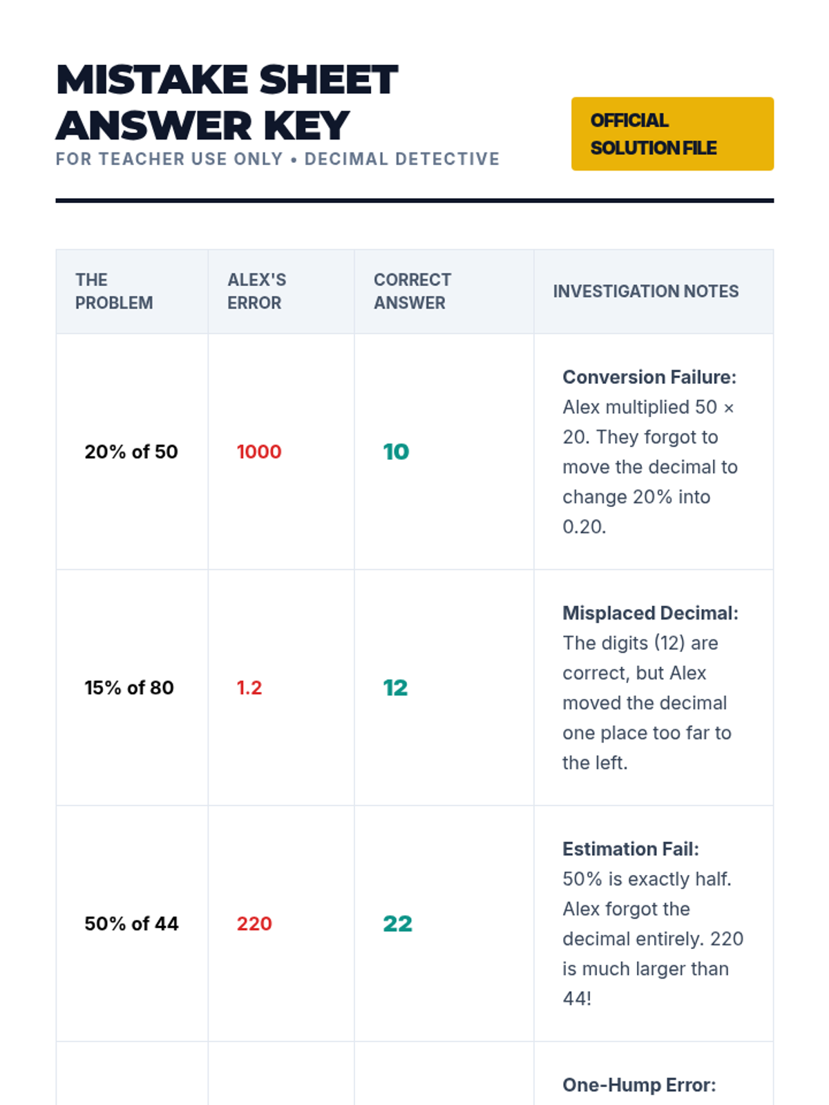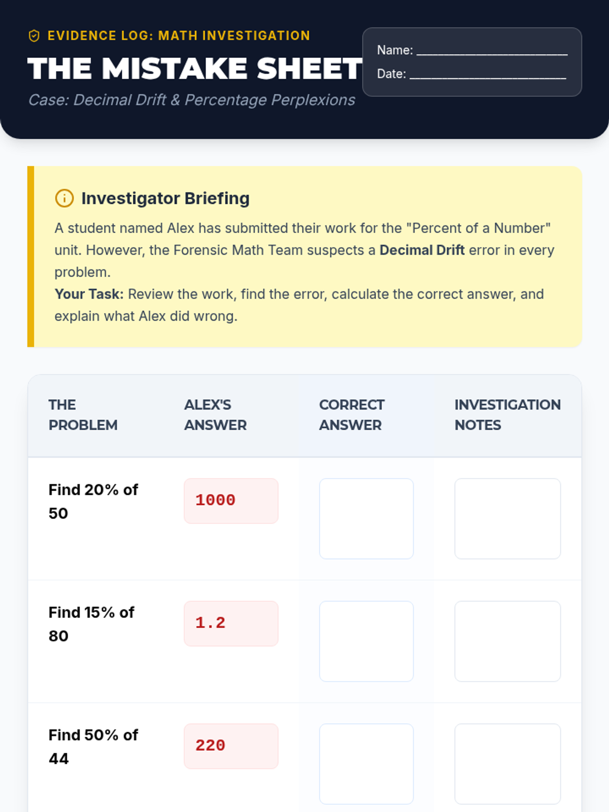 A lesson focused on identifying and correcting common errors in decimal multiplication when finding the percent of a number. Students act as 'detectives' to analyze 'The Mistake Sheet' and develop estimation strategies to verify their answers.