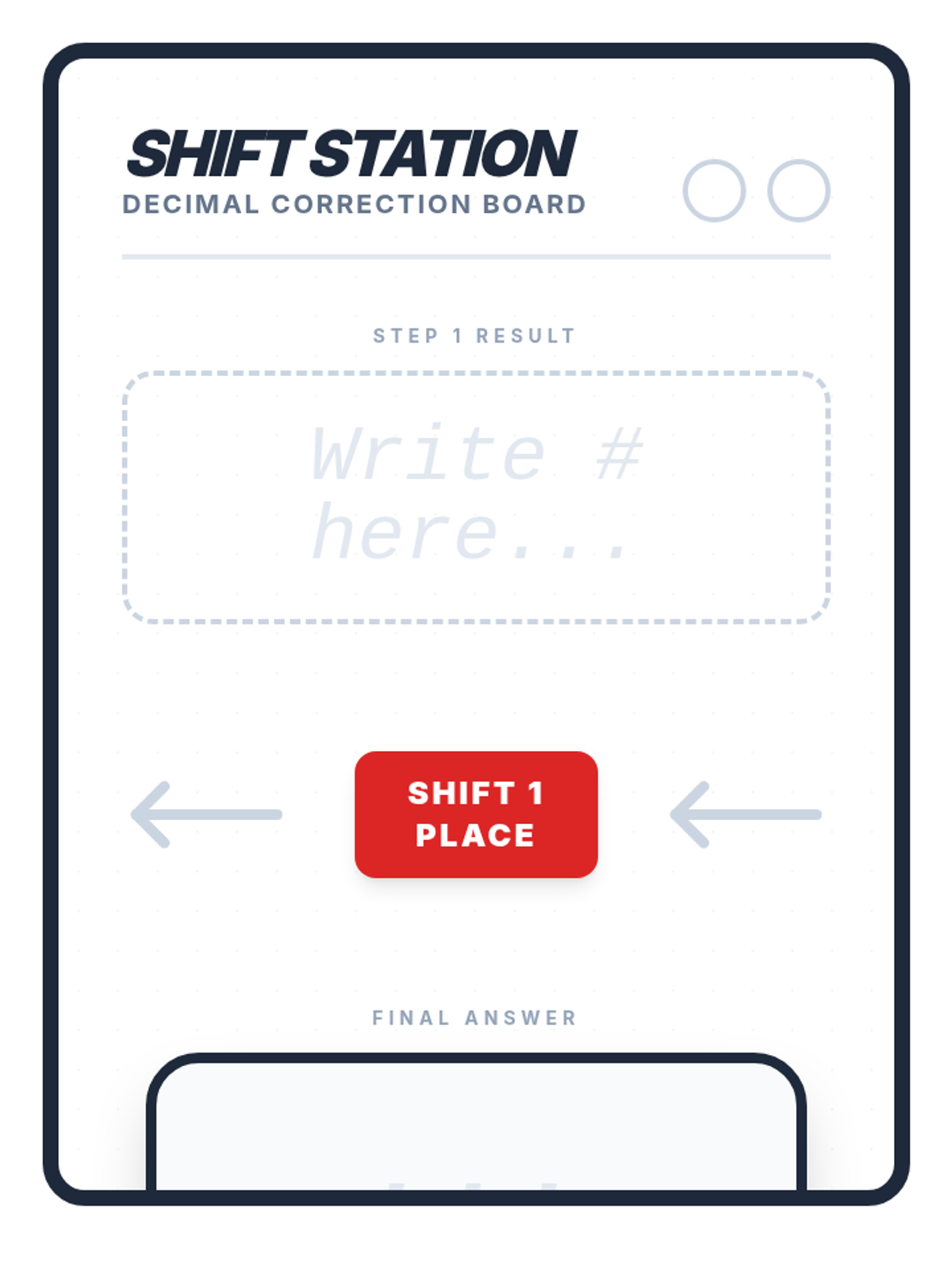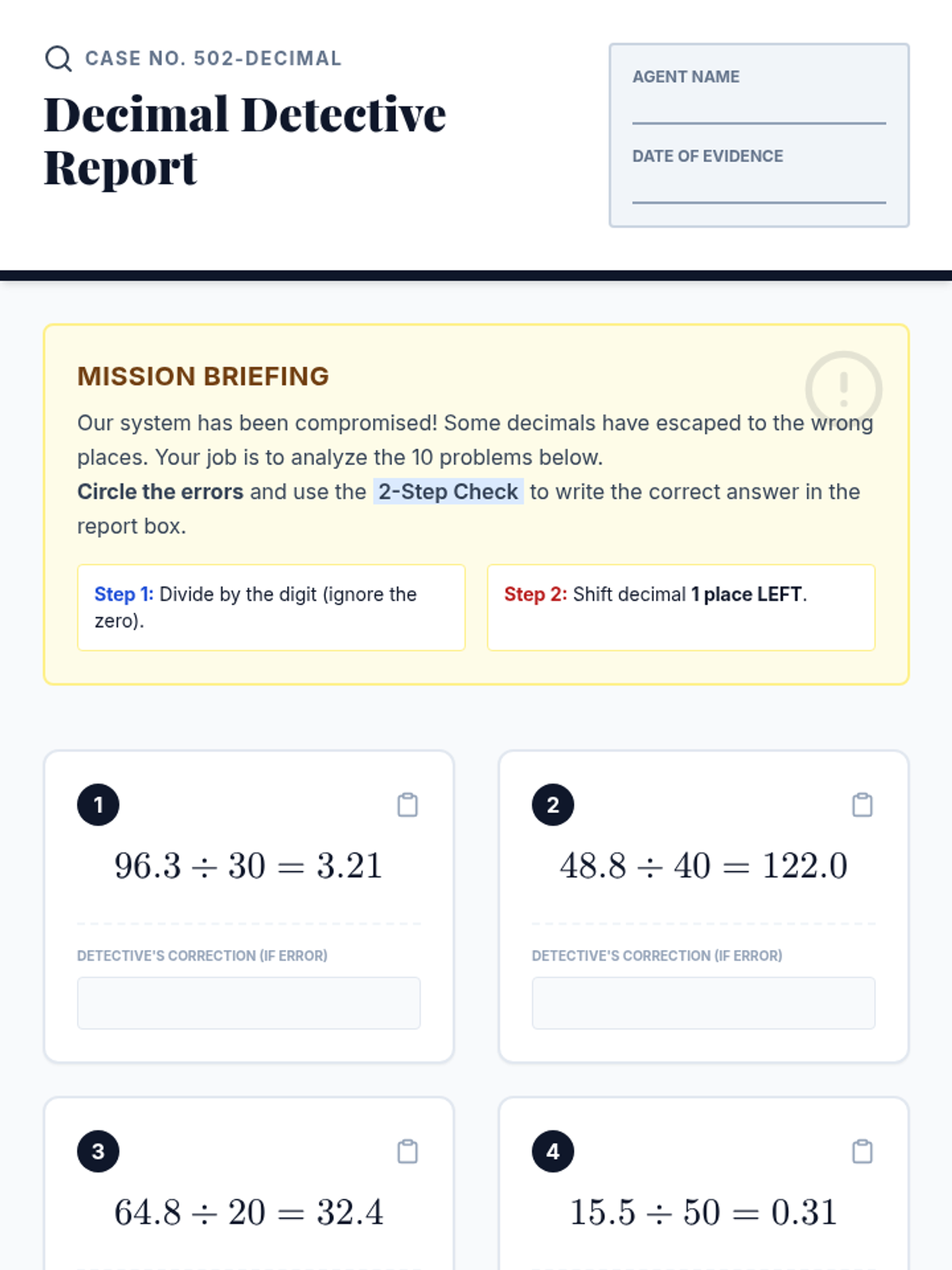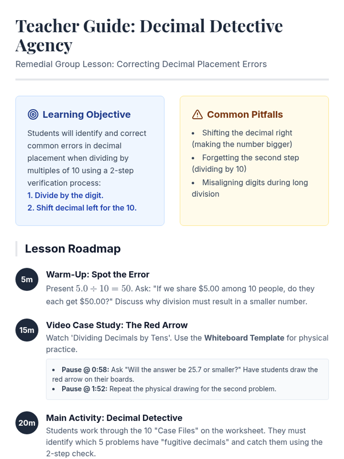 A remedial lesson for 5th and 6th graders focused on correcting decimal placement errors when dividing by multiples of 10. Students use a two-step method (divide by the digit, then shift by 10) to ensure accuracy.