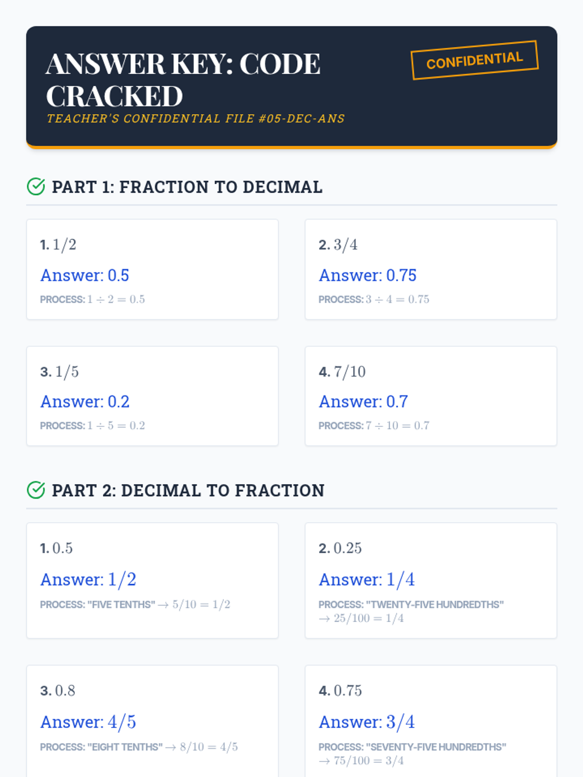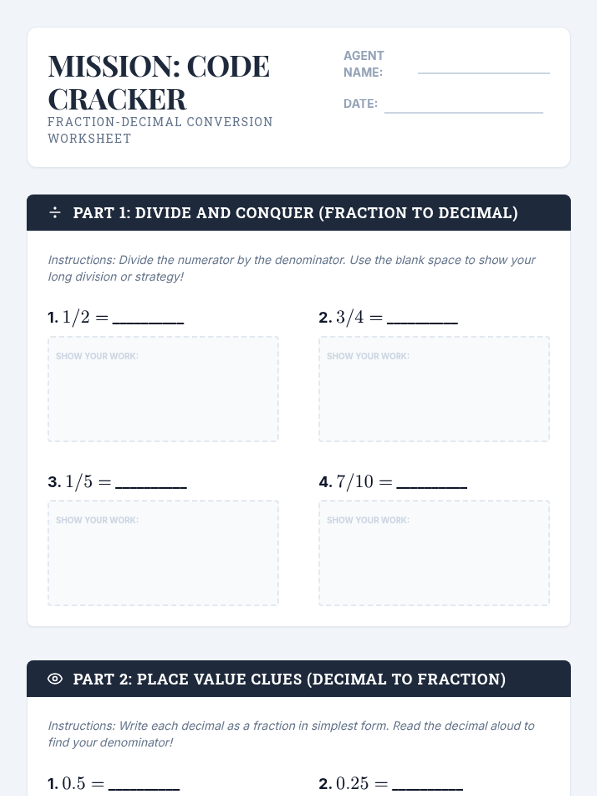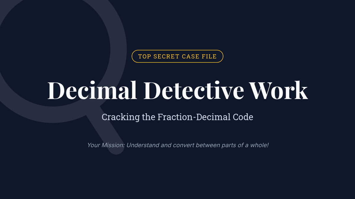 An interactive 45-minute session where 5th-grade 'Decimal Detectives' learn to crack the code of converting between fractions and decimals through division and place value exploration.