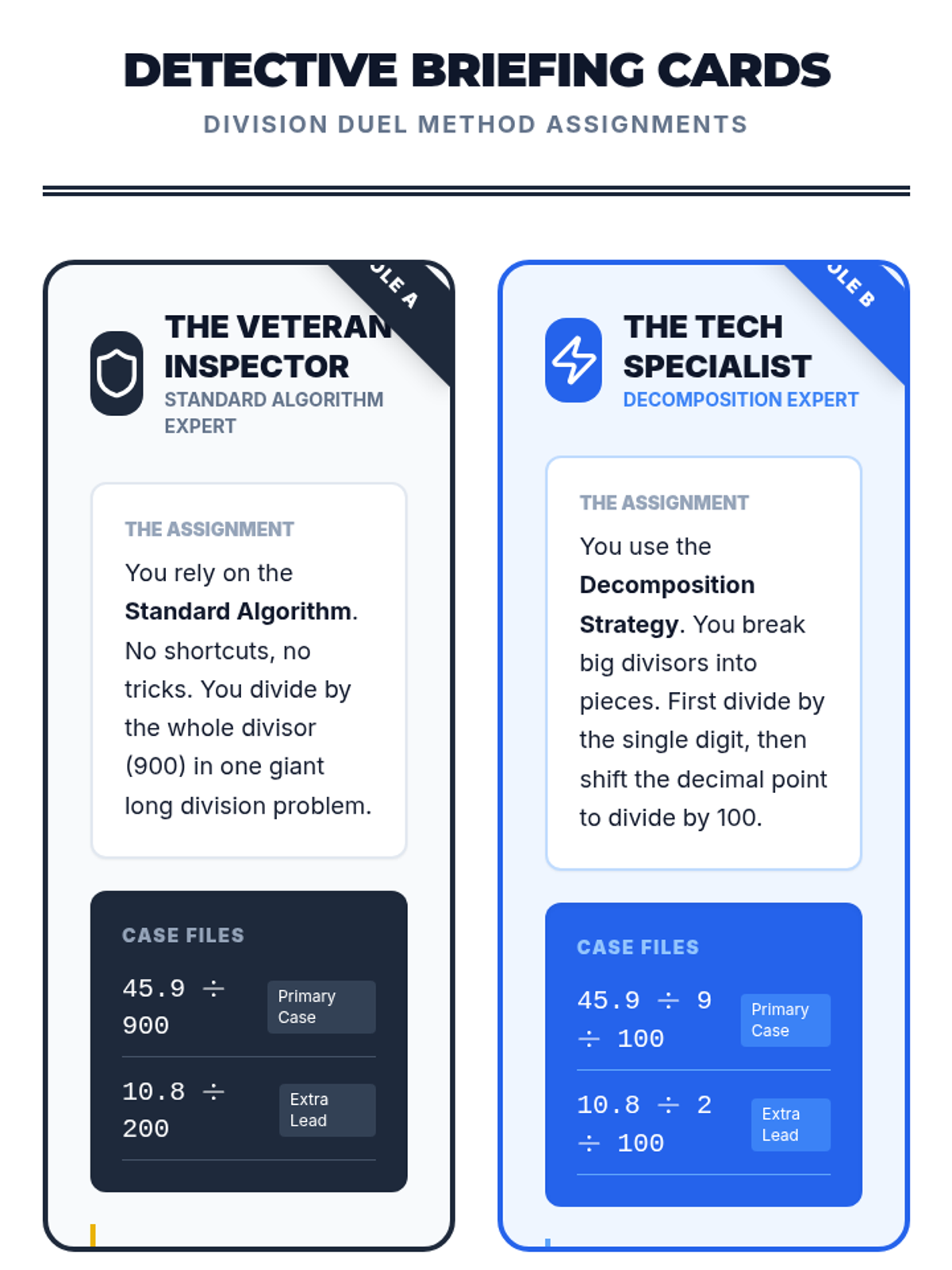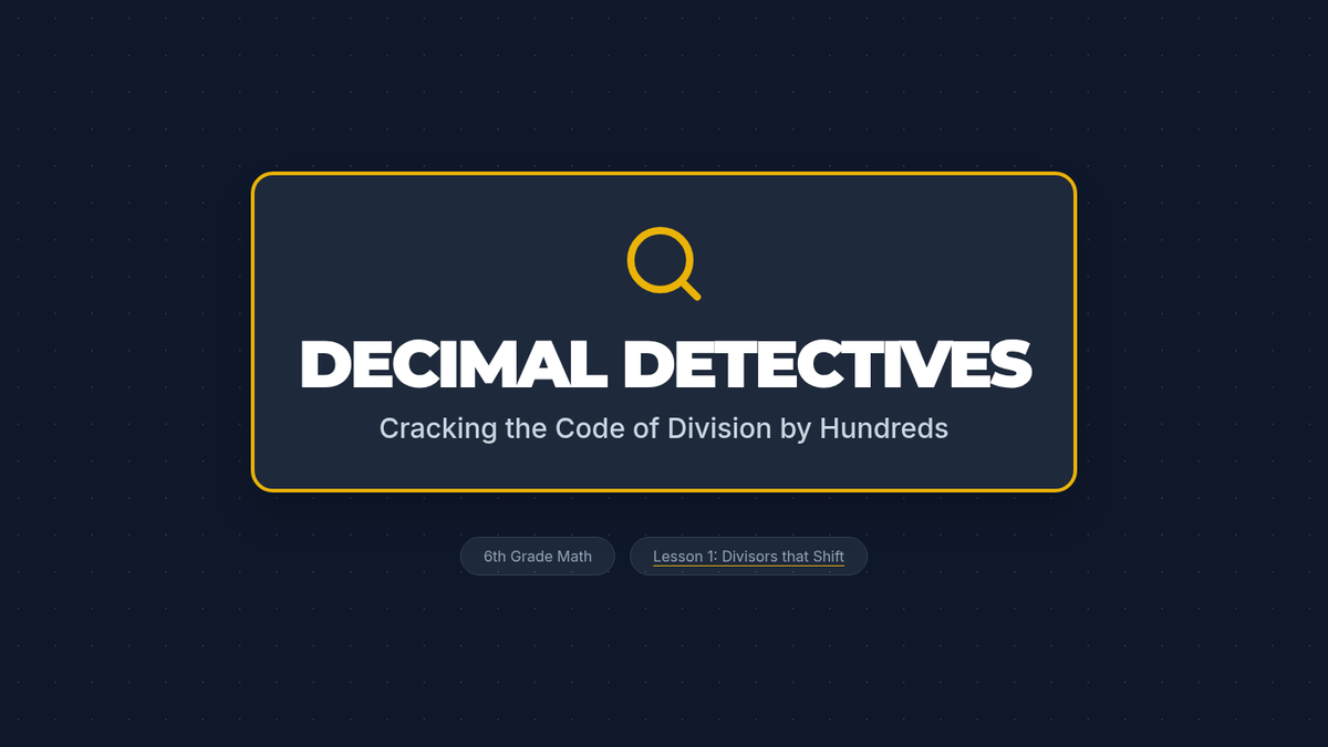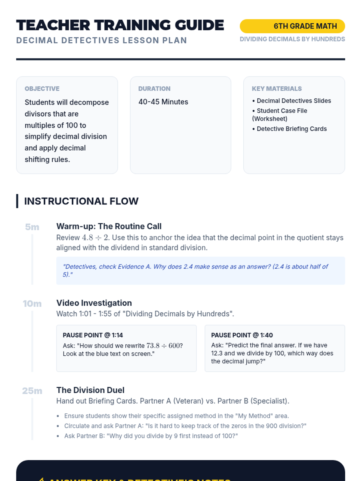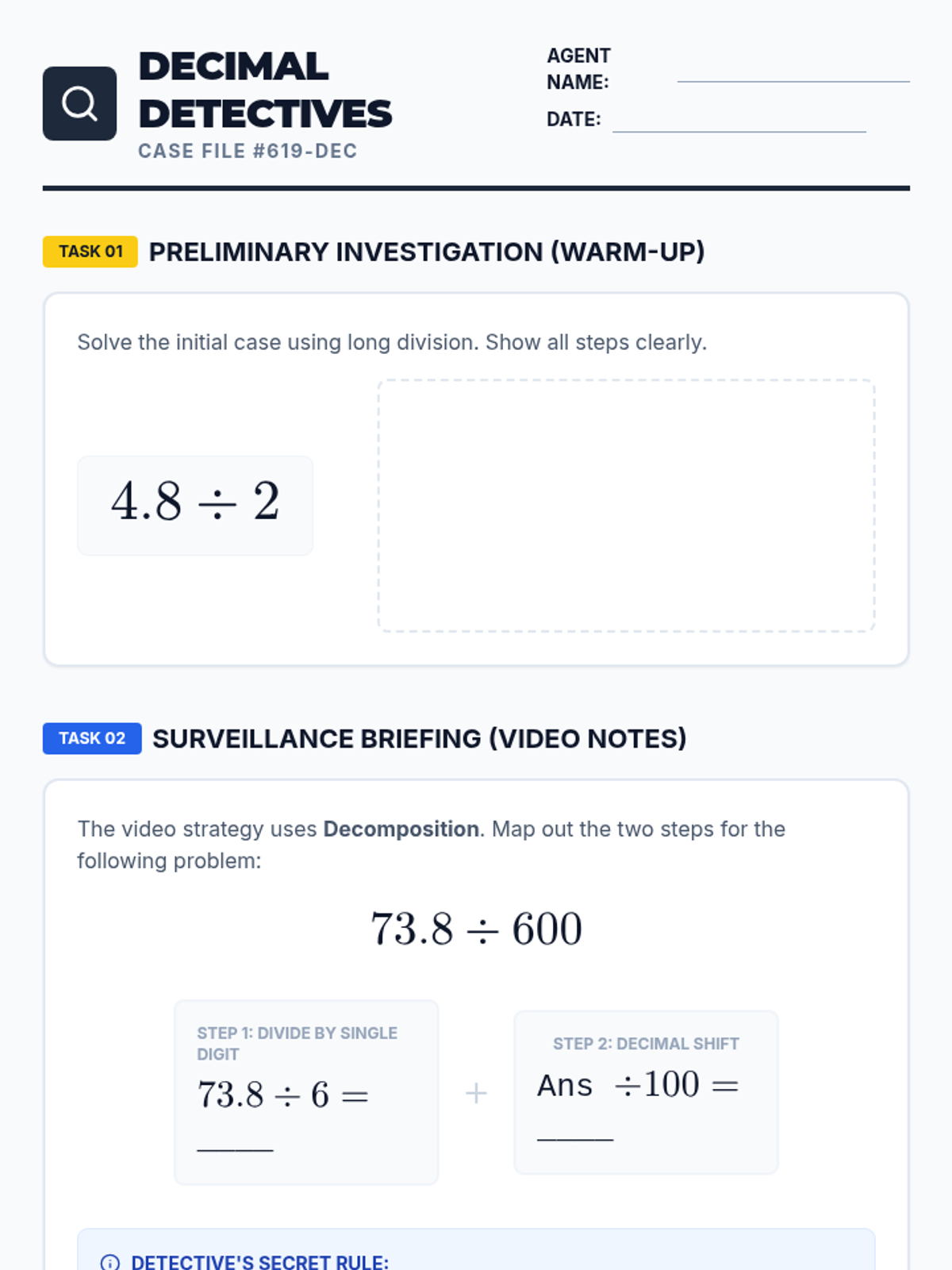 A 6th-grade math lesson focusing on dividing decimals by multiples of 100 using decomposition and decimal shifting. Students compare the efficiency of the standard algorithm versus the decomposition strategy in a 'Decimal Detectives' investigation.