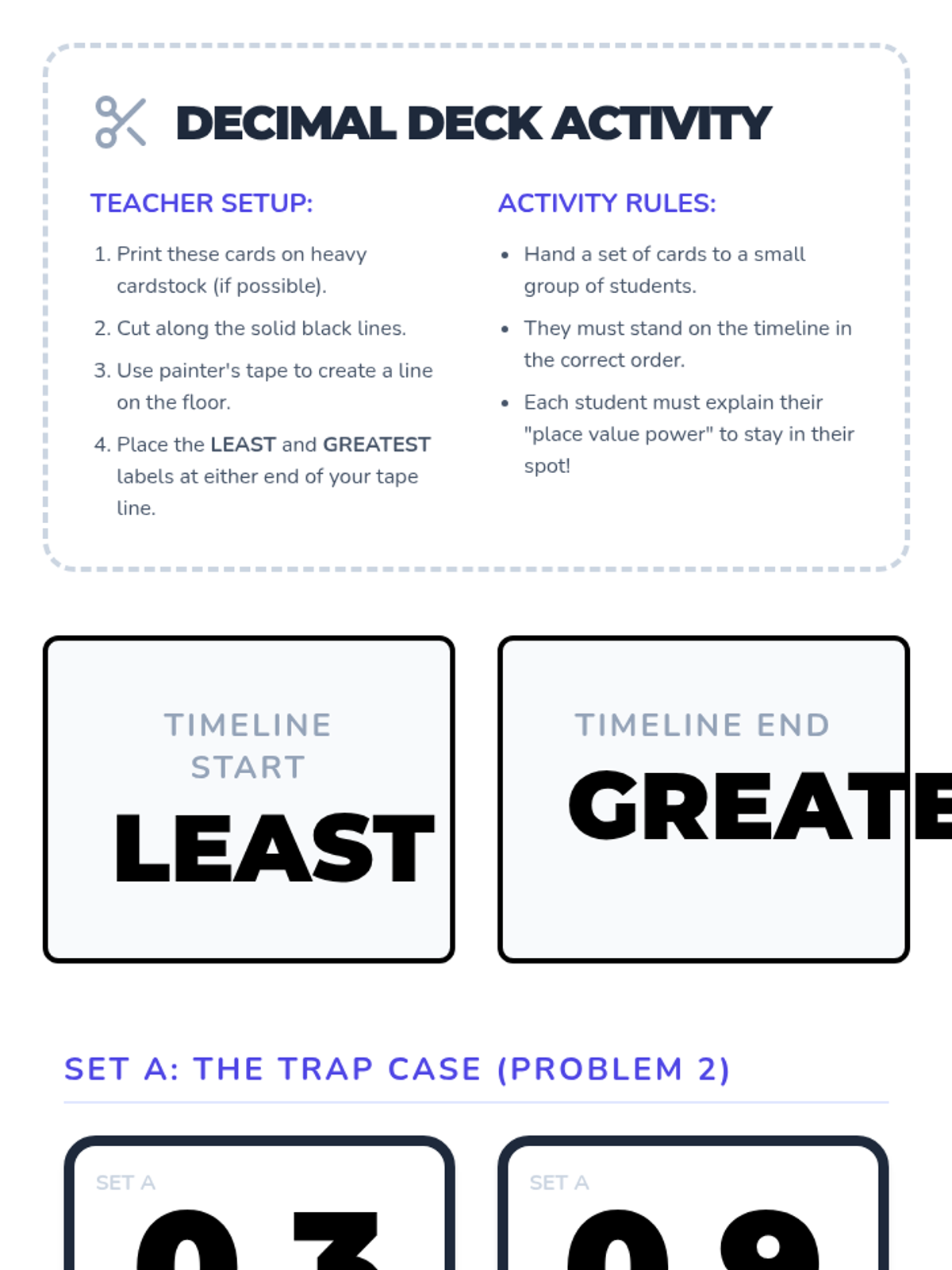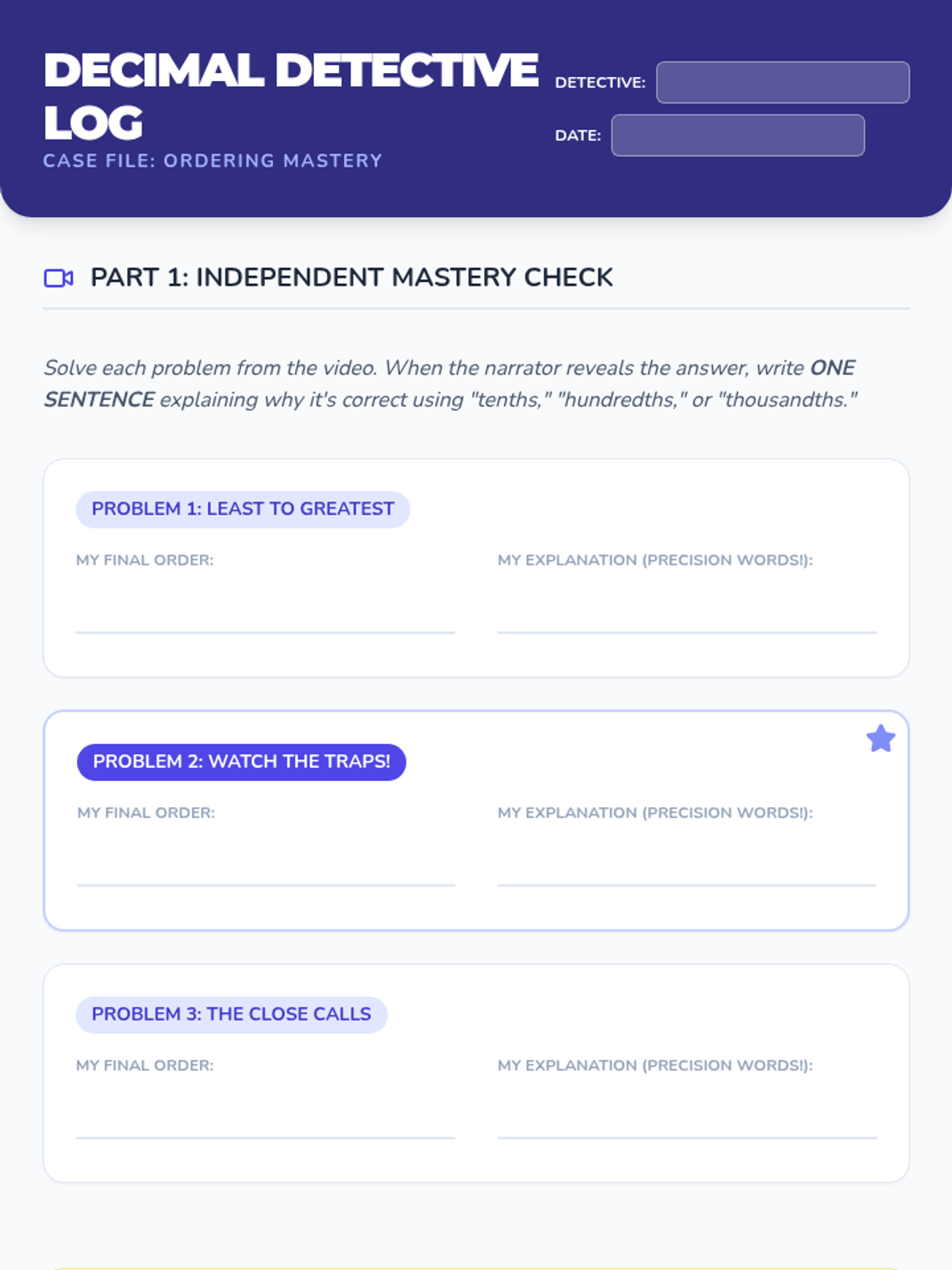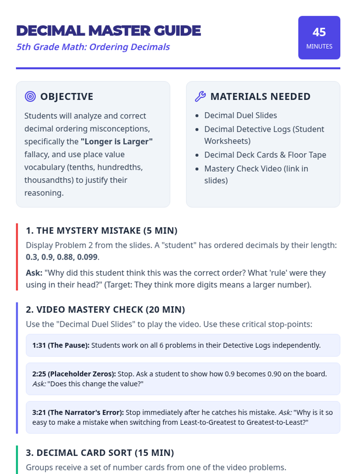A 5th-grade math lesson focused on identifying and correcting common misconceptions in ordering decimals, specifically the 'longer is larger' fallacy. Students engage with a mastery check video, analyze errors, and participate in a physical timeline card sort activity.