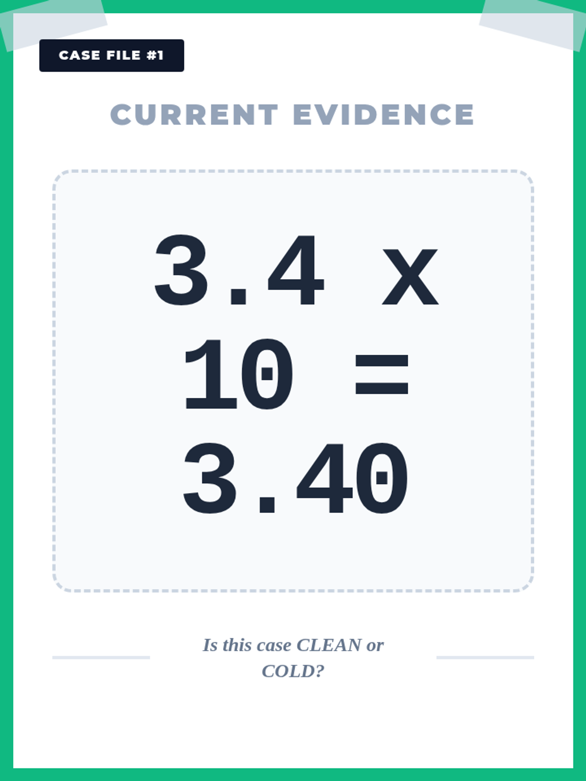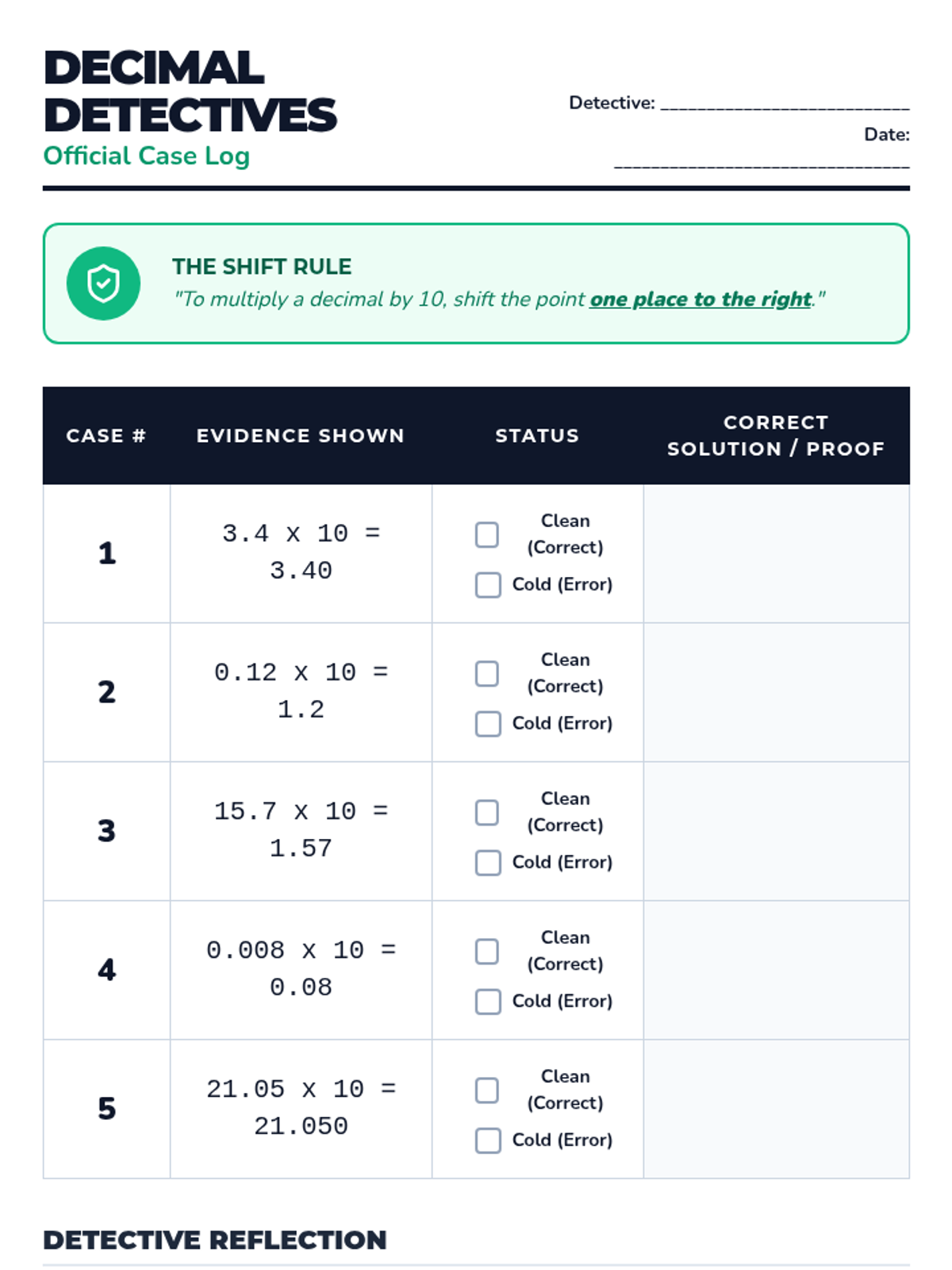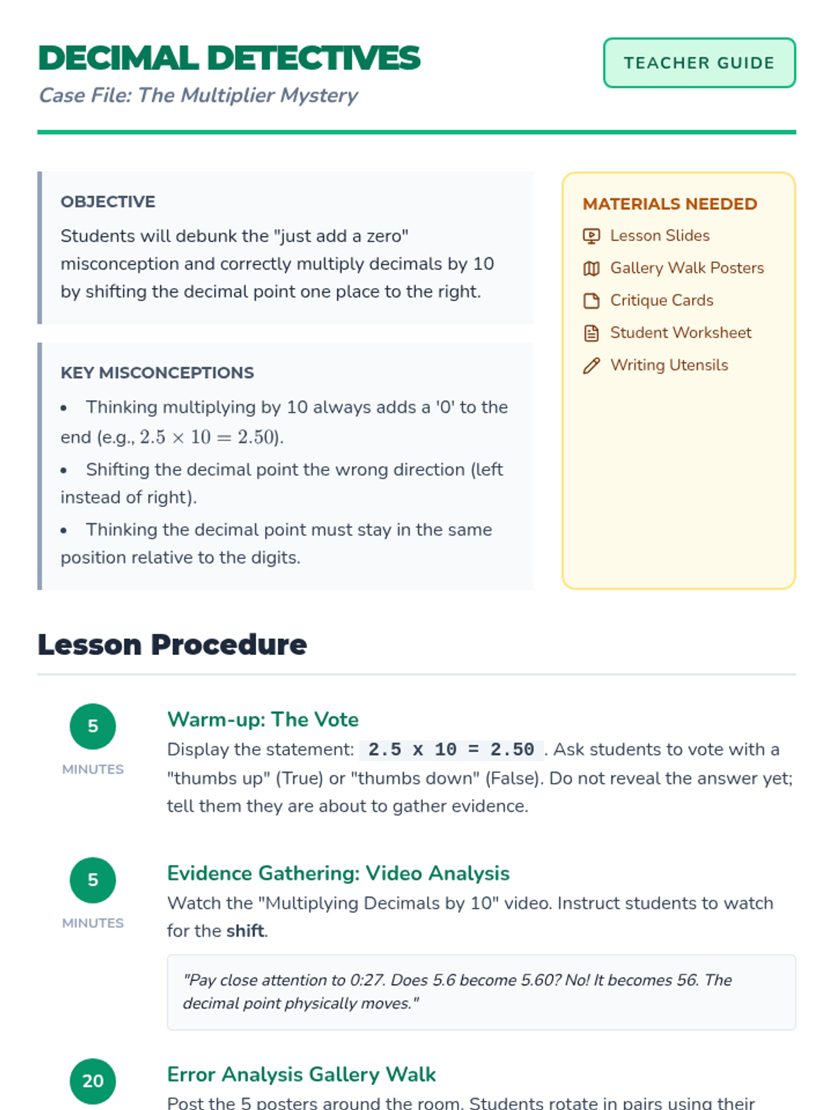 A 6th-grade intervention lesson focused on correcting the 'add a zero' misconception when multiplying decimals by 10. Students act as 'Decimal Detectives' to find and fix errors in a gallery walk.