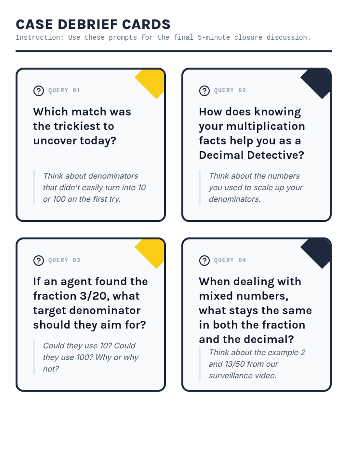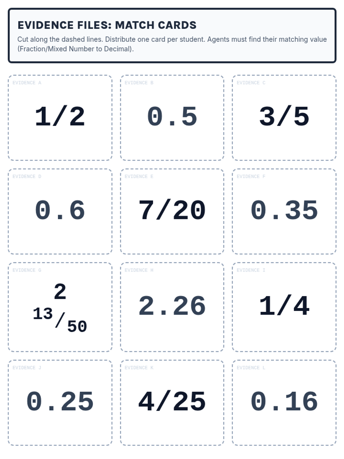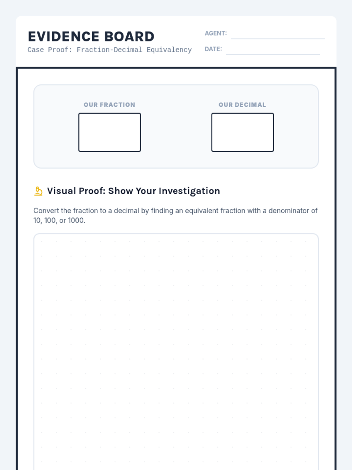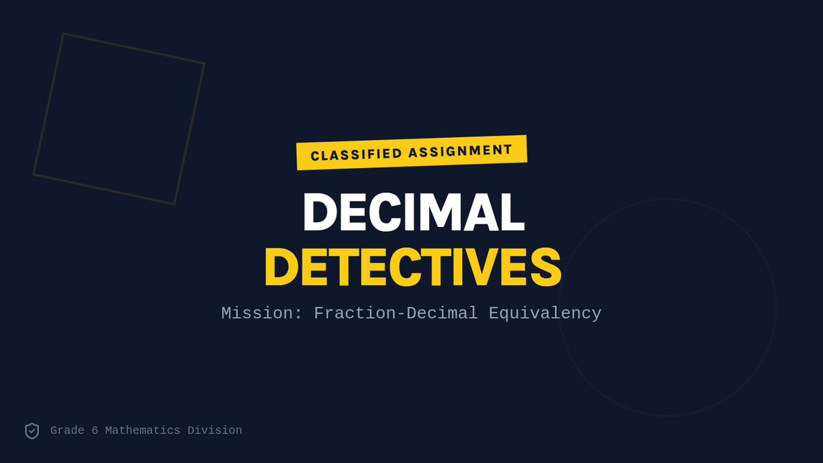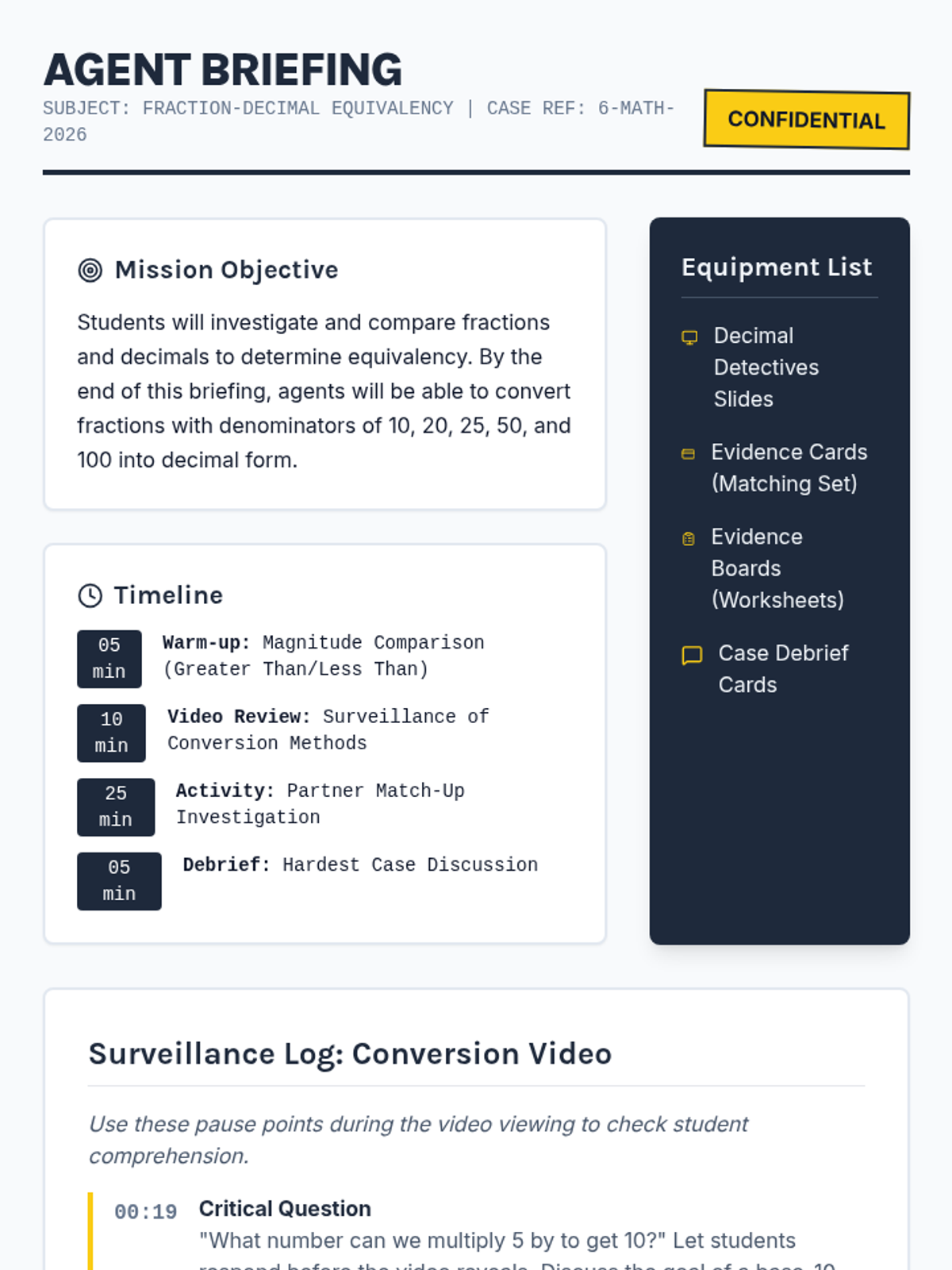 A 6th-grade math lesson where students act as 'Decimal Detectives' to uncover equivalent fractions and decimals through video analysis and a partner-matching investigation.