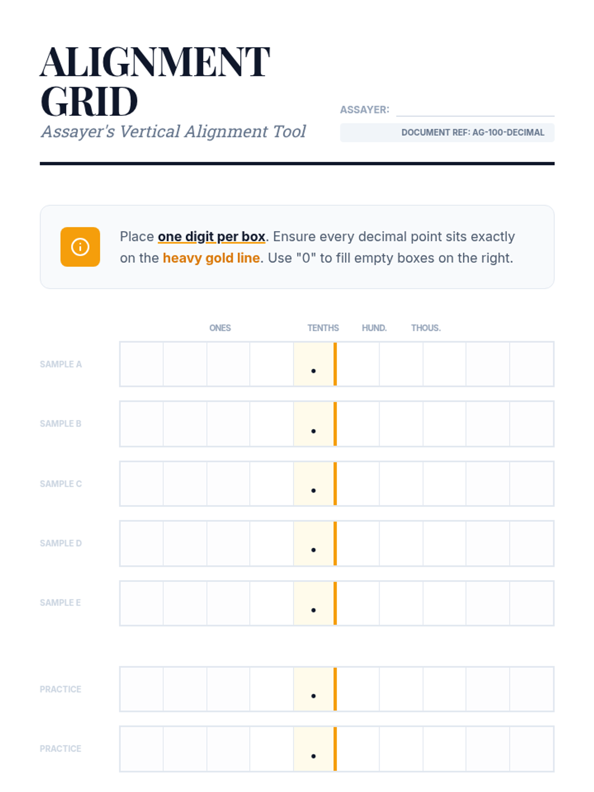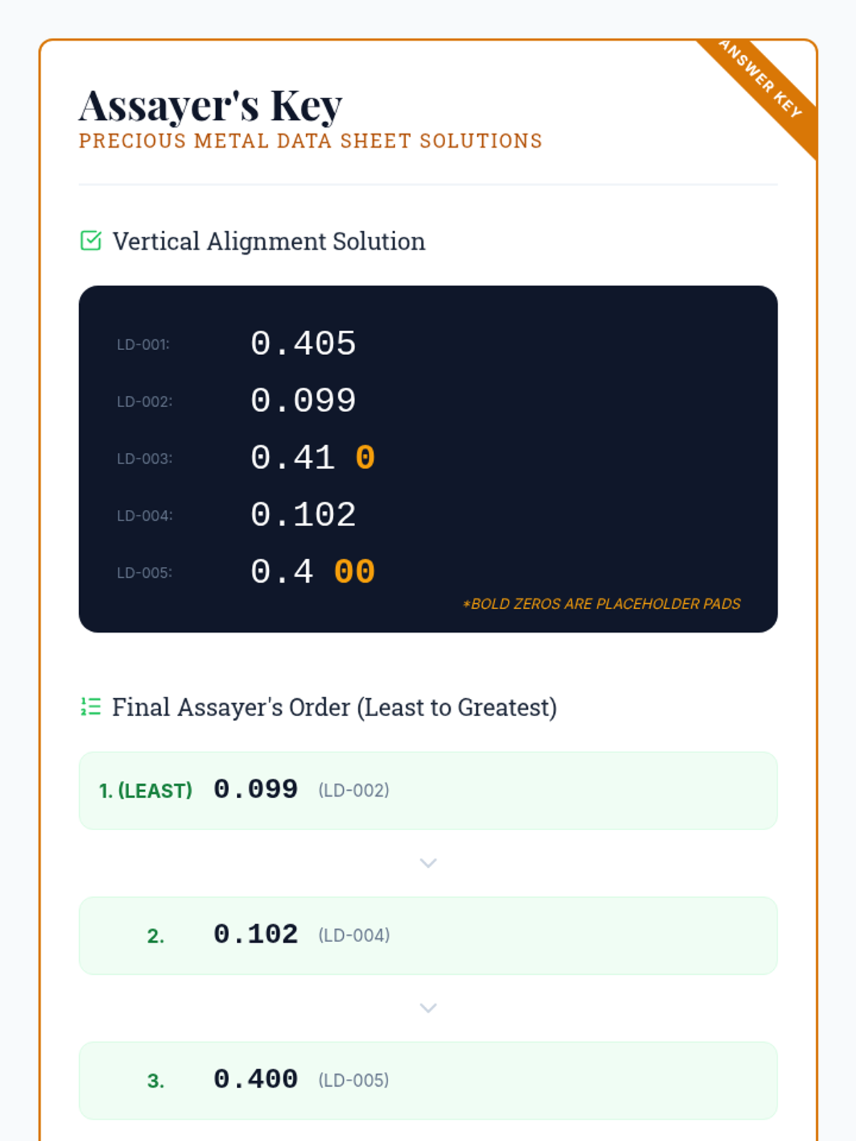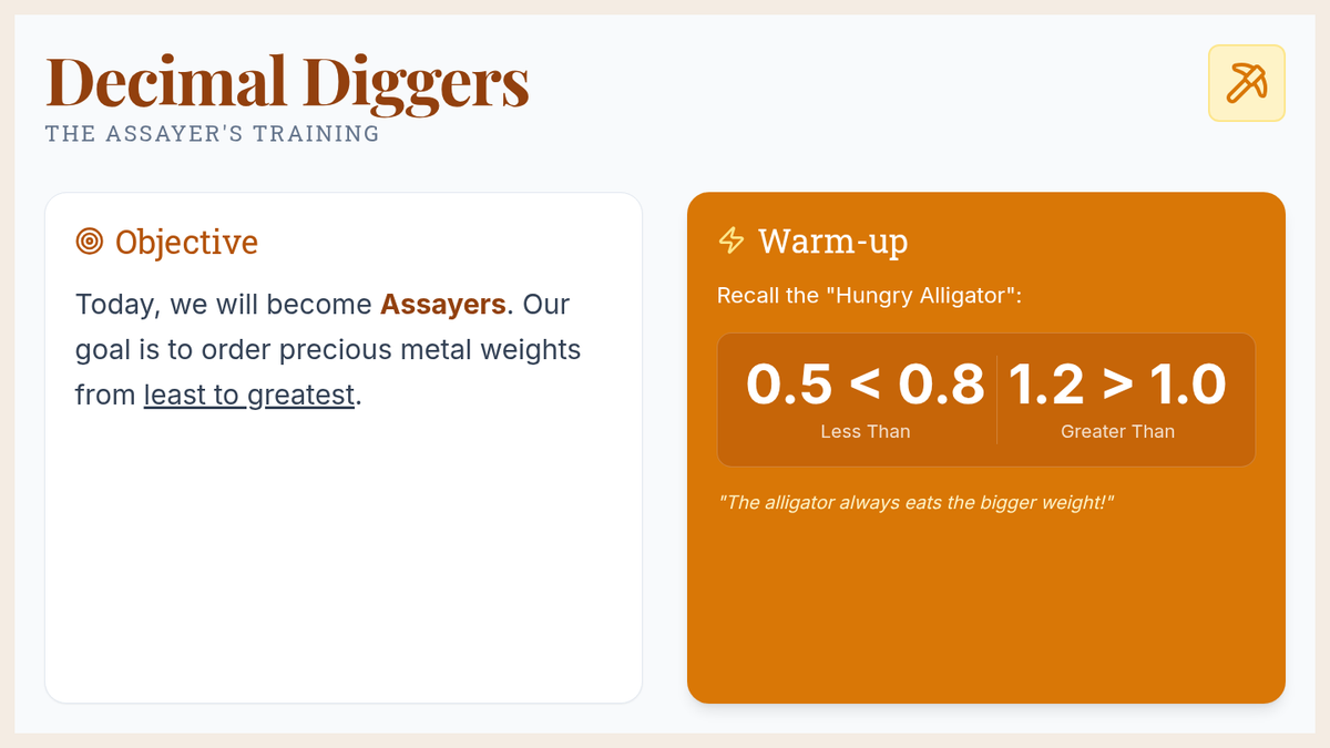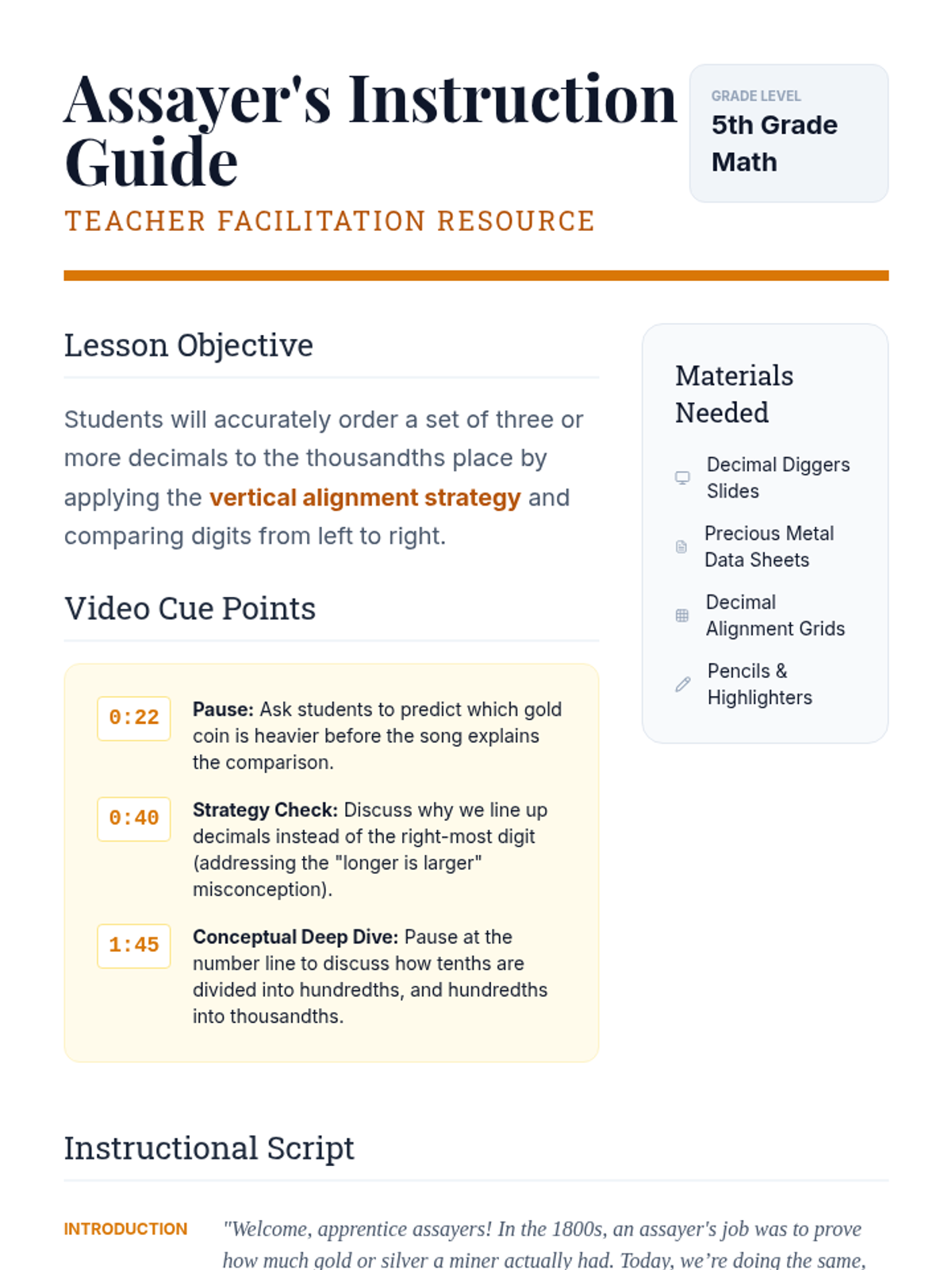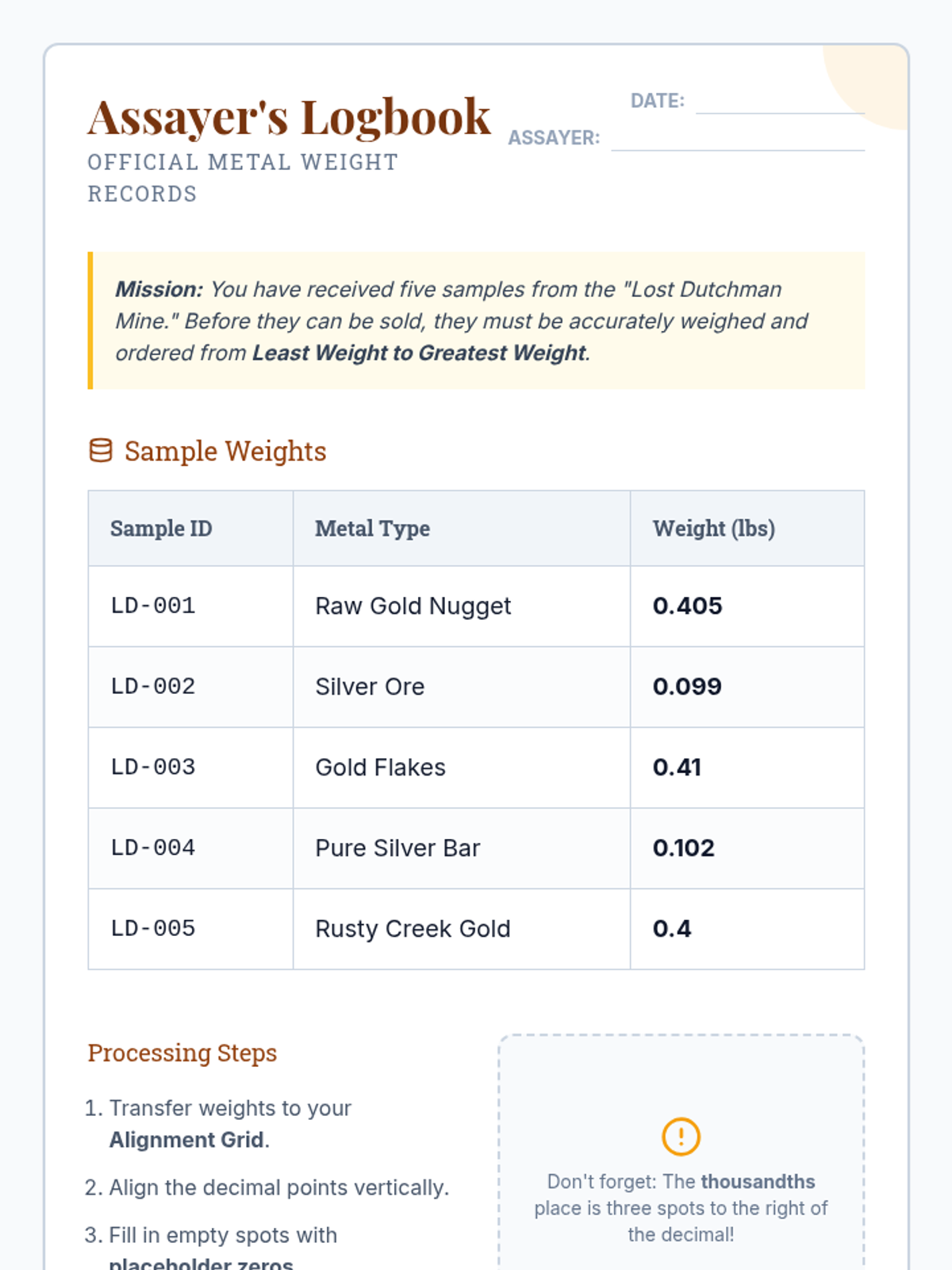 A 5th-grade math lesson focused on ordering decimals to the thousandths place through a gold mining 'Assayer's Office' simulation. Students use vertical alignment strategies and video reinforcement to compare and order precious metal weights.