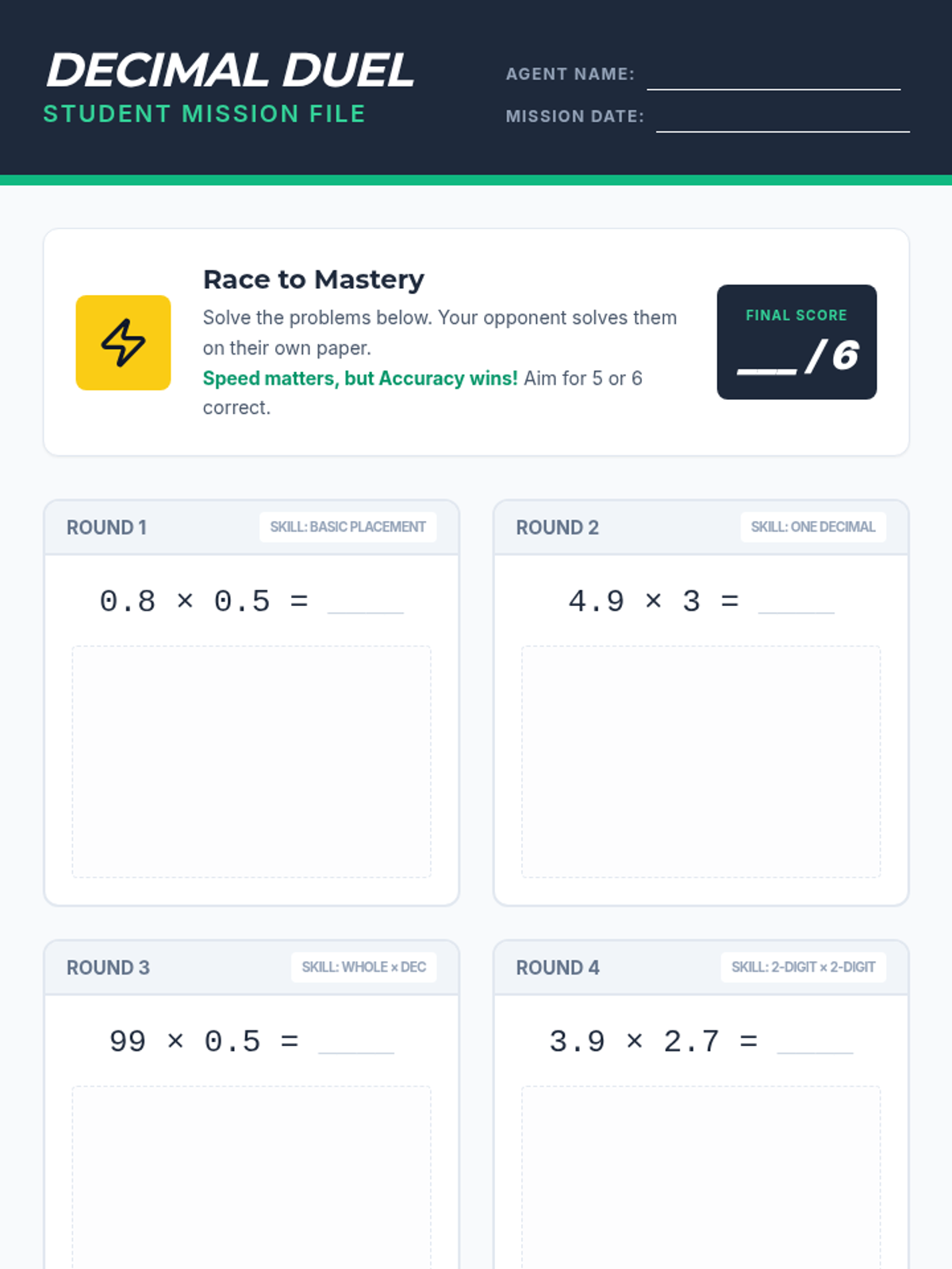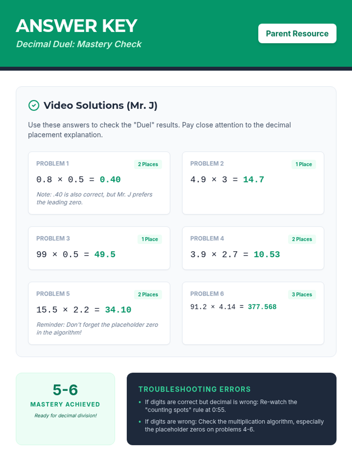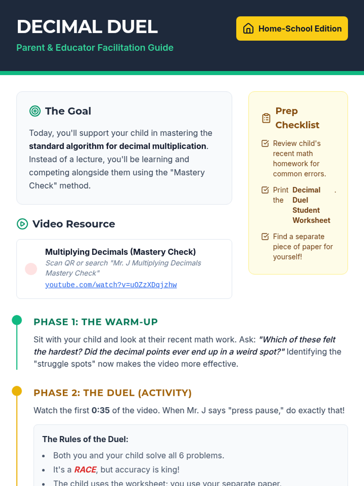 A home-school lesson focused on mastering decimal multiplication through a friendly 'race' and mastery check using Mr. J's instructional video. Parents and students work alongside each other to practice the standard algorithm and error analysis.