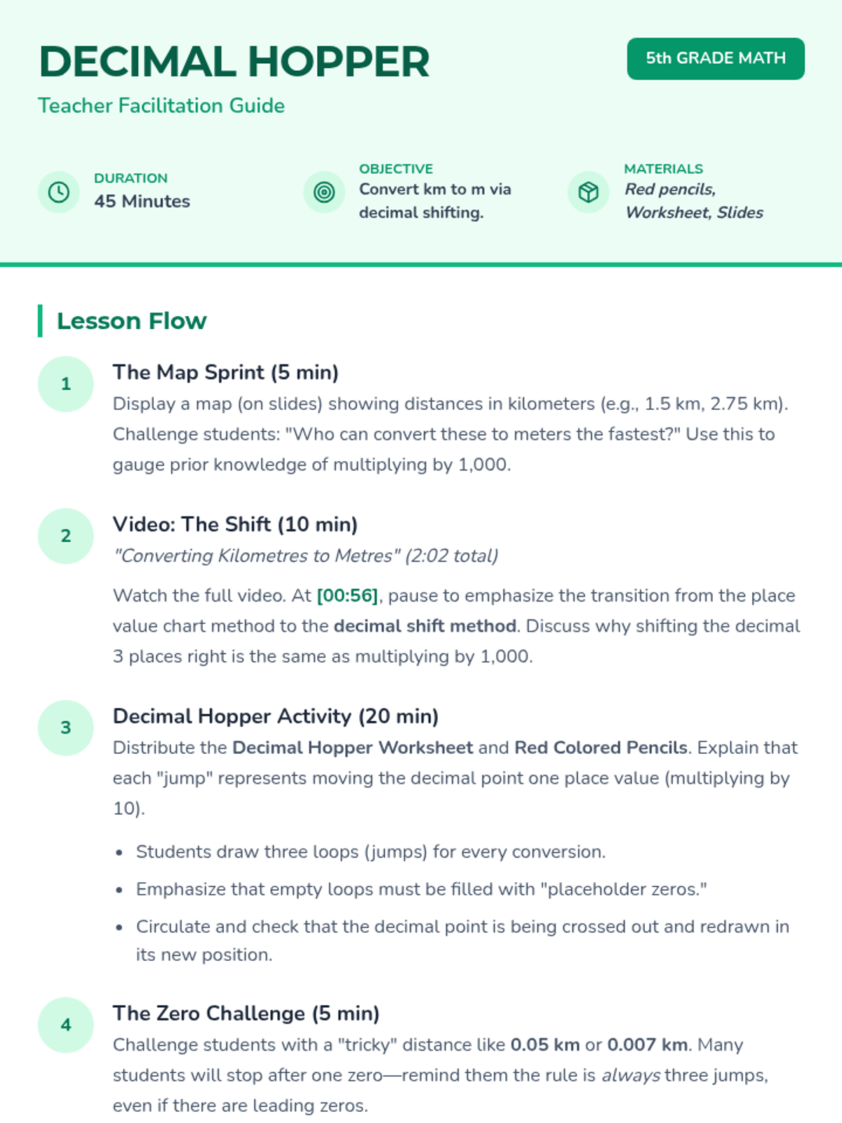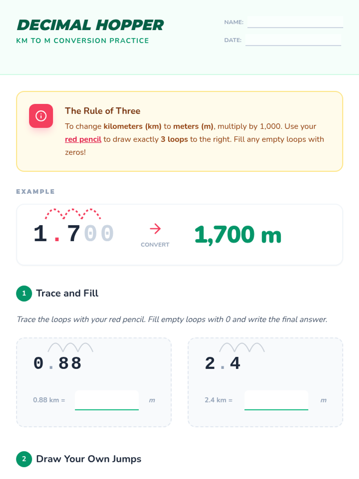 Students learn to convert kilometers to meters using the decimal shift method, visualizing the conversion as 'jumps' of the decimal point three places to the right.