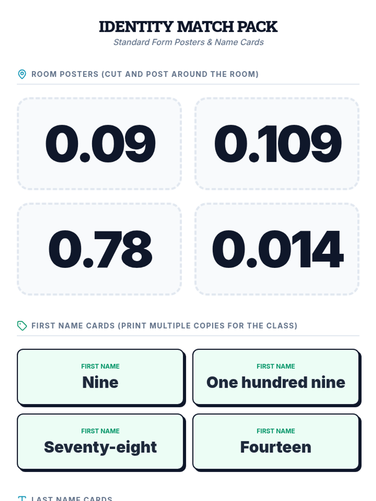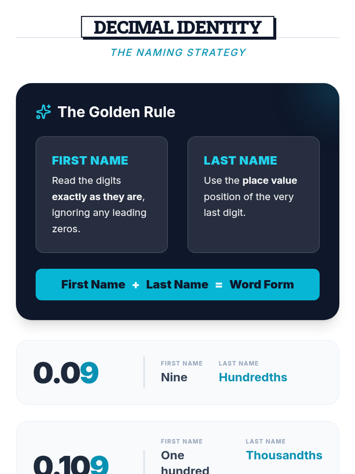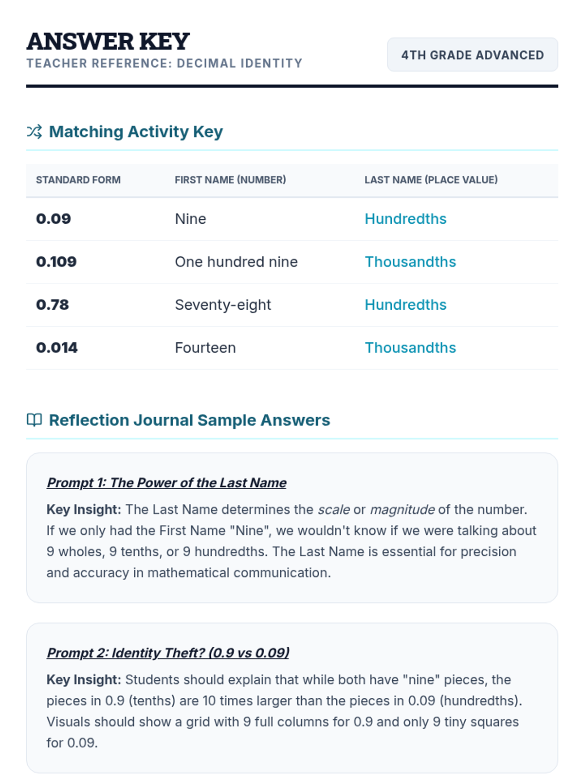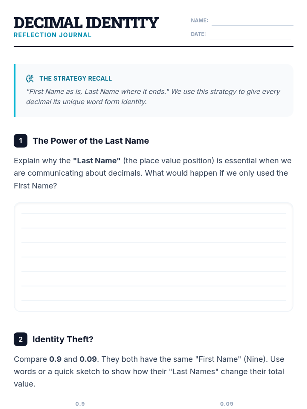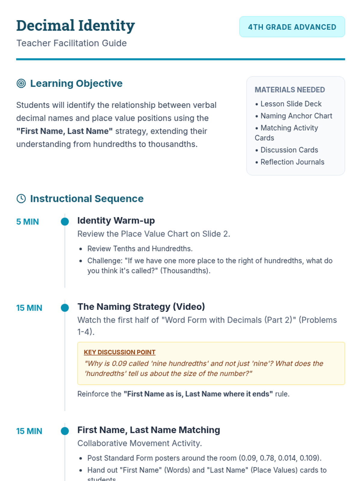 In this advanced 4th-grade lesson, students master the "First Name, Last Name" strategy for reading decimals. By watching targeted video segments and engaging in a collaborative matching activity, students learn to connect verbal decimal names with their specific place value positions up to the thousandths.