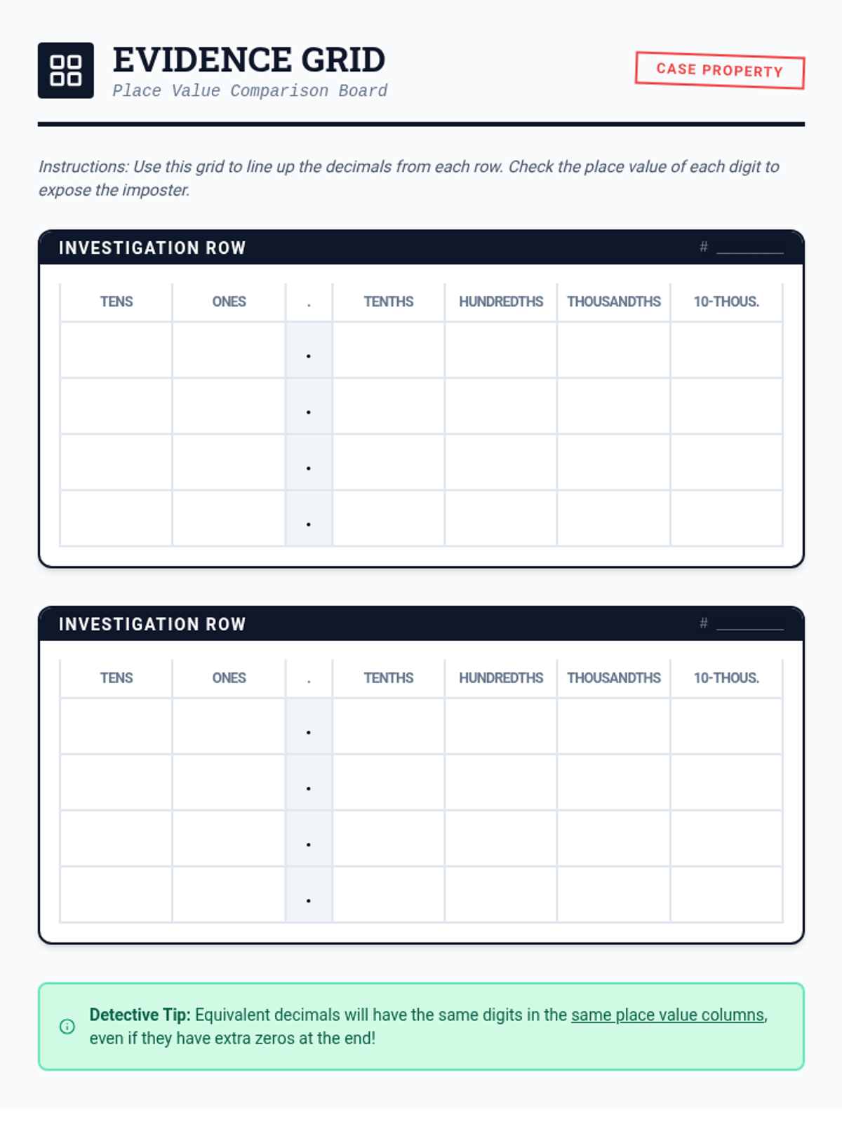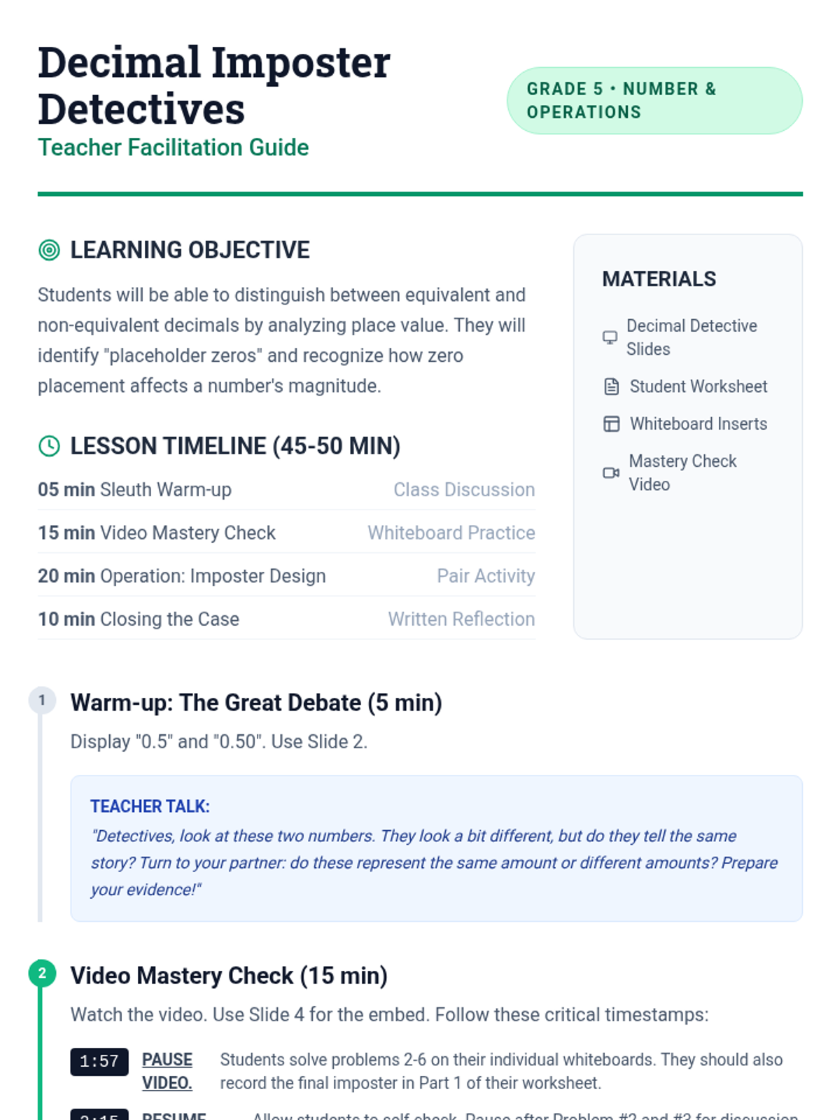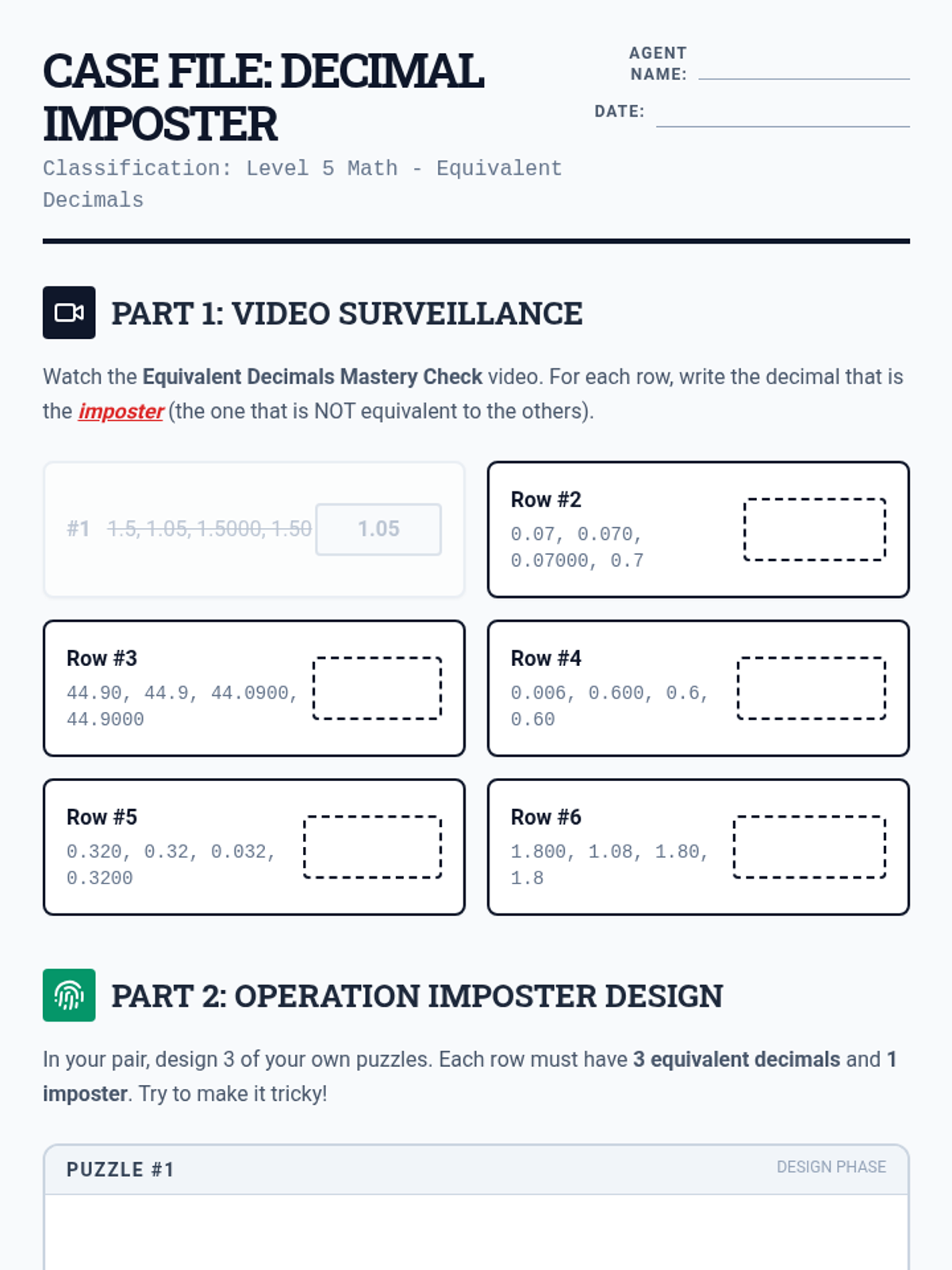 Students will learn to identify equivalent decimals and spot 'imposters' by analyzing place value through a video-guided mastery check and a creative puzzle-design activity.