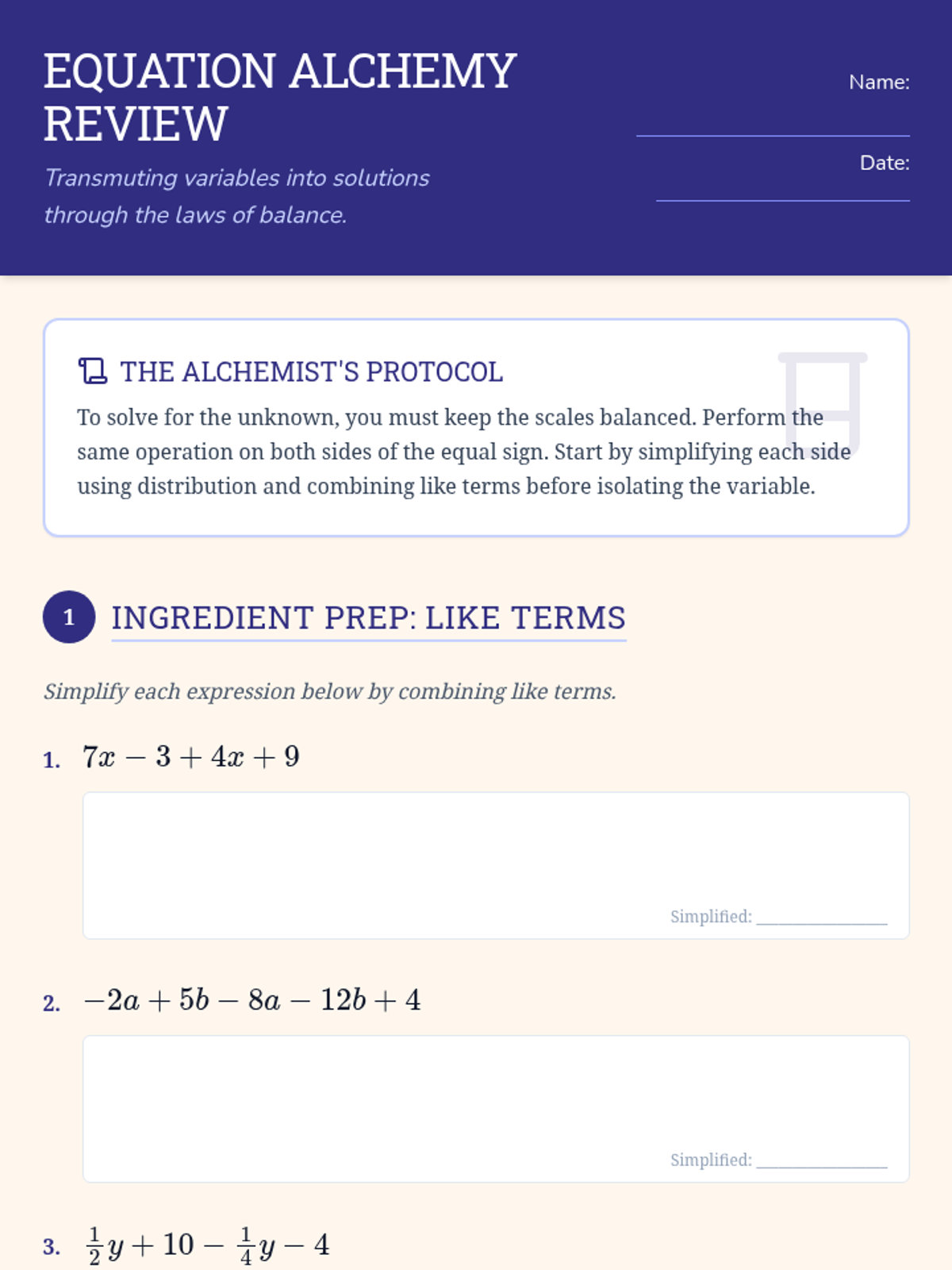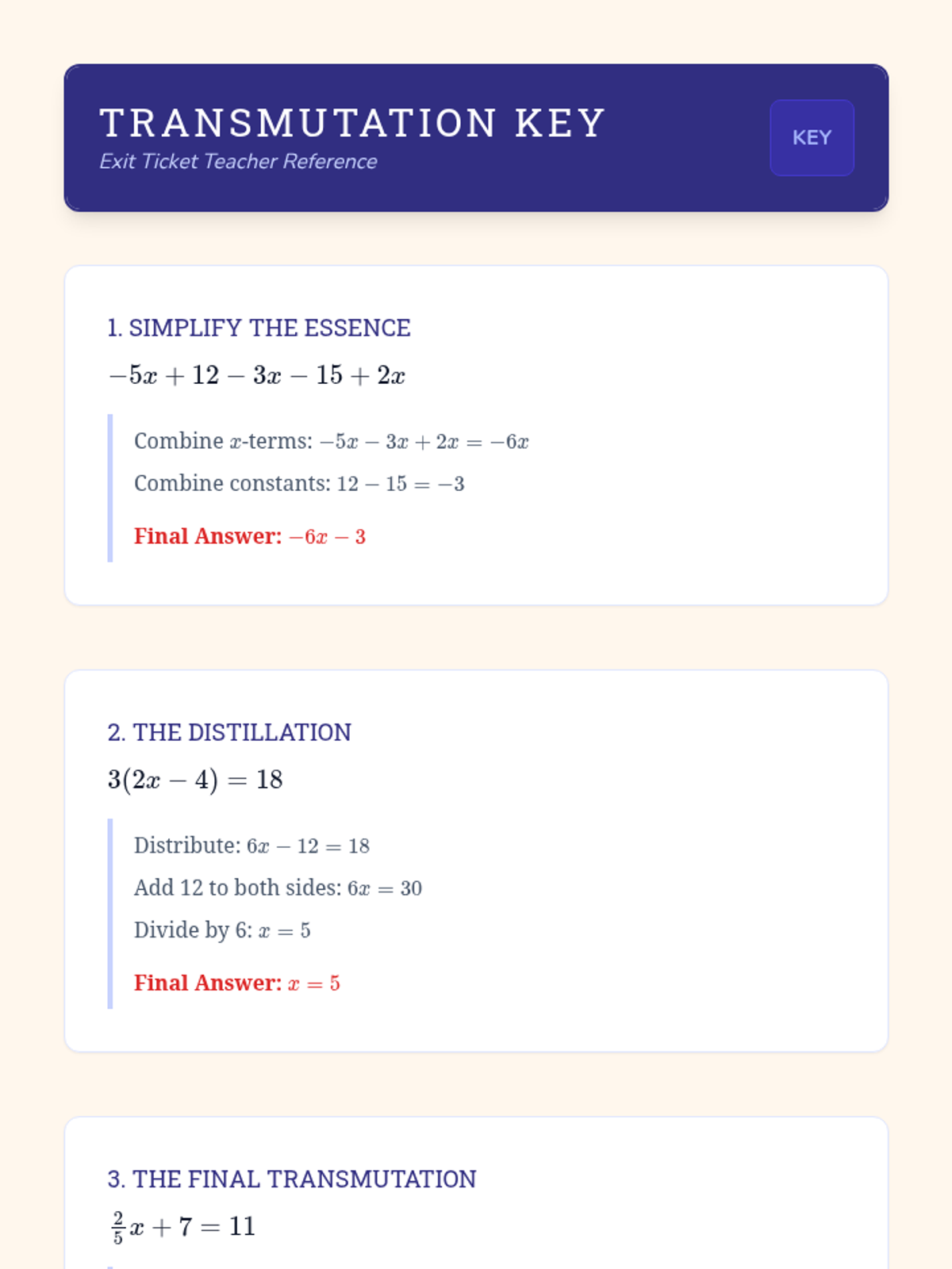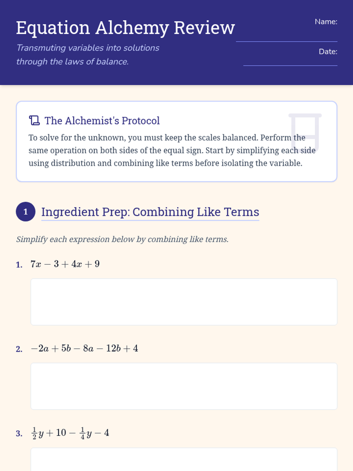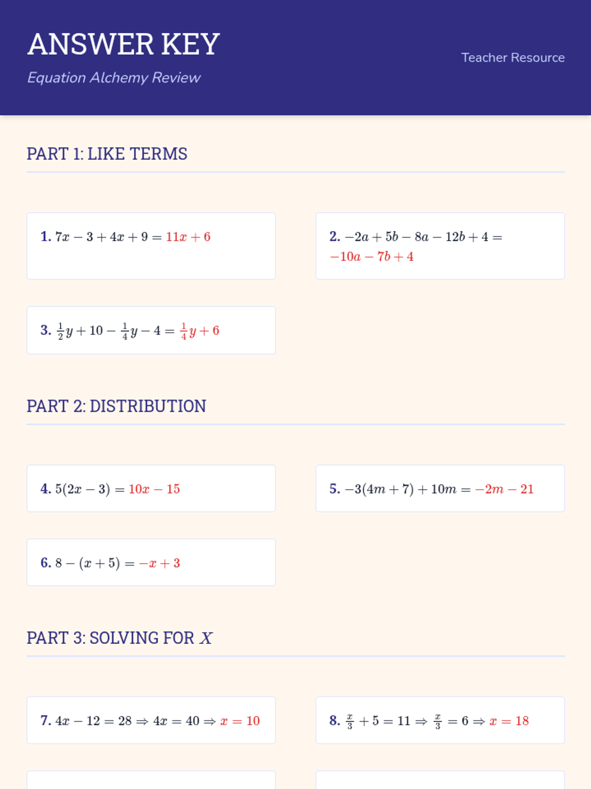 A comprehensive review of linear equation fundamentals, focusing on combining like terms, the distributive property, and solving multi-step equations with integers and fractions.