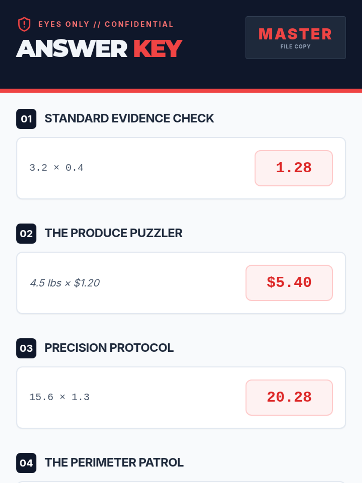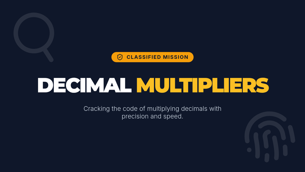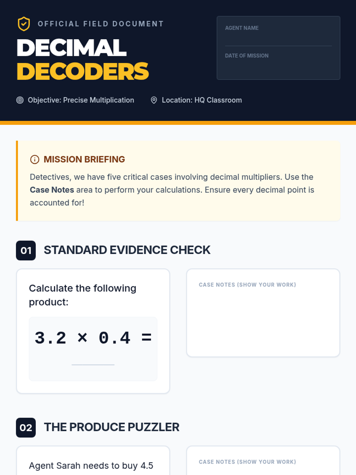A detective-themed lesson on decimal multiplication, featuring strategy slides and a problem-solving worksheet.