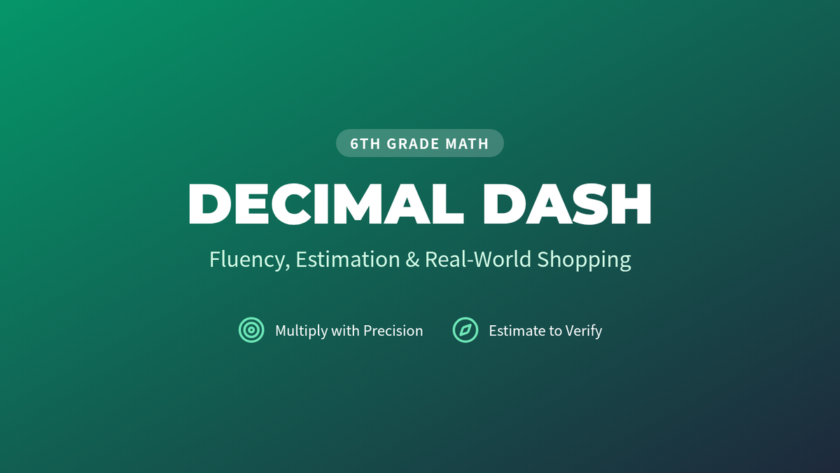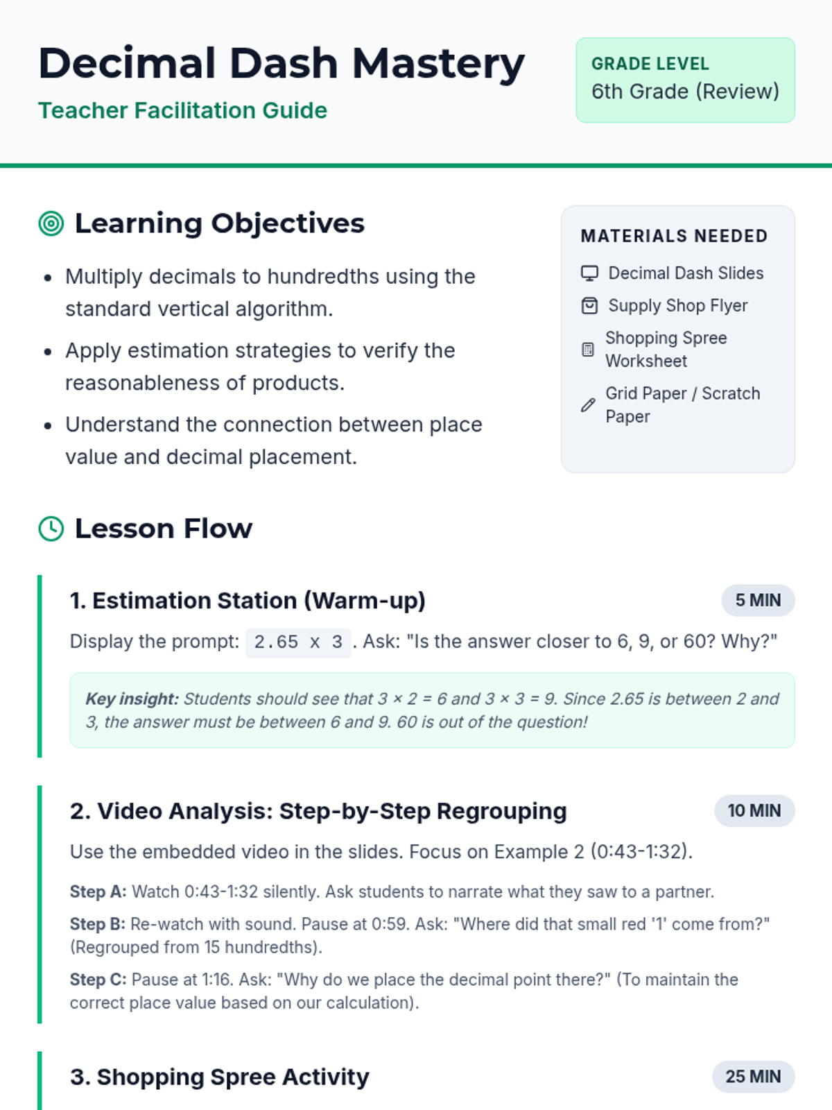 A 6th-grade review lesson focusing on decimal multiplication fluency through estimation and the standard vertical algorithm, featuring a realistic shopping simulation.