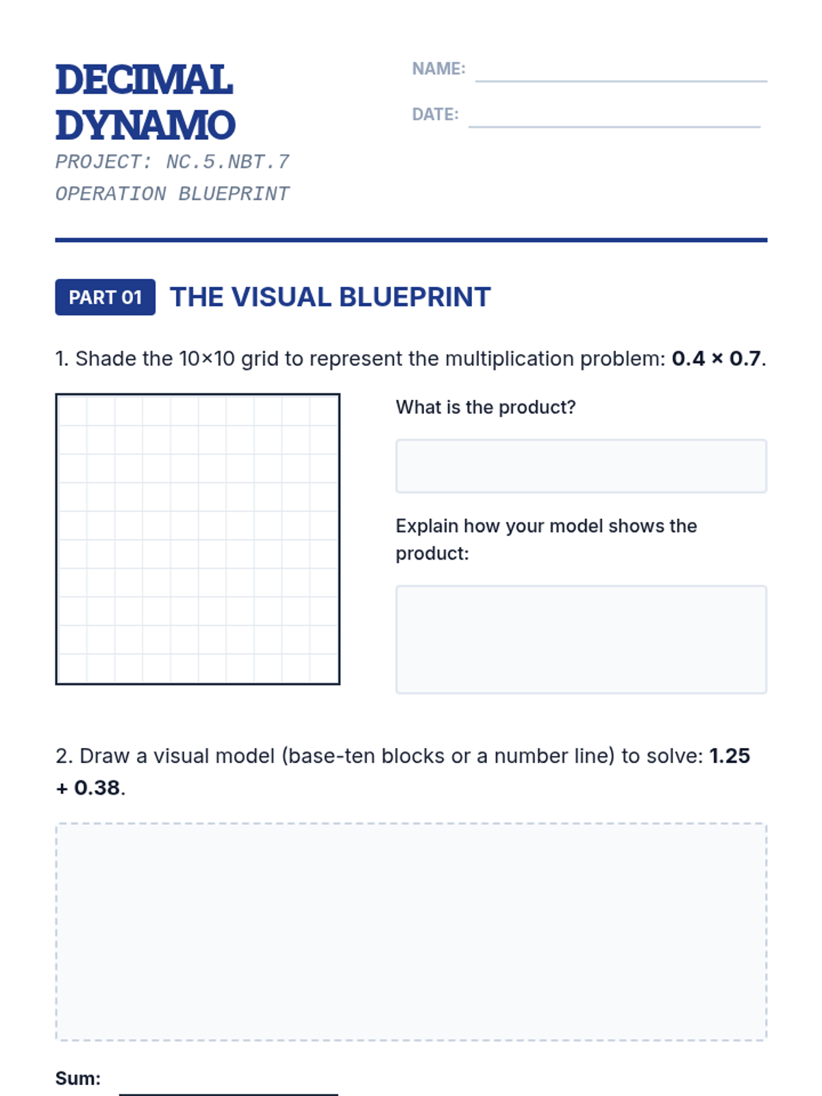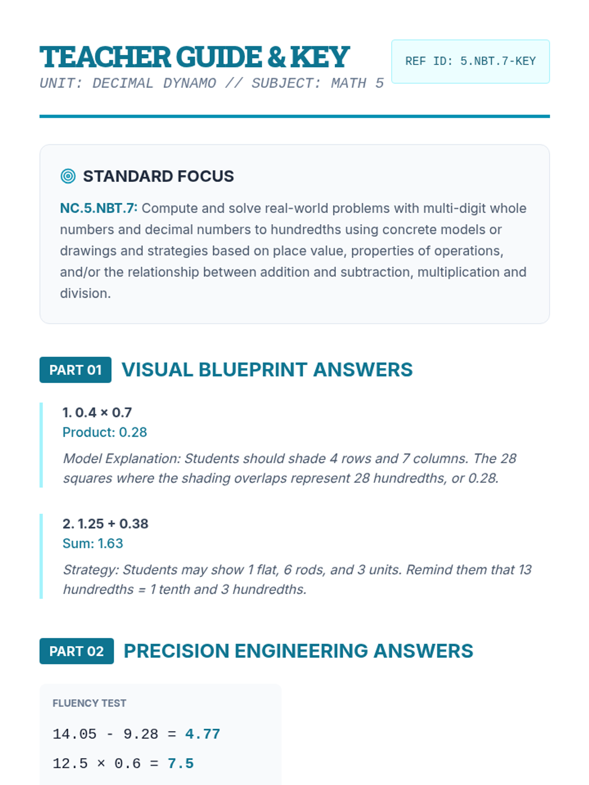 This lesson prepares 5th-grade students for the NC EOG by mastering addition, subtraction, multiplication, and division of decimals to hundredths. It emphasizes visual models, place value strategies, and solving multi-step word problems in real-world money and measurement contexts.