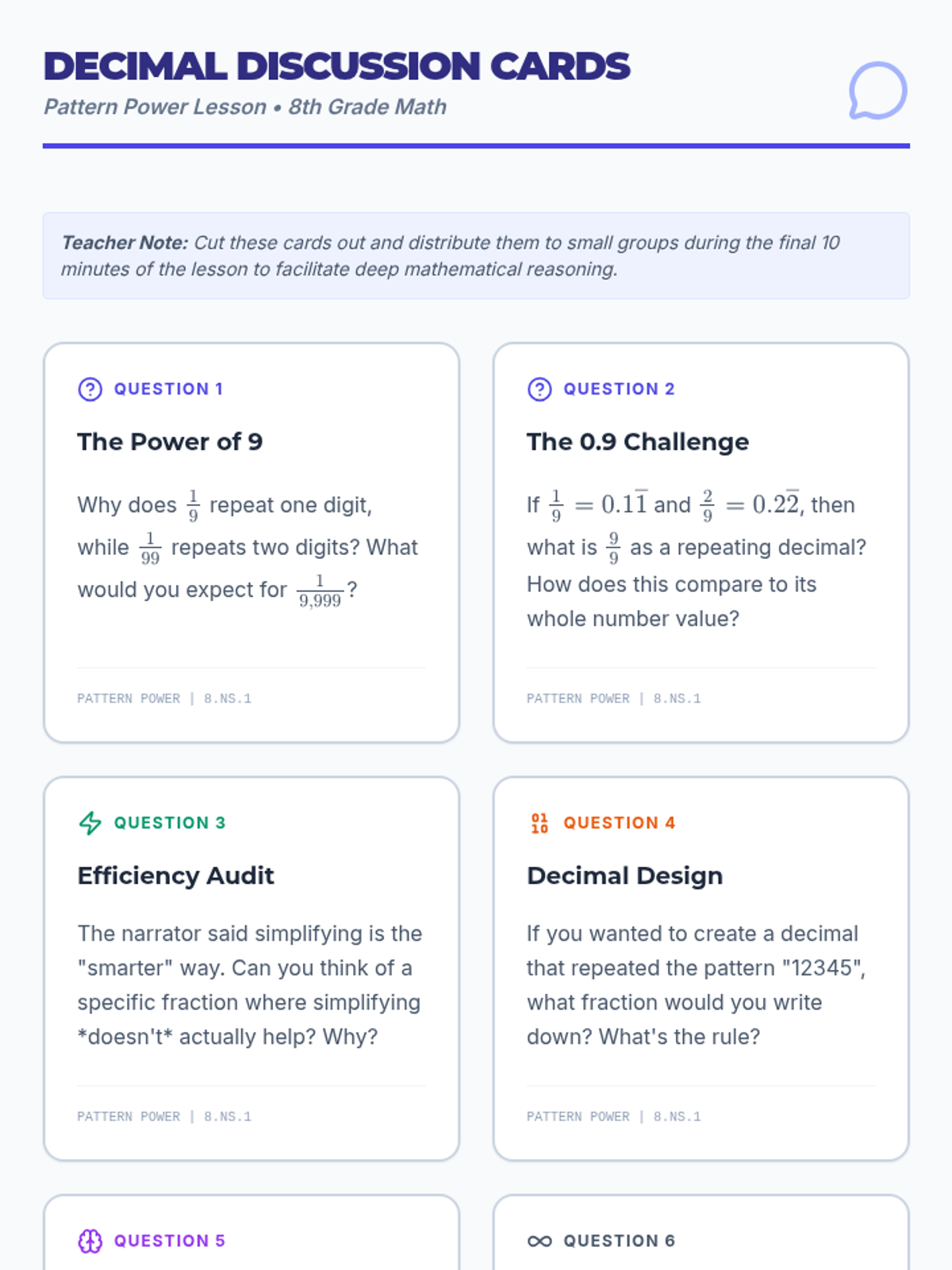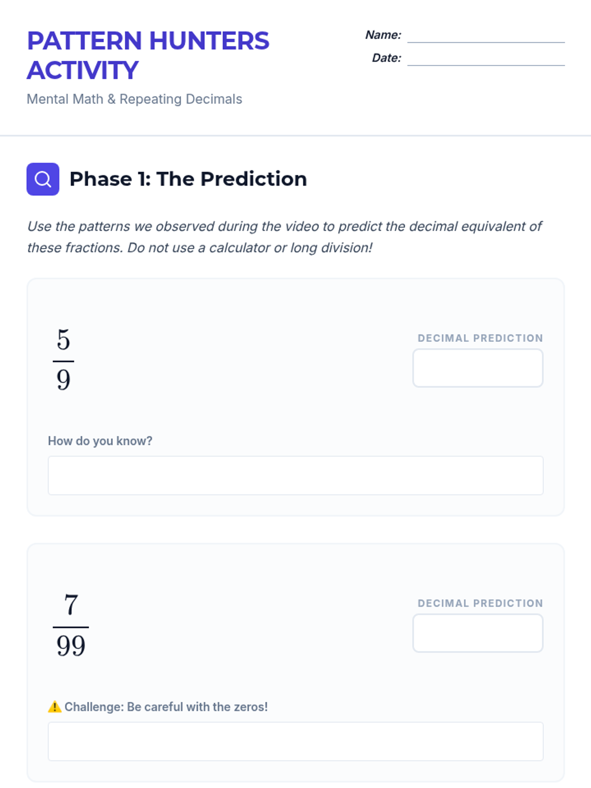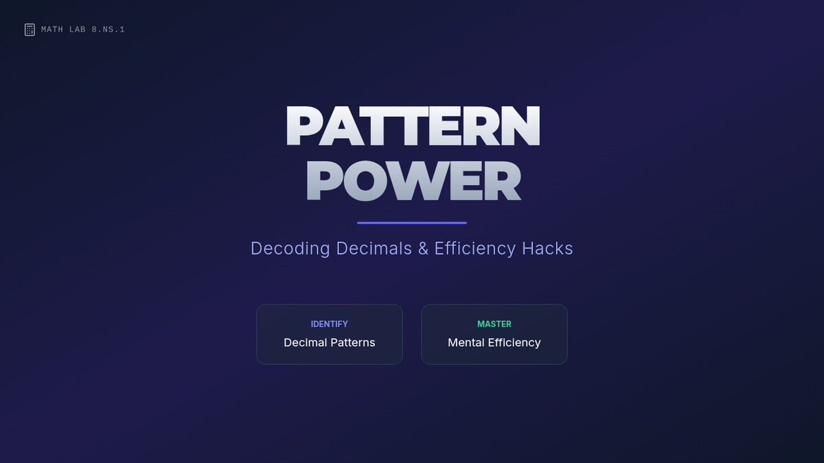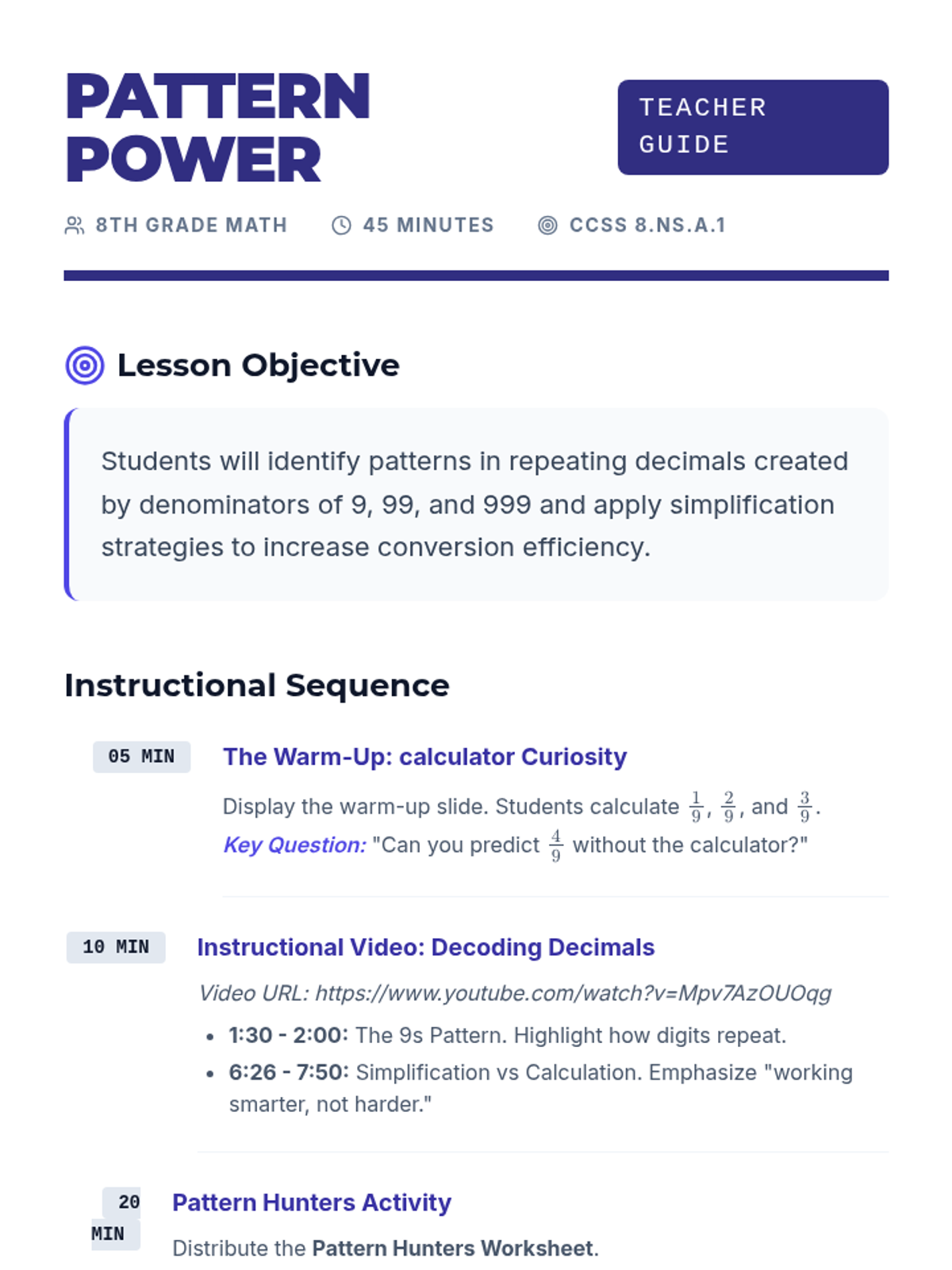 Students explore the fascinating world of repeating decimals, focusing on the patterns created by denominators of 9, 99, and 999. They also learn to increase mental math efficiency by simplifying fractions before converting them to decimals.