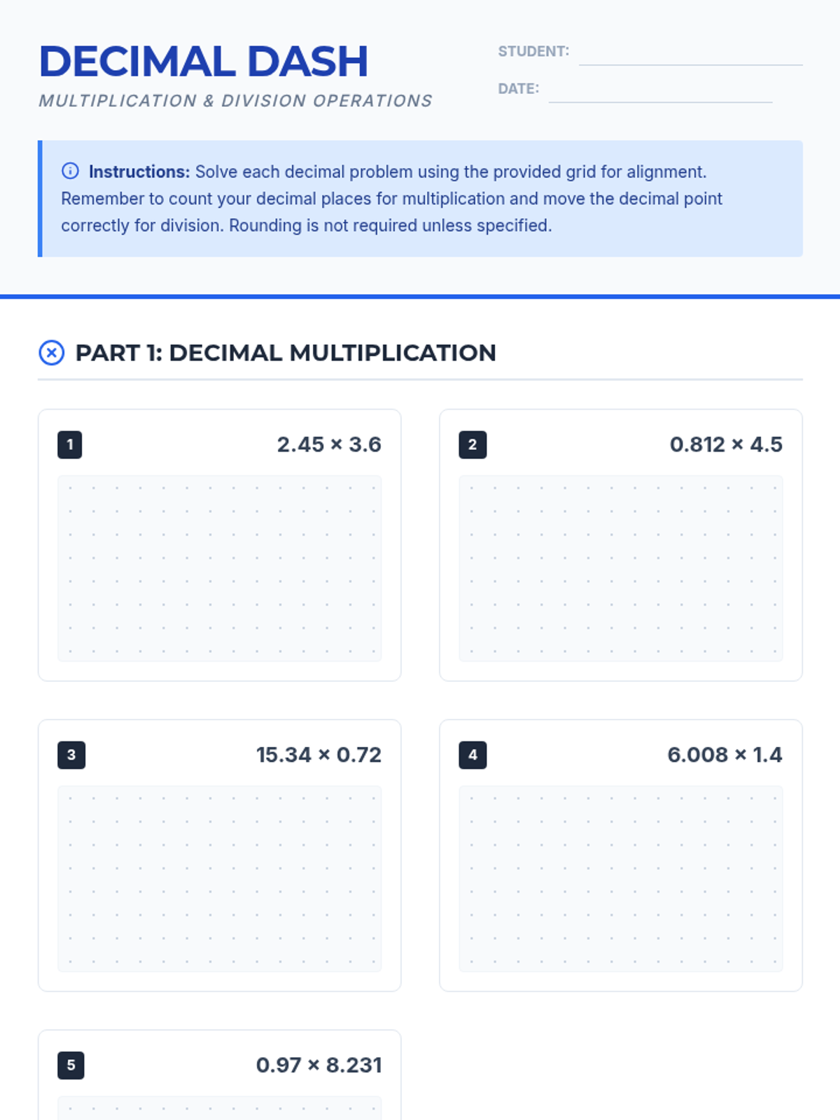 A comprehensive practice lesson focusing on multiplying and dividing decimals up to the thousandths place, featuring grid-supported work areas for precision.