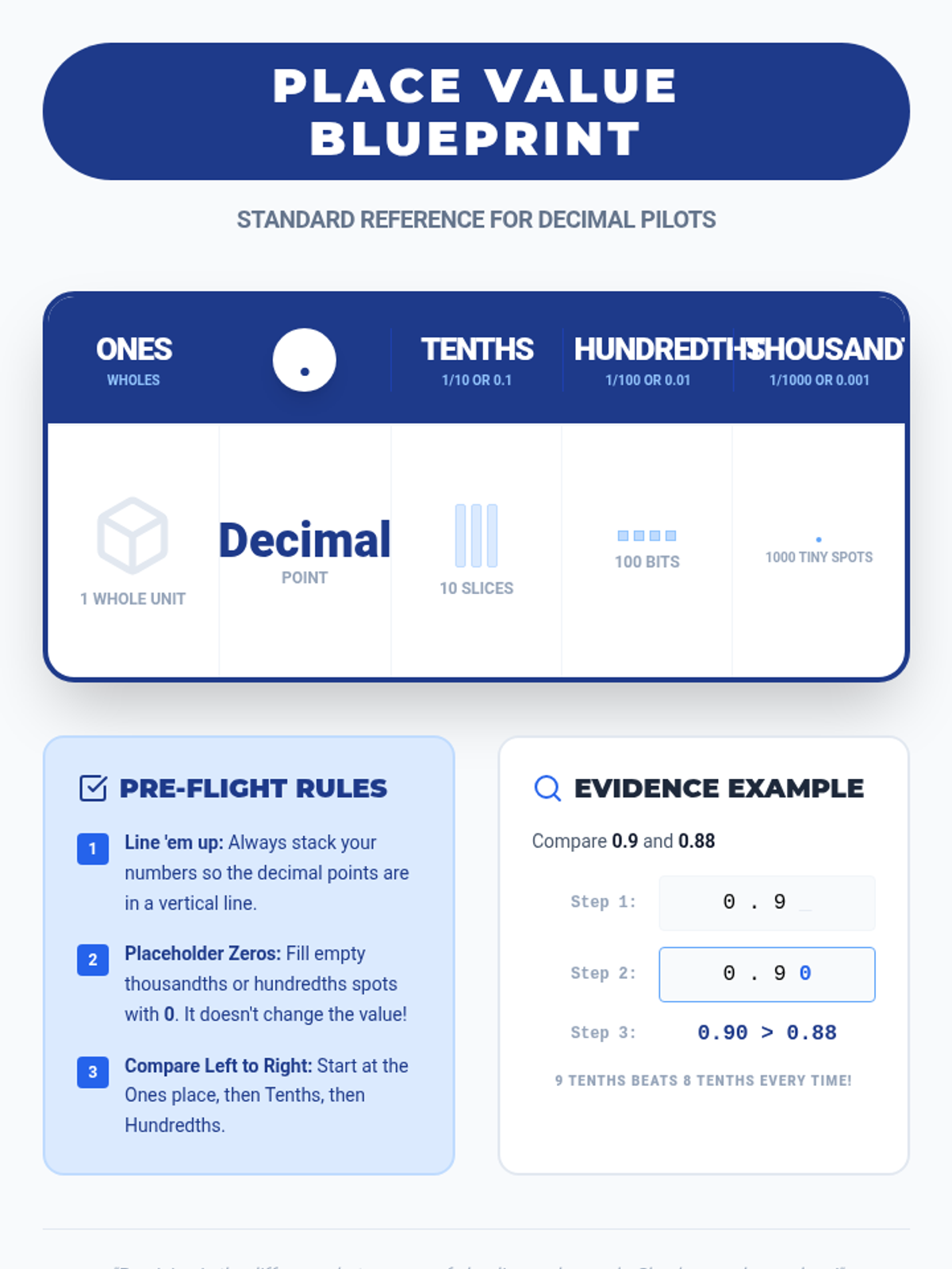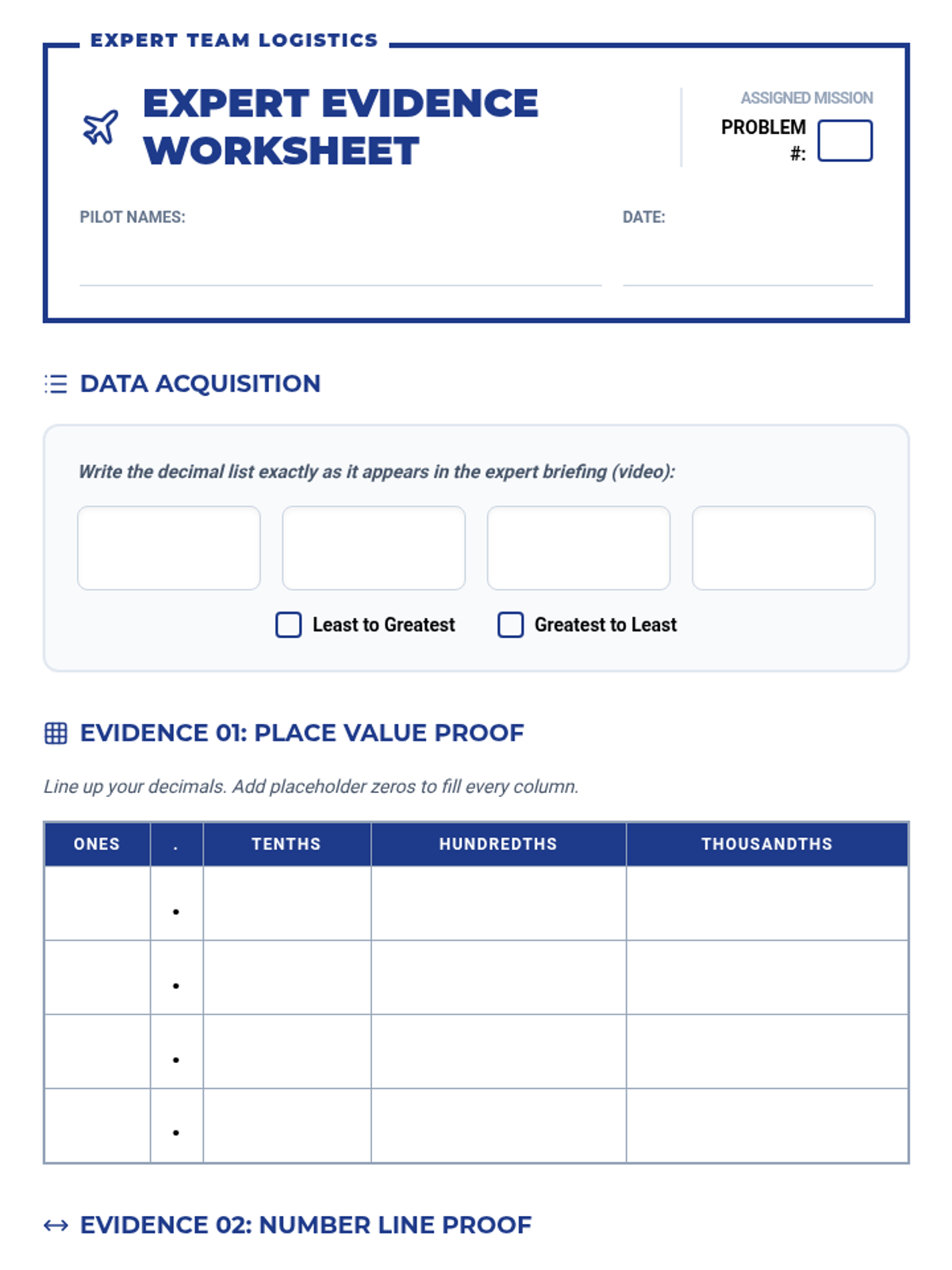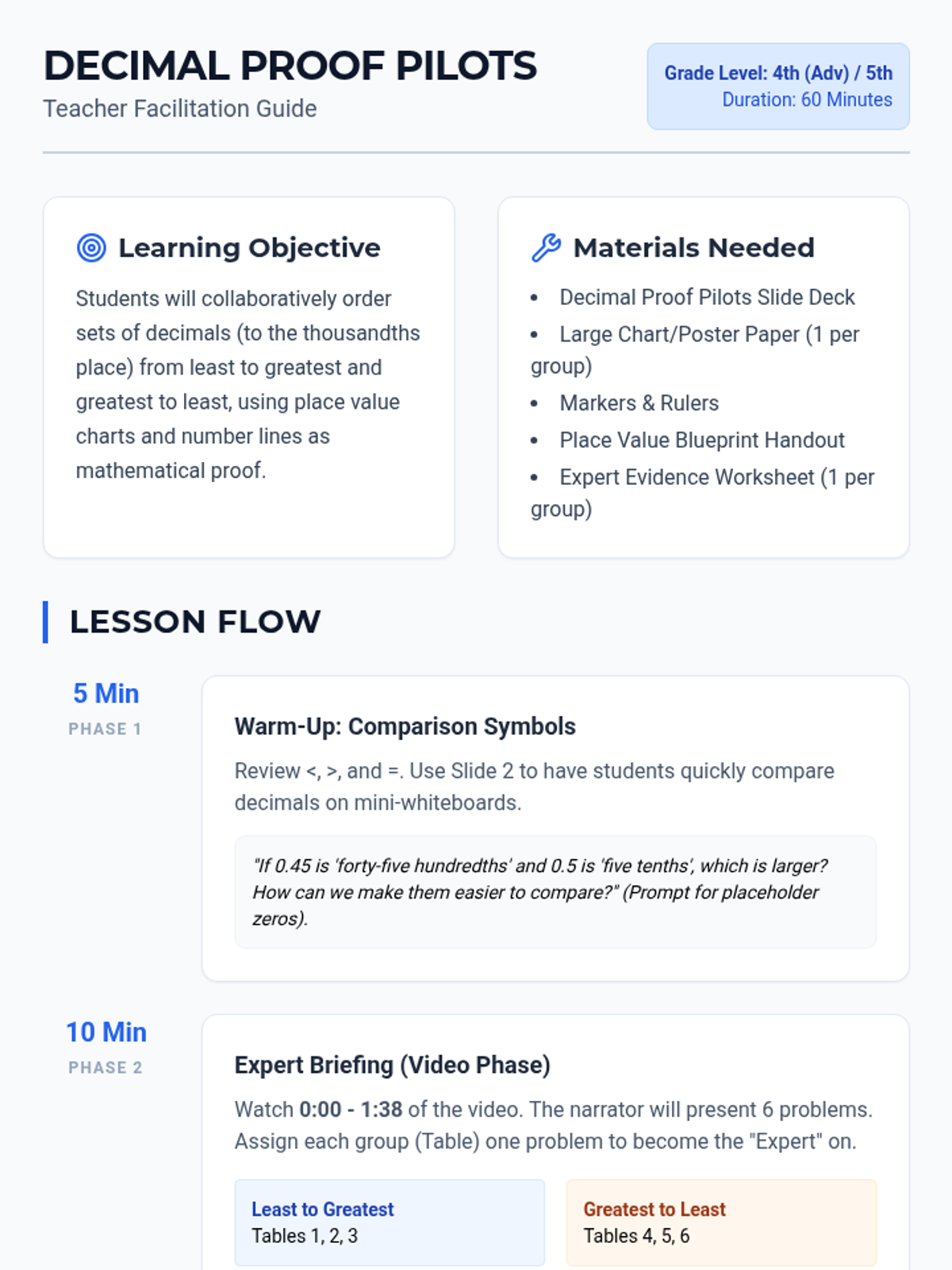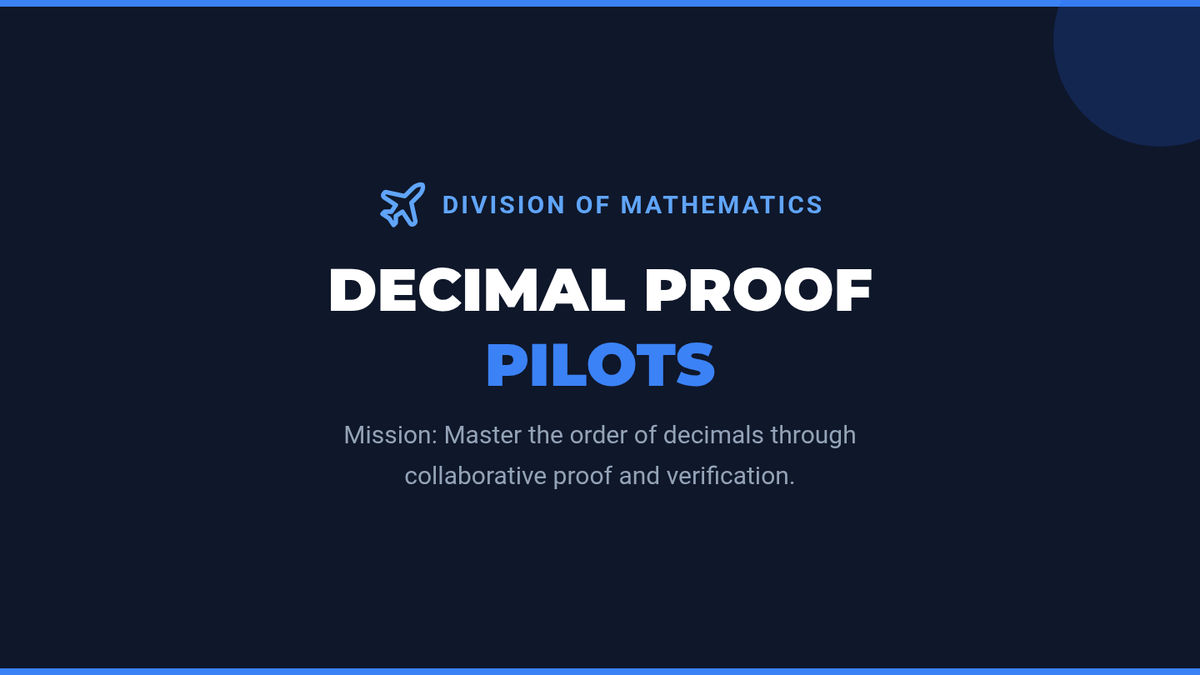 An interactive math lesson where students become 'Expert Proof Pilots' to master ordering decimals. They collaborate in groups to solve complex decimal problems, create visual proofs using place value charts and number lines, and verify their findings against a guided video mastery check.