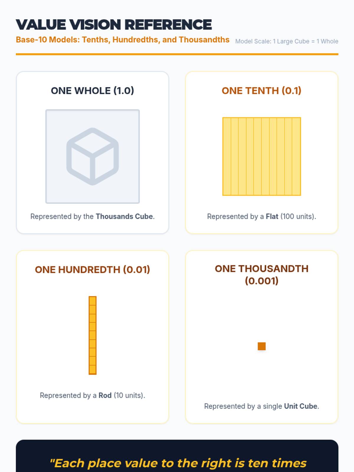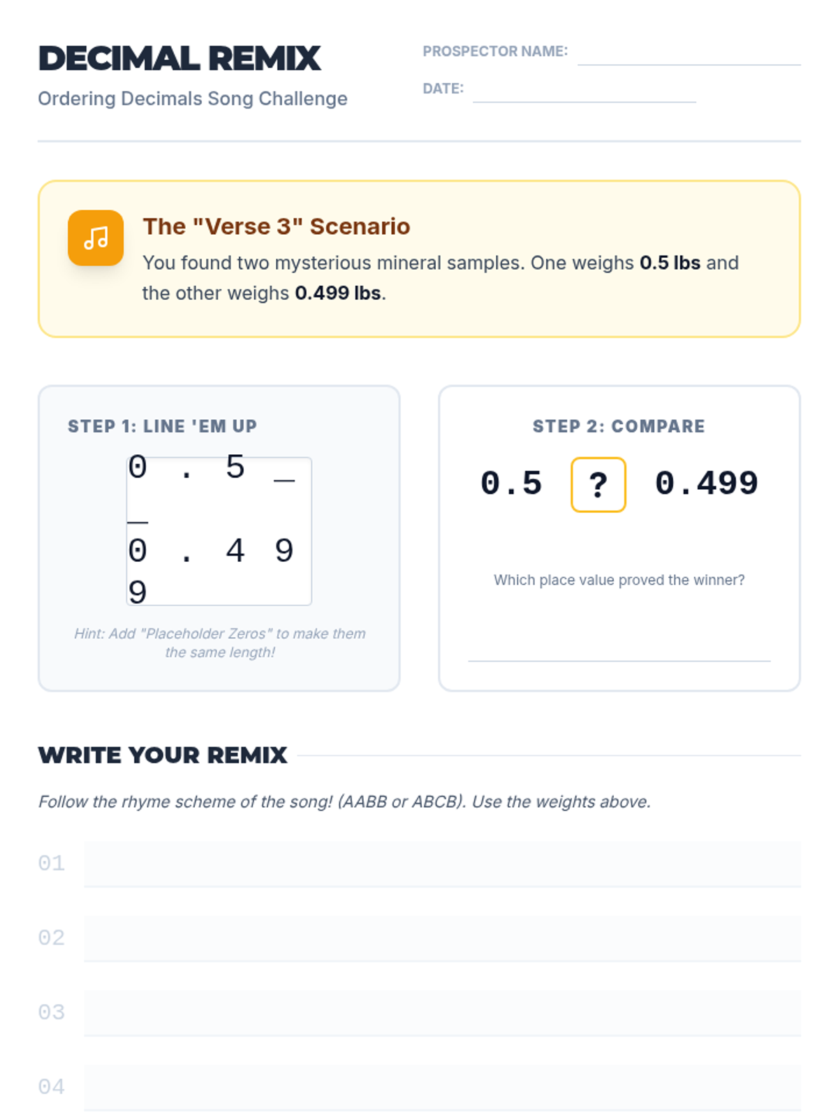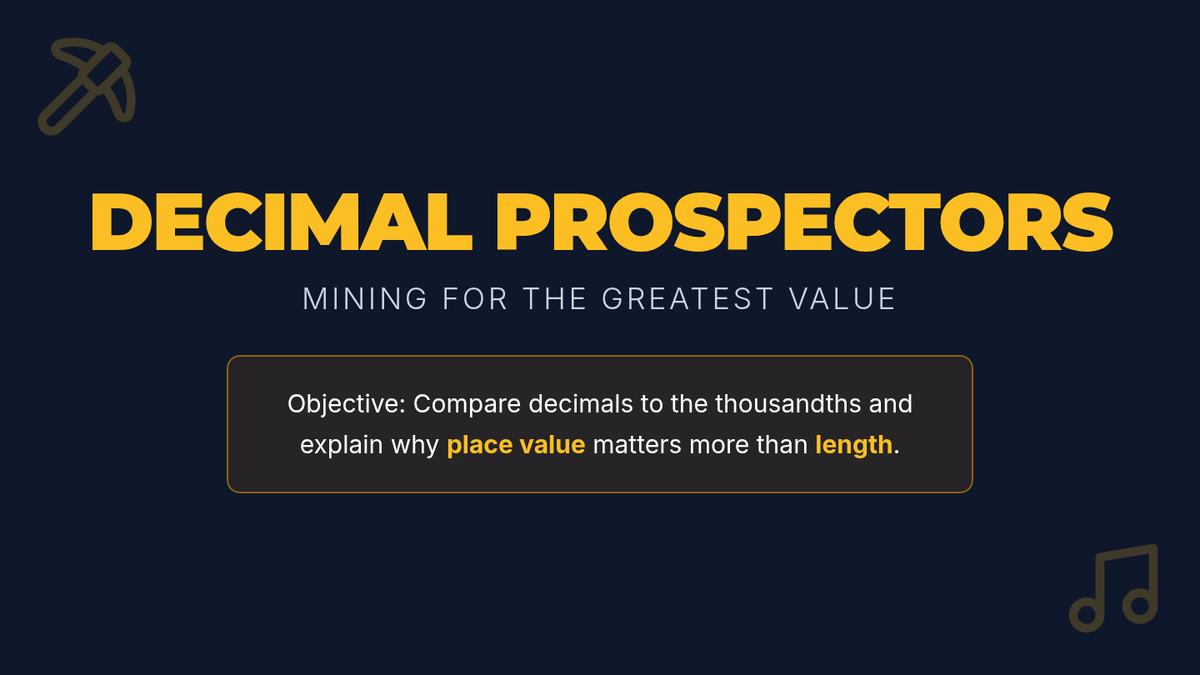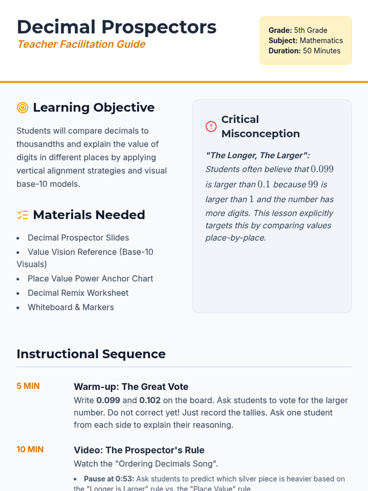 A 5th-grade math lesson focused on comparing decimals to the thousandths place, using music and visual models to overcome the 'longer is larger' misconception.