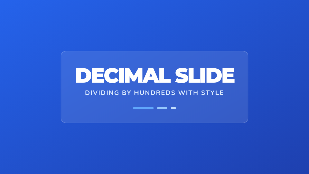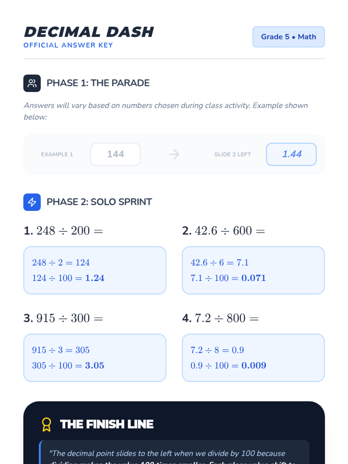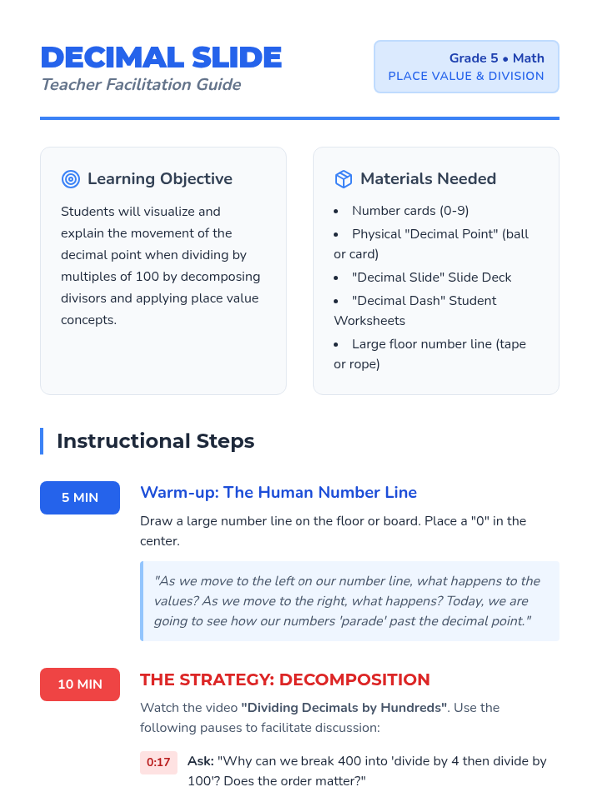 A 5th-grade math lesson focused on dividing decimals by multiples of 100 using decomposition and place value visualization. Students use physical movement and mathematical decomposition to understand why the decimal point shifts when dividing.