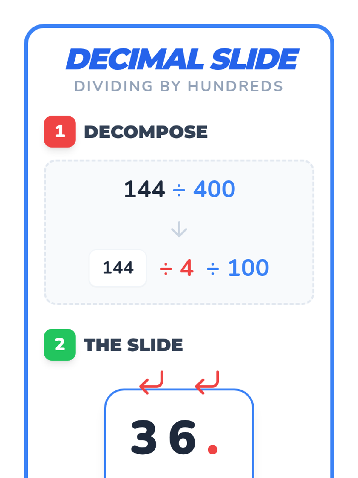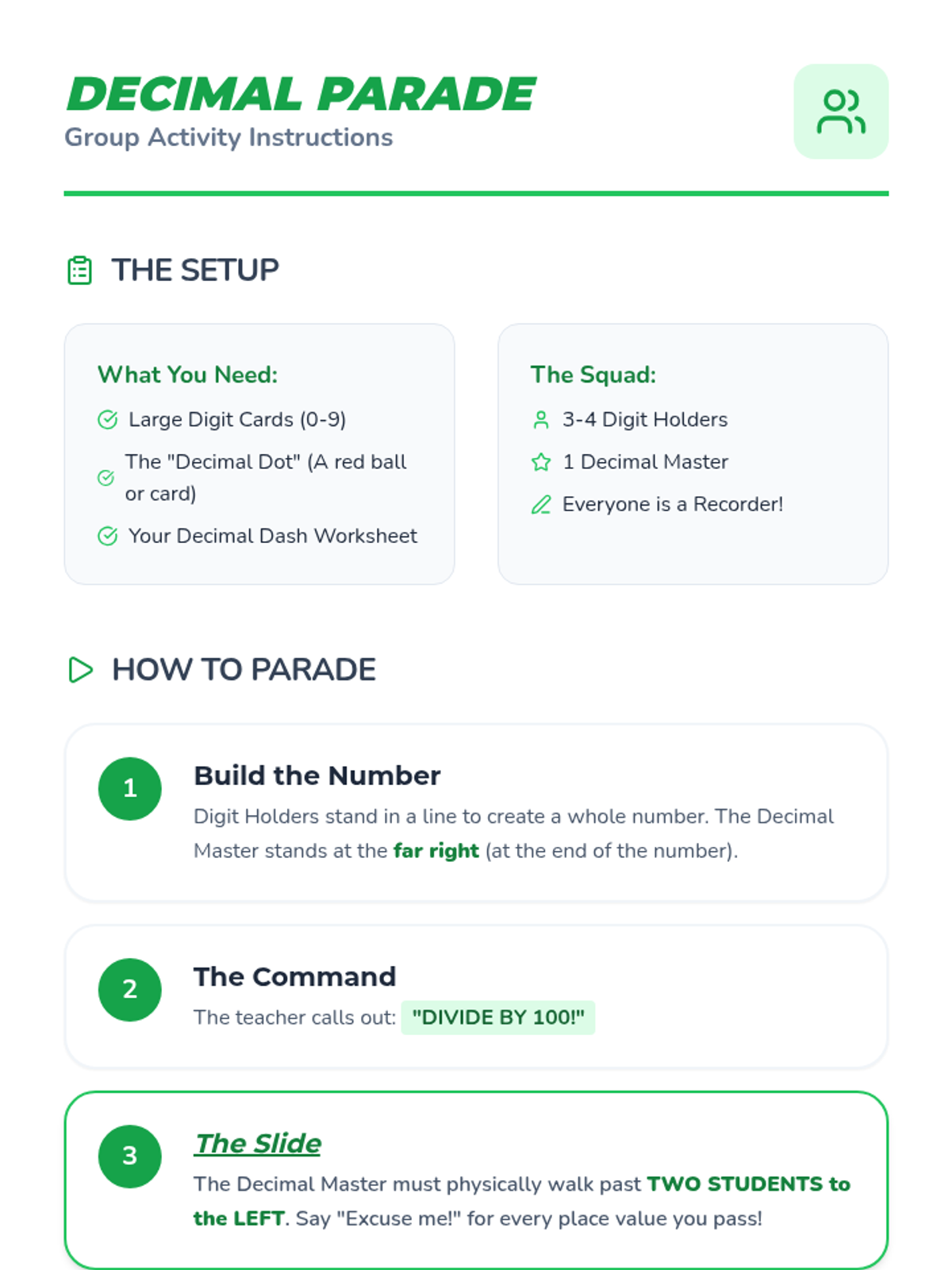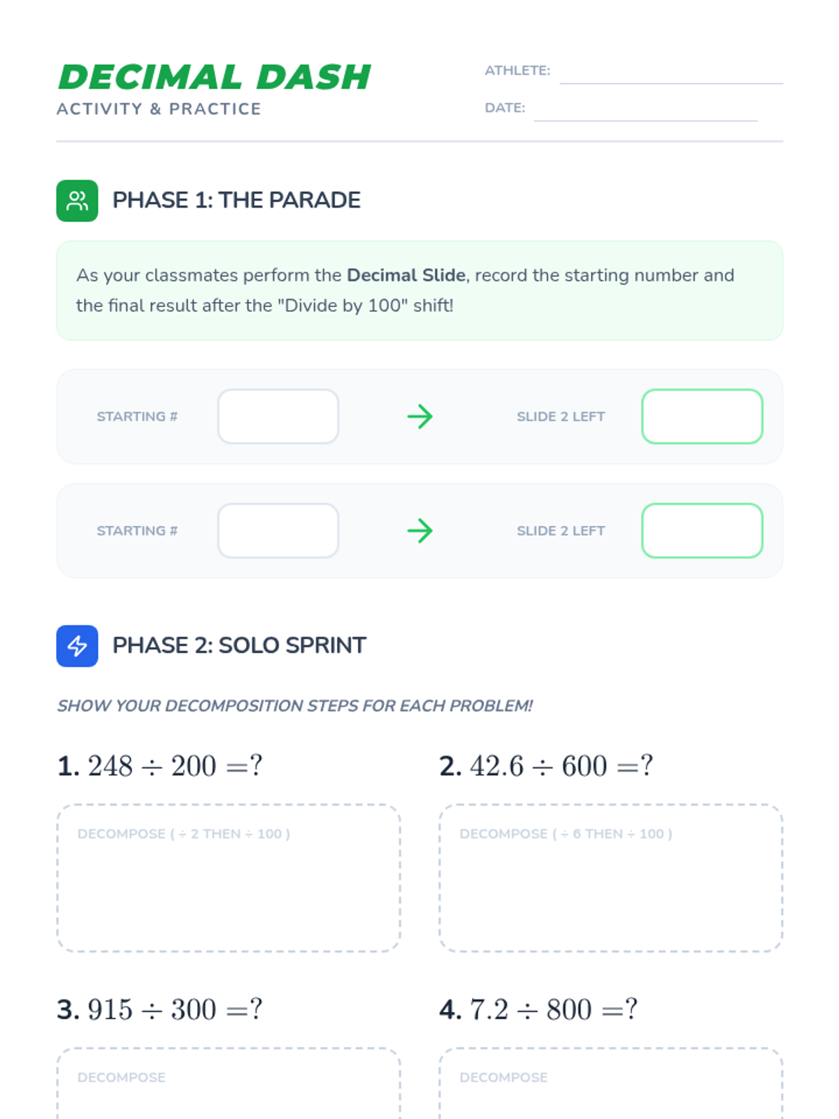 A 5th-grade math lesson focused on dividing decimals by multiples of 100 using decomposition and place value visualization. Students use physical movement and mathematical decomposition to understand why the decimal point shifts when dividing.